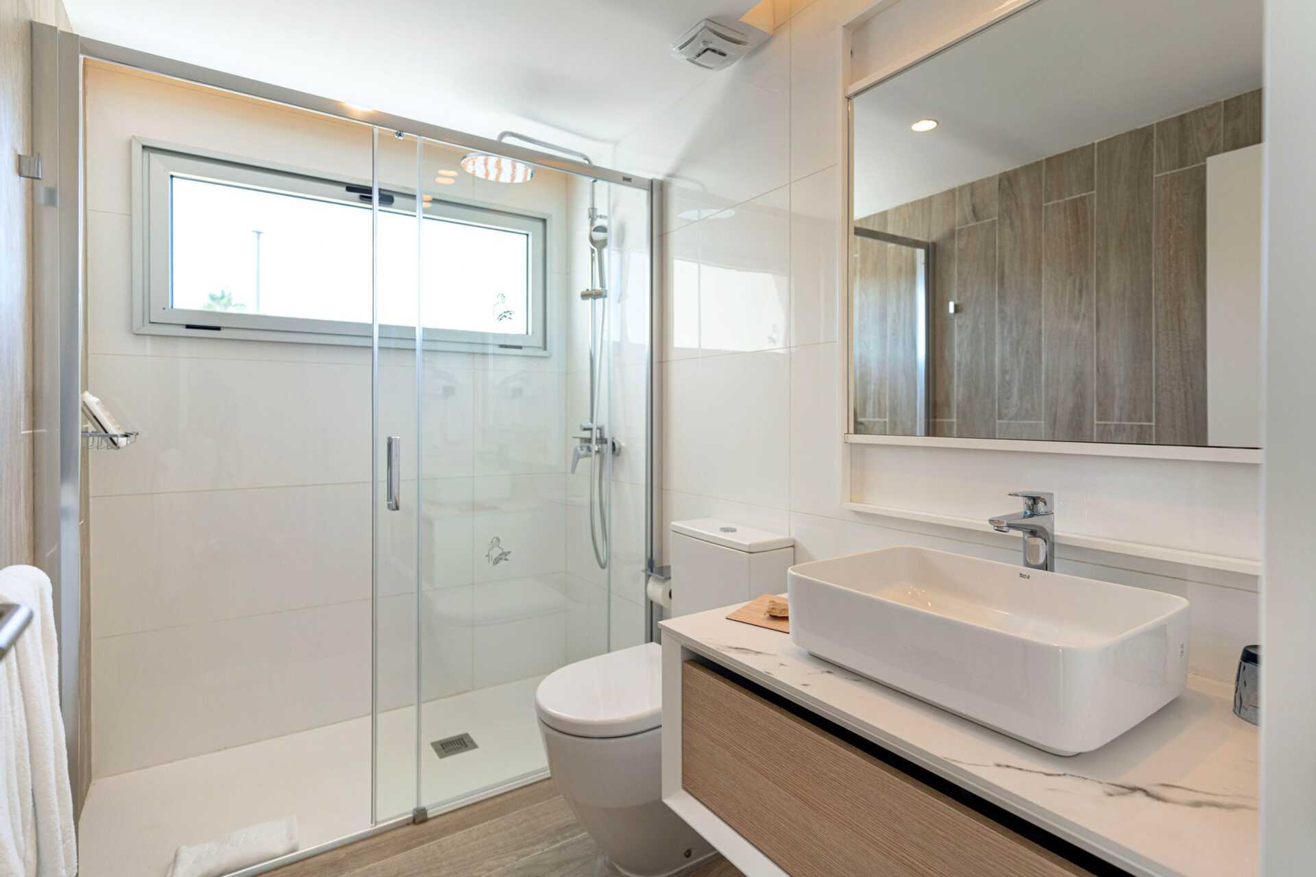 Kolmio maaterassilla ja oma uima-allas. Terassilla on tuoleja ja pöytiä, ruokapöytiä ja aurinkotuoleja. Altaat lämmitetään talvella 22 asteeseen. Altaan lämpötila voi kuitenkin laskea muutaman asteen aamuisin, iltaisin ja huonolla säällä. Kaksi makuuhuonetta ja yhdistetty olohuone ja minikeittiö. Kaksi erillistä sänkyä molemmissa makuuhuoneissa. Lisävuodemahdollisuus vuodesohvasta. Minikeittiö, jossa jääkaappi, pakastin, mikroaaltouuni, astianpesukone, leivänpaahdin, kahvinkeitin, vedenkeitin, munankeitin ja yksinkertaiset keittiövälineet. Maksuton wifi, ilmastointi ja tallelokero. Tv kansainvälisillä kanavilla. Kylpytakit. Allaspyyhkeet. Hiustenkuivain. Kaksi kylpyhuonetta suihkulla. Siivous 7 krt/viikko.
