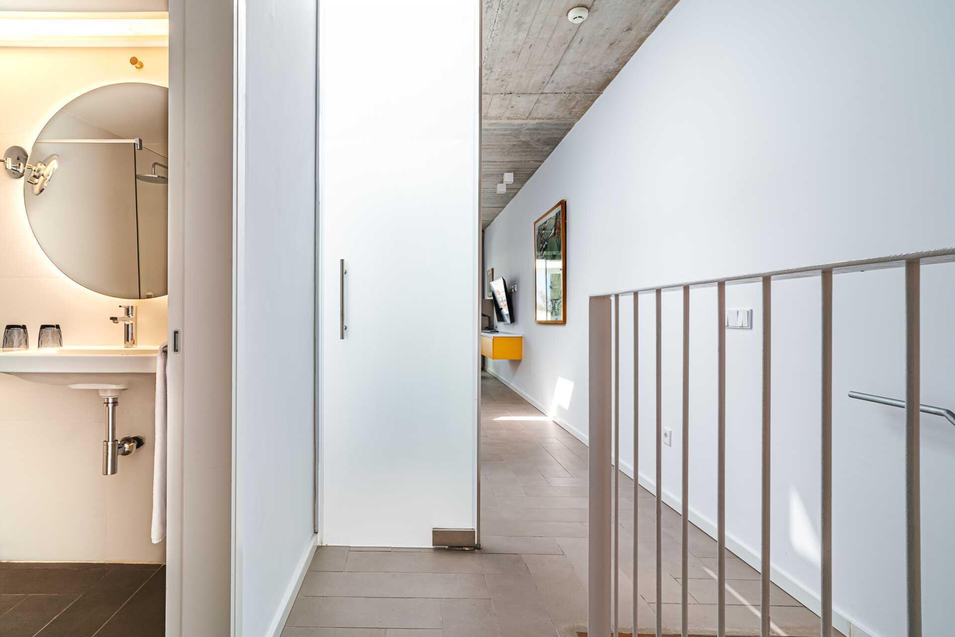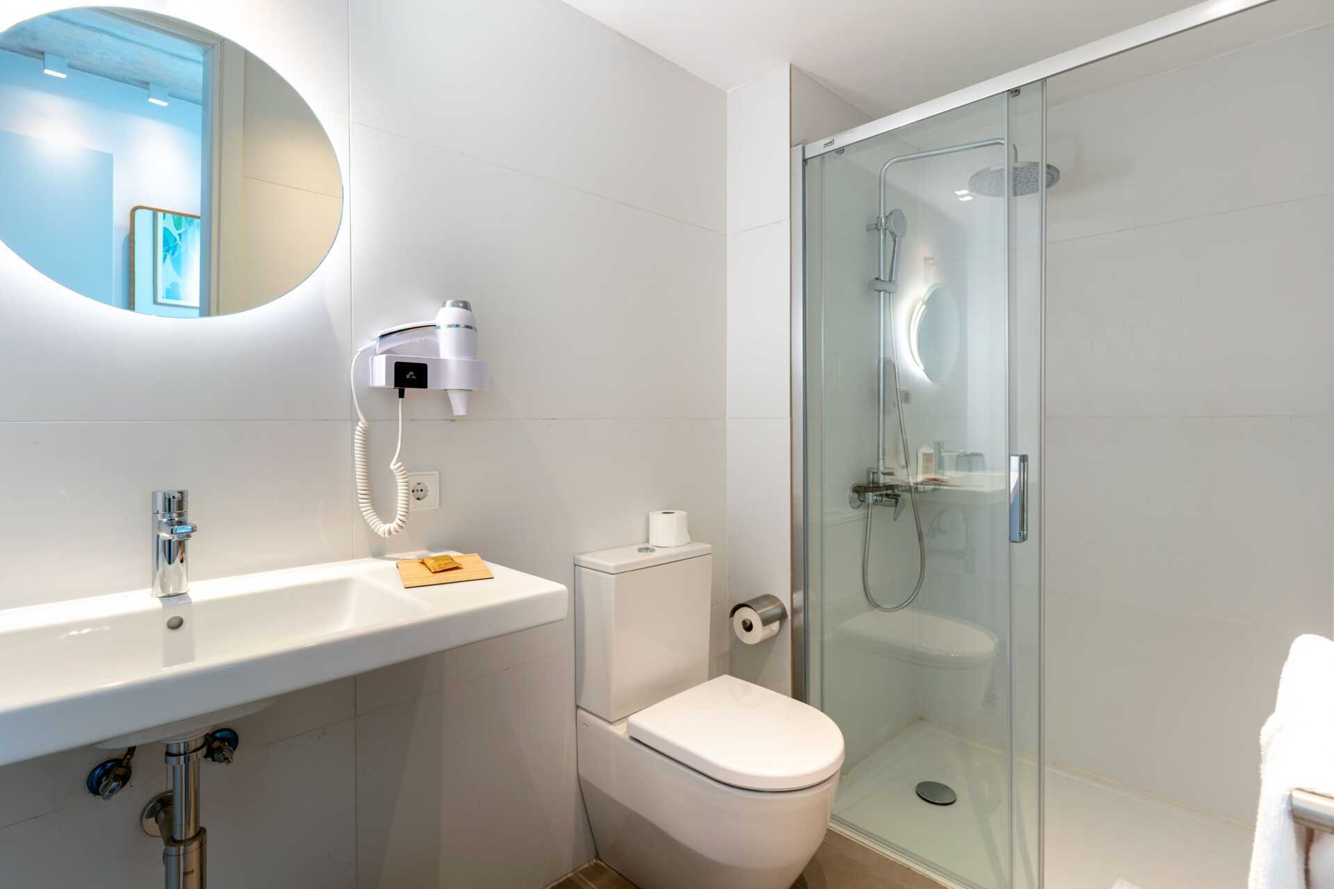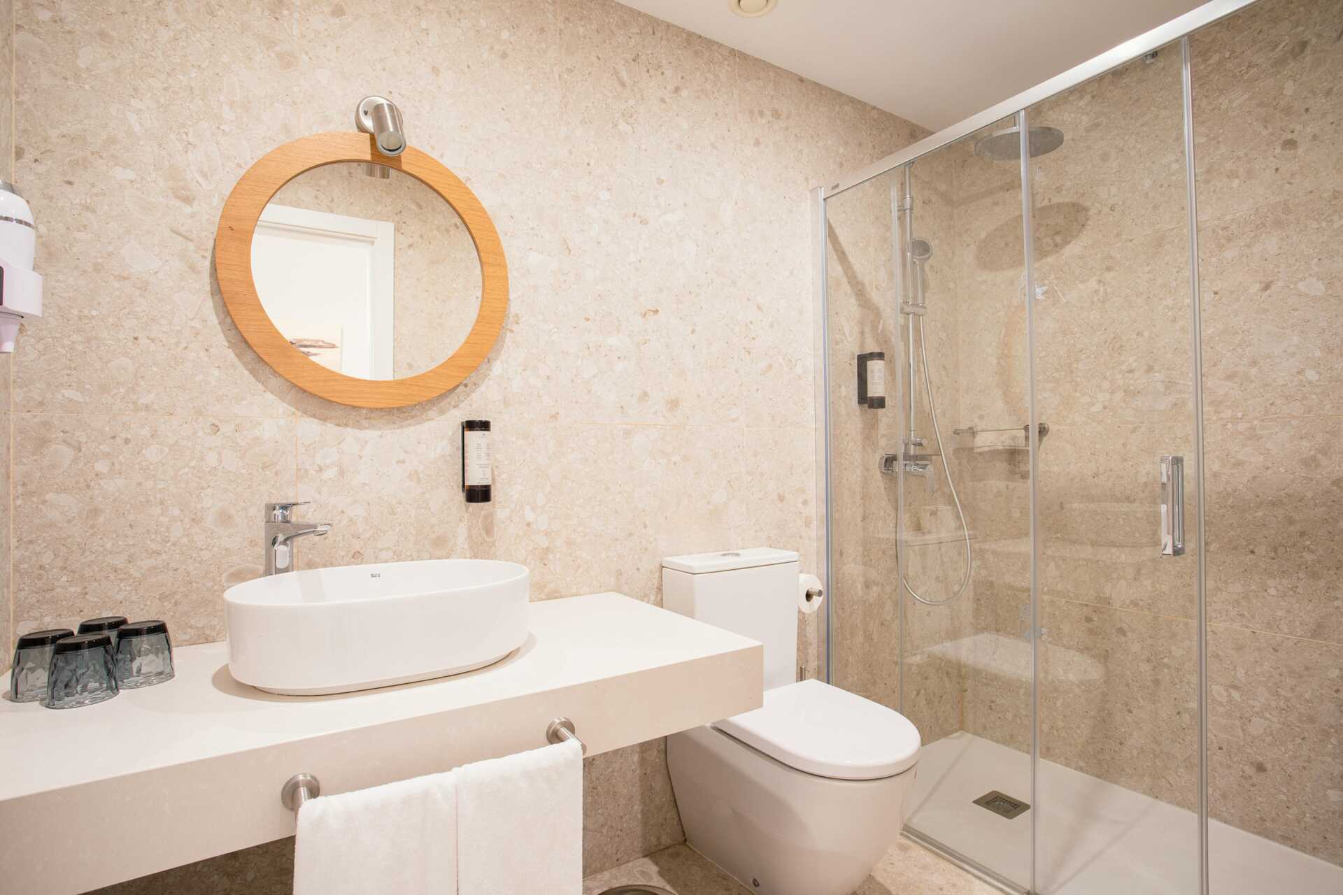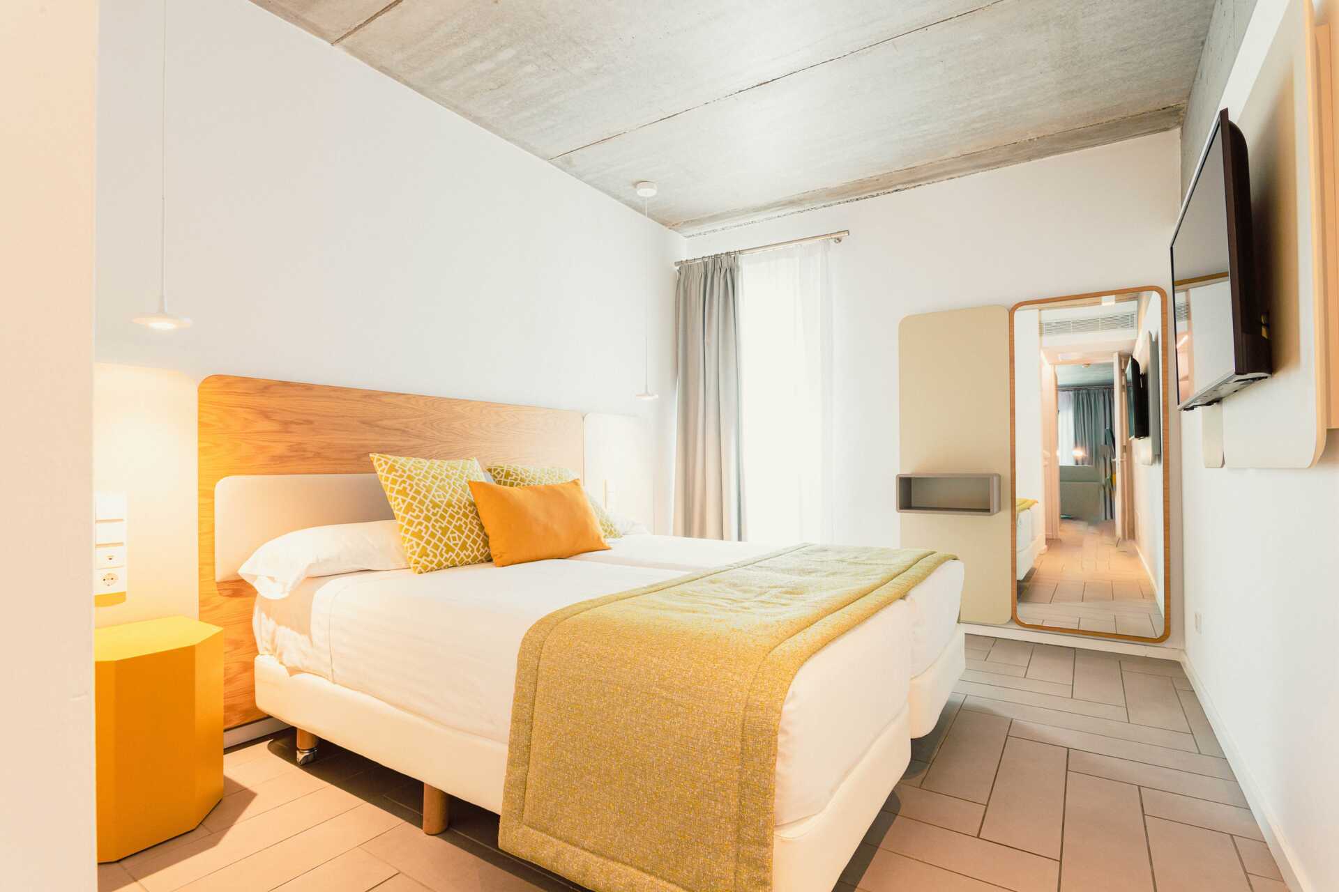 Kaksikerroksinen kolmio, jossa maaterassi. Joissakin asunnoissa on maaterassi pöydällä, tuoleilla ja aurinkotuoleilla ja joissakin asunnoissa maaterassi pöydällä ja tuoleilla sekä kattoterassi aurinkotuoleilla. Huoneistot voivat sijaita päärakennuksessa tai erillisessä rakennuksessa. Kaksi makuuhuonetta ja yhdistetty olohuone sekä minikeittiö. Sisääntulokerroksessa on makuuhuone, jossa kaksi erillistä sänkyä. Mahdollisuus lisävuoteisiin vuodesohvilla ja minikeittiösaarekkeella, jossa jääkaappi, pakastin, mikroaaltouuni, keraaminen liesi, astianpesukone, leivänpaahdin, kahvinkeitin, vedenkeitin, mehupuristin, kananmunankeitin ja yksinkertaiset keittiövälineet. Pesukone ja kuivausrumpu sekä kylpyhuone hiustenkuivaajalla, suihku ja wc. Yksi kerros ylös tai yksi kerros alas - riippuen siitä, missä huoneistot sijaitsevat. Makuuhuone kahdella yhden hengen vuoteella ja kylpyhuone, jossa on hiustenkuivaaja, suihku ja wc. Maksuton wifi, ilmastointi ja tallelokero. Kylpytakit ja allaspyyhkeet. Siivous 7 krt/viikko.