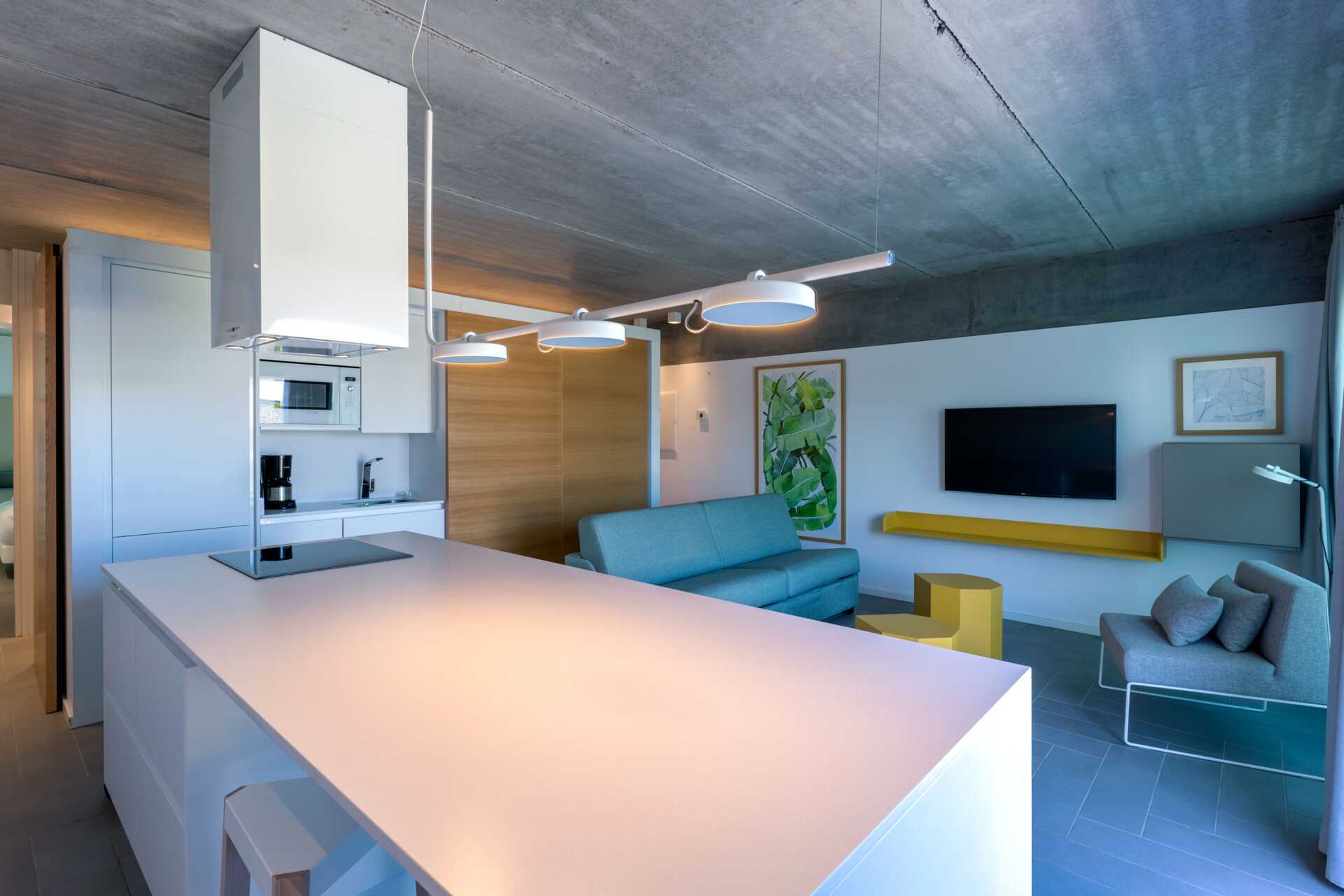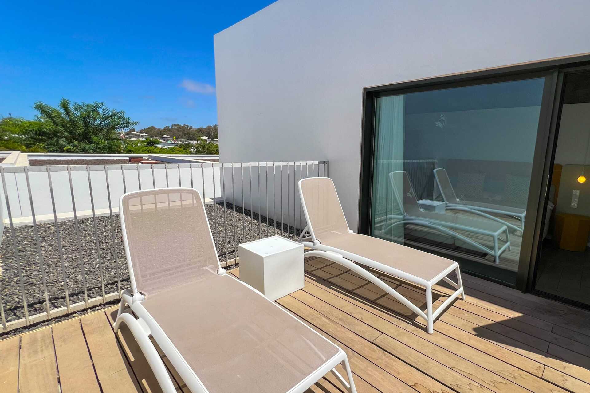 Neljän huoneen huoneisto merinäköalalla, oma uima-allas maaterassilla ja parhaalla paikalla hotellin sisällä - lähellä merta. Altaat lämmitetään talvella 22 asteeseen. Altaan lämpötila voi kuitenkin laskea muutaman asteen aamuisin, iltaisin ja huonolla säällä. Terassilla on lounge-sohvia, ruokailutila ja aurinkotuoleja. Makuuhuone sekä yhdistetty olohuone ja minikeittiö. Kaksi erillistä sänkyä molemmissa makuuhuoneissa. Lisävuodemahdollisuus vuodesohvasta. Minikeittiö, jossa jääkaappi, pakastin, mikroaaltouuni, astianpesukone, leivänpaahdin, kahvinkeitin, vedenkeitin, munankeitin ja yksinkertaiset keittiövälineet. Maksuton wifi, ilmastointi ja tallelokero. Tv kansainvälisillä kanavilla. Kylpytakit. Allaspyyhkeet. Hiustenkuivain. Kaksi kylpyhuonetta suihkulla ja wc, joista toisessa on kylpyamme. Siivous 7 krt/viikko.