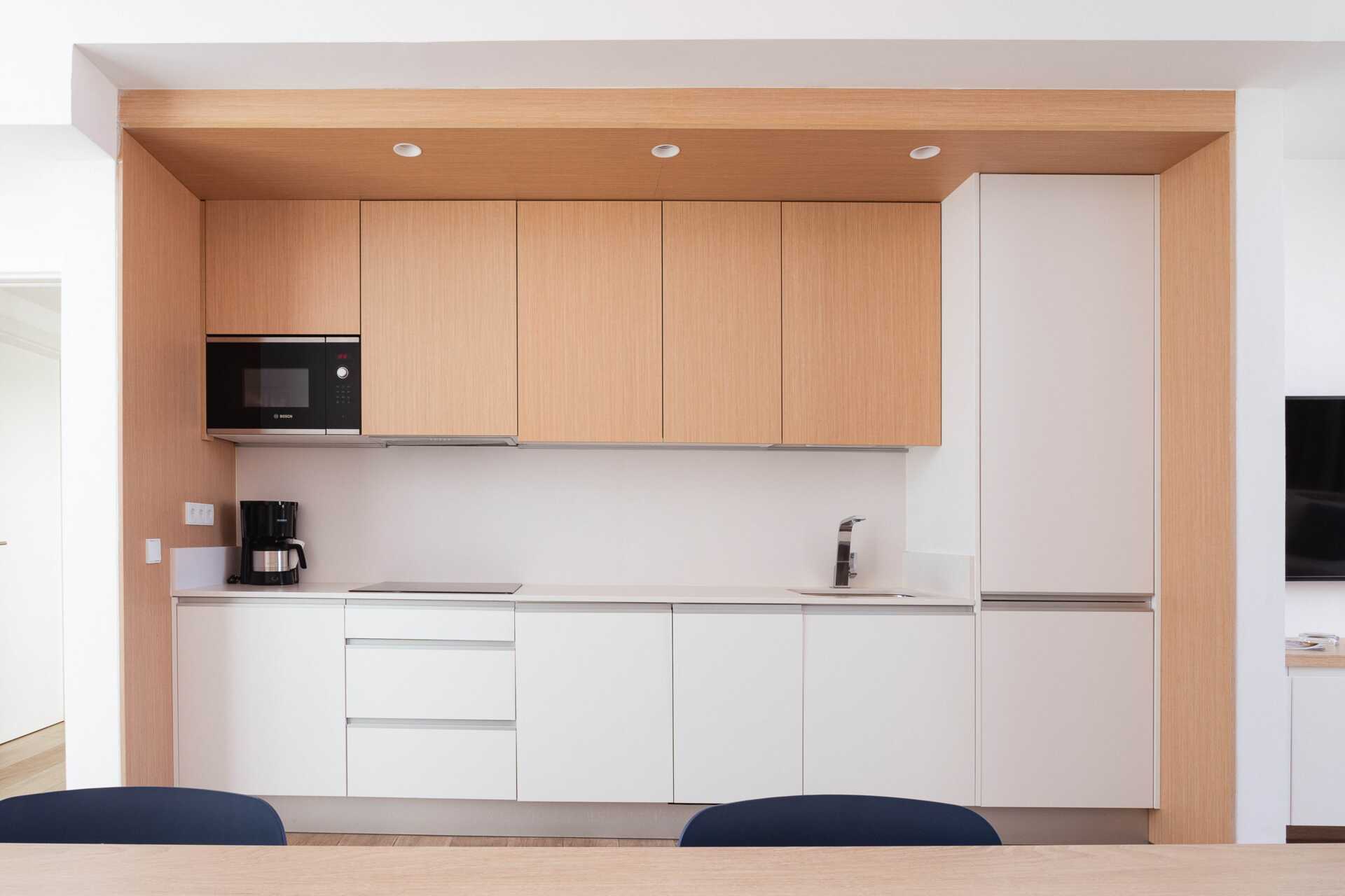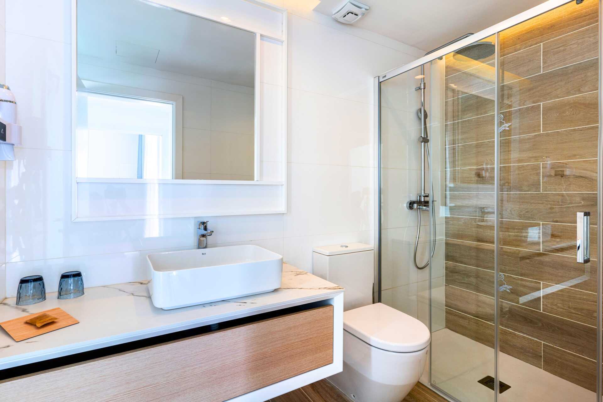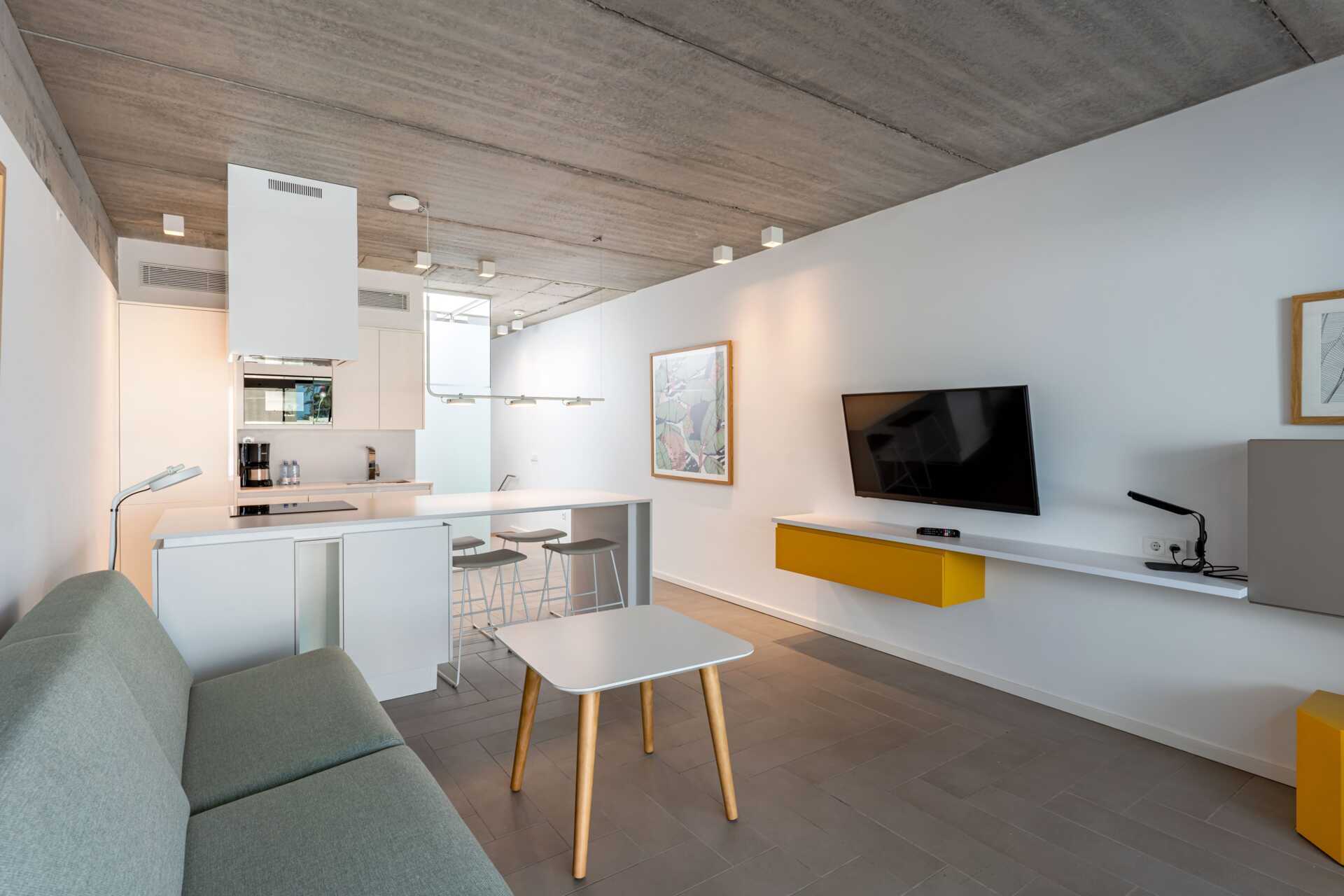 Kolmio pohjaterassilla. Huoneistot sijaitsevat päärakennuksessa. Kaksi makuuhuonetta ja yhdistetty olohuone sekä minikeittiö. Kaksi erillistä sänkyä molemmissa makuuhuoneissa. Minikeittiö, jossa jääkaappi, pakastin, mikroaaltouuni, astianpesukone, leivänpaahdin, kahvinkeitin, vedenkeitin, munankeitin ja yksinkertaiset keittiövälineet. Maksuton wifi, ilmastointi ja tallelokero. Tv kansainvälisillä kanavilla. Kylpytakit. Allaspyyhkeet. Hiustenkuivain. Kylpyhuoneessa suihku ja wc. Siivous 7 krt/viikko.