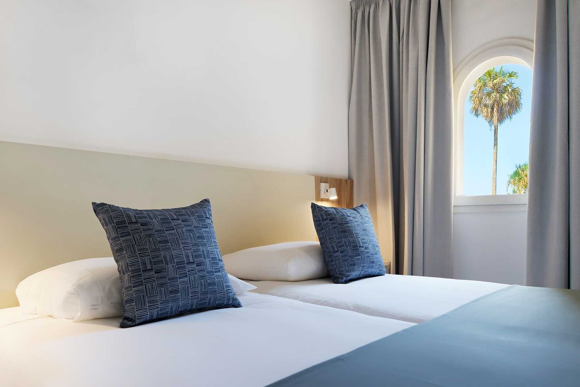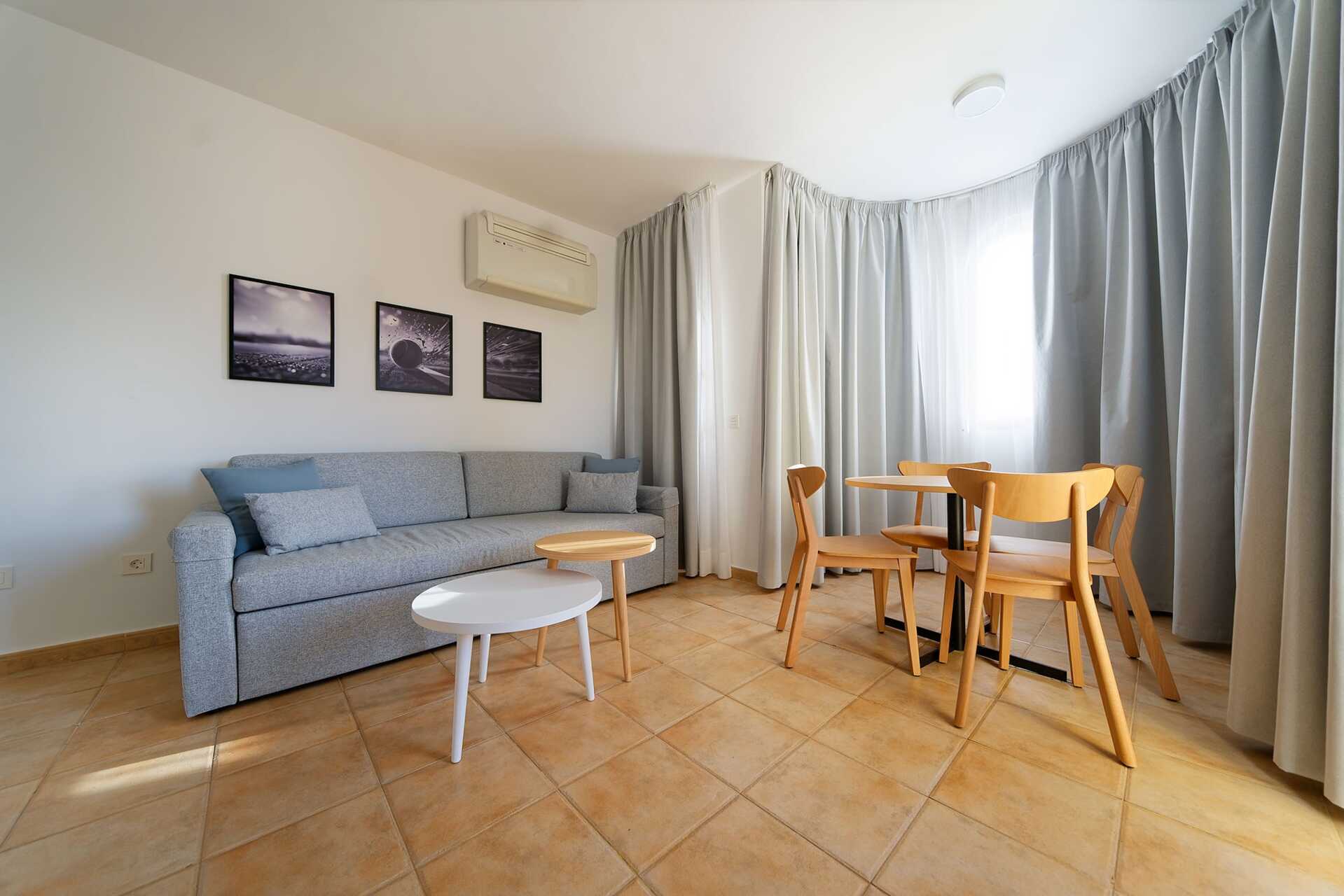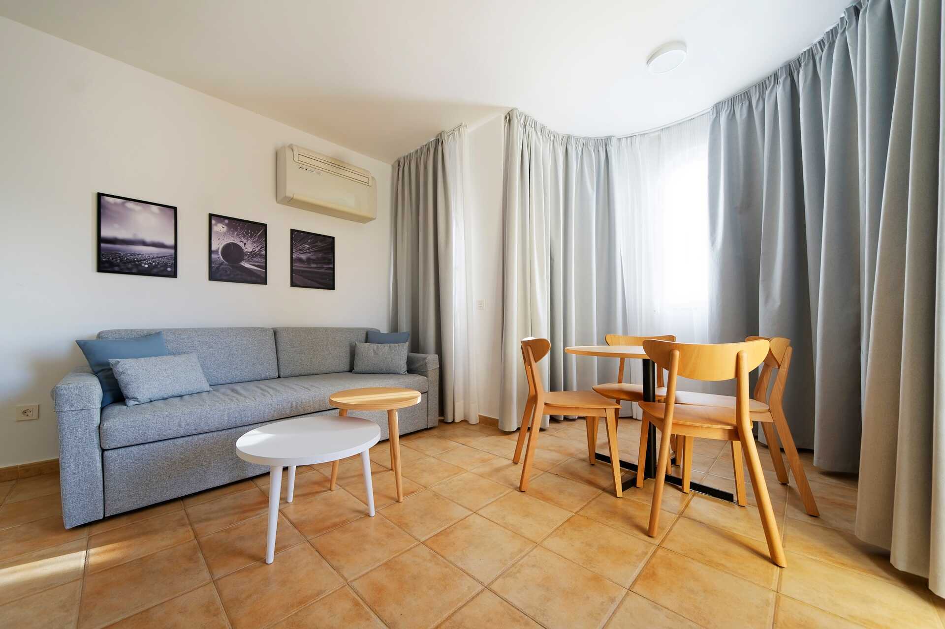 Kaksio parvekkeella tai isolla parvekkeella. Makuuhuone sekä yhdistetty olohuone ja minikeittiö. Kaksi yhden hengen sänkyä. Lisävuodemahdollisuus vuodesohvasta tai kokoontaitettavassa vuoteesta. Minikeittiö, jossa keittolevyt, jääkaappi, kahvinkeitin, leivänpaahdin, mikro ja yksinkertainen keittiövarustus. Maksuton wifi, ilmastointi ja tallelokero. Smart-tv kansainvälisillä kanavilla. Hiustenkuivain. Kylpyhuoneessa suihku ja wc. Siivous 5 krt/viikossa (ei siivousta keskiviikkoisin ja sunnuntaisin).