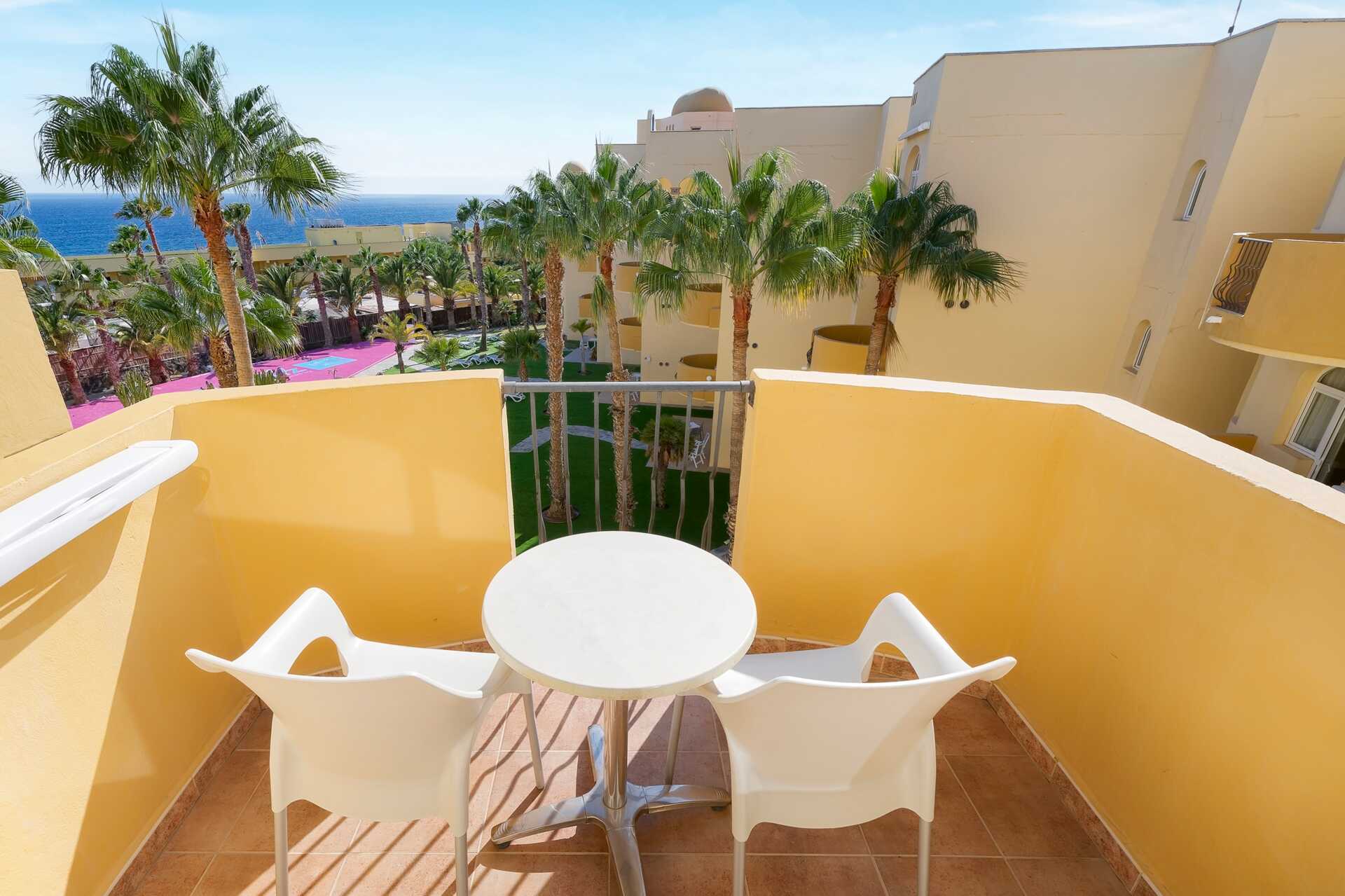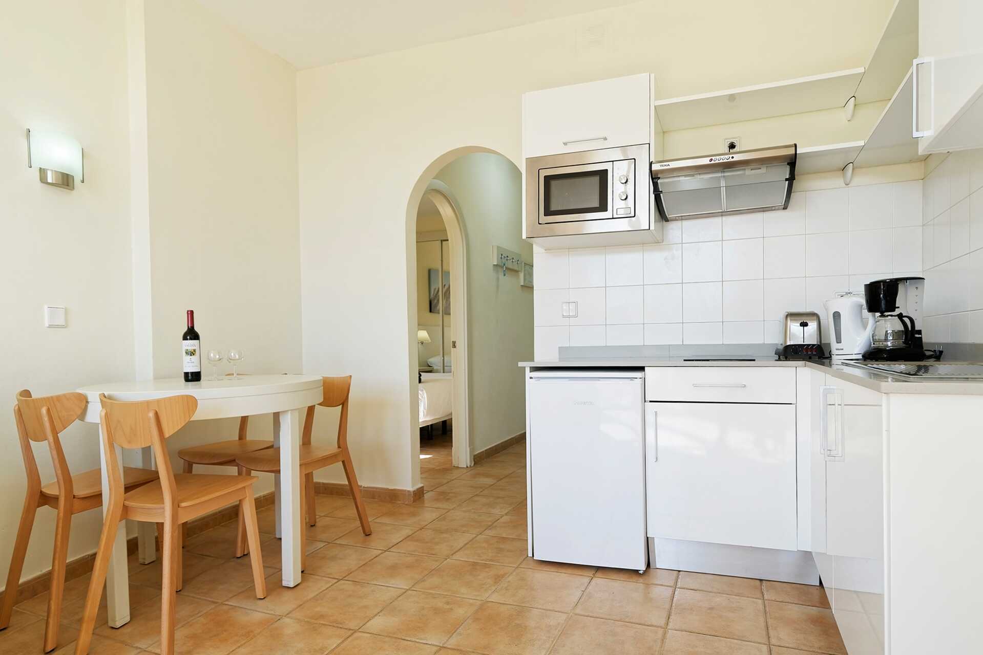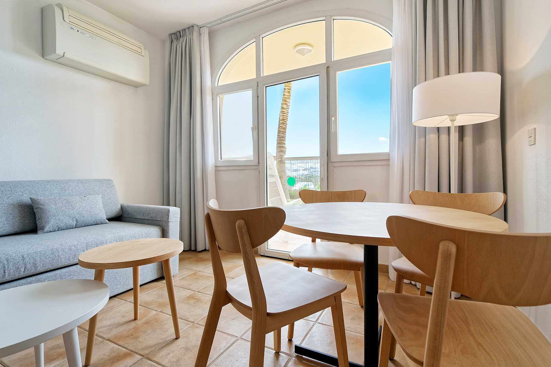 Kolmio, jossa parveke, osassa näkymä uima-altaalle tai vaihtoehtoisesti iso parveke. Kaksi makuuhuonetta ja olohuone minikeittiöllä. Kaksi yhden hengen sänkyä molemmissa makuuhuoneissa. Lisävuodemahdollisuus vuodesohvasta tai kokoontaitettavassa vuoteesta. Minikeittiö, jossa keittolevyt, jääkaappi, kahvinkeitin, leivänpaahdin, mikro ja yksinkertainen keittiövarustus. Maksuton wifi, ilmastointi ja tallelokero. Smart-tv kansainvälisillä kanavilla. Hiustenkuivain. Kylpyhuoneessa suihku ja wc. Siivous 5 krt/viikossa (ei siivousta keskiviikkoisin ja sunnuntaisin).