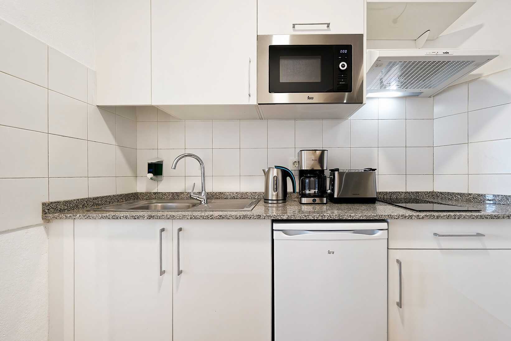 Yhden huoneen huoneisto parvekkeella tai suurella parvekkeella tai terassi pyörätelineellä. Yhdistetty makuuhuone ja minikeittiö. Kaksi yhden hengen sänkyä. Lisävuodemahdollisuus vuodesohvasta tai kokoontaitettavassa vuoteesta. Minikeittiö, jossa keittolevyt, jääkaappi, kahvinkeitin, leivänpaahdin, mikro ja yksinkertainen keittiövarustus. Maksuton wifi, ilmastointi ja tallelokero. Smart-tv kansainvälisillä kanavilla. Hiustenkuivain. Kylpyamme tai suihku ja wc. Siivous 5 krt/viikossa (ei siivousta keskiviikkoisin ja sunnuntaisin).