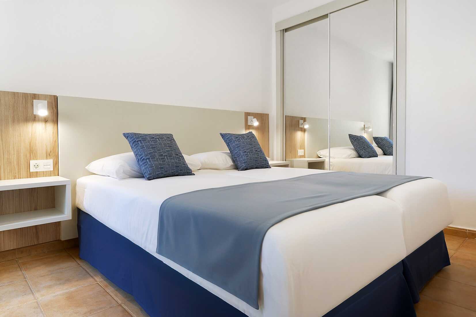 Kolmio, jossa parveke, osassa näkymä uima-altaalle tai vaihtoehtoisesti iso parveke. Kaksi makuuhuonetta ja olohuone minikeittiöllä. Kaksi yhden hengen sänkyä molemmissa makuuhuoneissa. Lisävuodemahdollisuus vuodesohvasta tai kokoontaitettavassa vuoteesta. Minikeittiö, jossa keittolevyt, jääkaappi, kahvinkeitin, leivänpaahdin, mikro ja yksinkertainen keittiövarustus. Maksuton wifi, ilmastointi ja tallelokero. Smart-tv kansainvälisillä kanavilla. Hiustenkuivain. Kylpyhuoneessa suihku ja wc. Siivous 5 krt/viikossa (ei siivousta keskiviikkoisin ja sunnuntaisin).