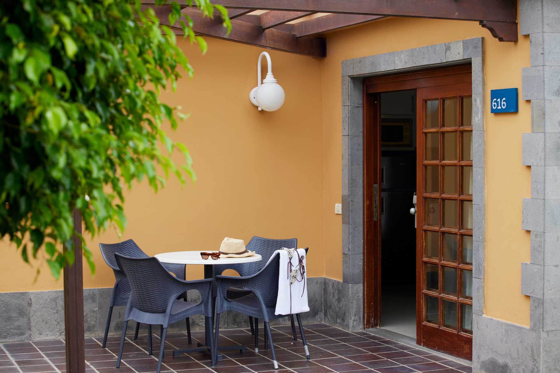 Neljän huoneen huoneisto maaterassilla. Kolme makuuhuonetta ja yhdistetty olohuone/minikeittiö. Kaksi erillistä sänkyä kaikissa makuuhuoneissa. Lisävuodemahdollisuus vuodesohvalla. Minikeittiö, jossa jääkaappi, pieni pakastin, keittolevyt, mikroaaltouuni, kahvinkeitin, leivänpaahdin ja yksinkertaiset keittiövälineet. Maksuton wifi, ilmastointi ja tallelokero. Tv kansainvälisillä kanavilla. Hiustenkuivain. Kylpyhuoneessa amme ja wc. Siivous 7 krt/viikko.