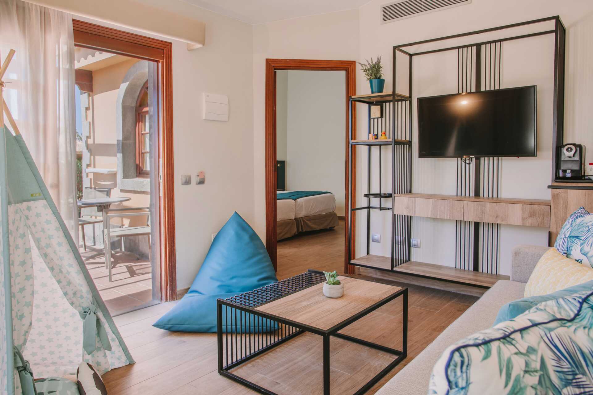 Perhesviitti maaterassilla, osa allasnäköalalla. Kaksi aurinkotuolia terassilla. Sviitissä on makuuhuone ja olohuone. Sviitissä on säkkituoli ja telttakatos. Kaksi yhden hengen sänkyä. Lisävuodemahdollisuus vuodesohvalla. Maksuton wifi ja ilmastointi. Tallelokero lisämaksusta. Minibaari alkoholittomilla juomilla. Vedenkeitin, kahvia ja teetä. Tv kansainvälisillä kanavilla. Hiustenkuivain. Kylpyhuoneessa suihku ja wc. Siivous 7 krt/viikko.