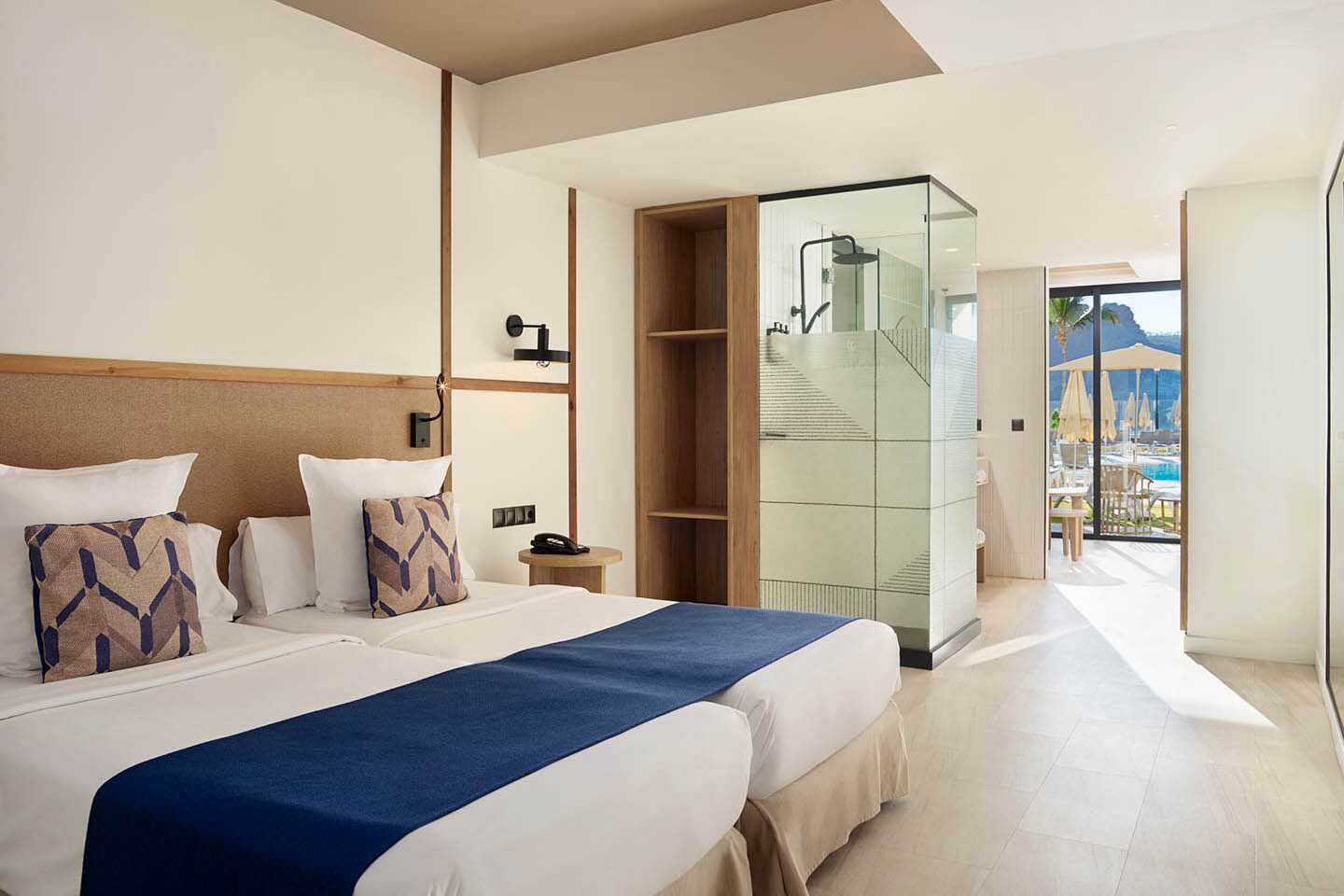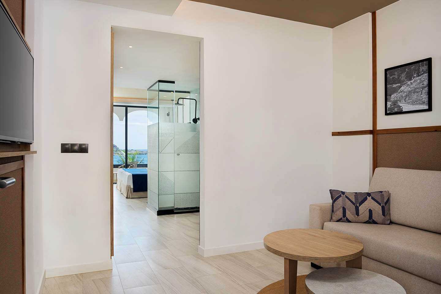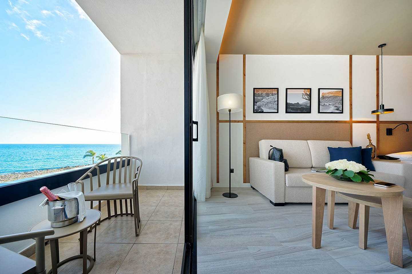 Juniorsviitti Superior tilavalla parvekkeella tai terassilla ja merinäköalalla Juniorsviitti koostuu makuuhuoneesta ja olohuoneesta avoimella pohjaratkaisulla. Kaksi yhden hengen vuodetta. Wifi, ilmastointi ja tallelokero sisältyvät hintaan. Pieni jääkaappi. Nespresso-keitin, kapselit lisämaksusta. Vedenkeitin, kahvia ja teetä. Jokaisessa huoneessa on televisio kansainvälisillä kanavilla. Hiustenkuivain. Suihku ja wc. Siivous 7 krt/viikko.