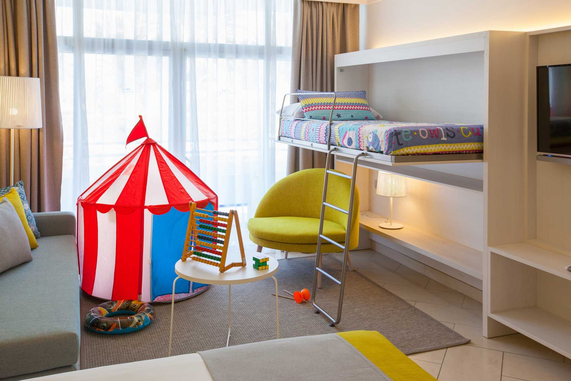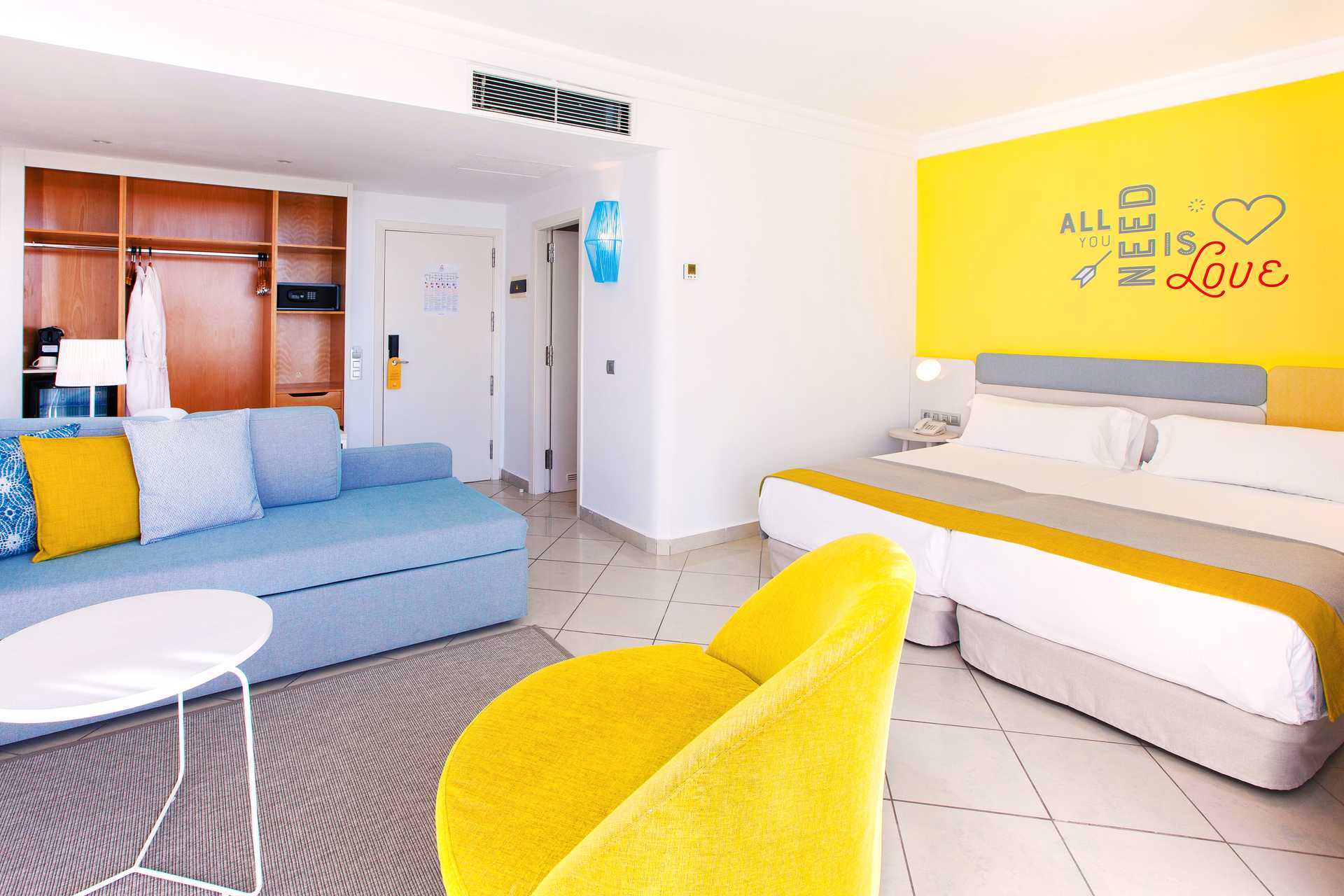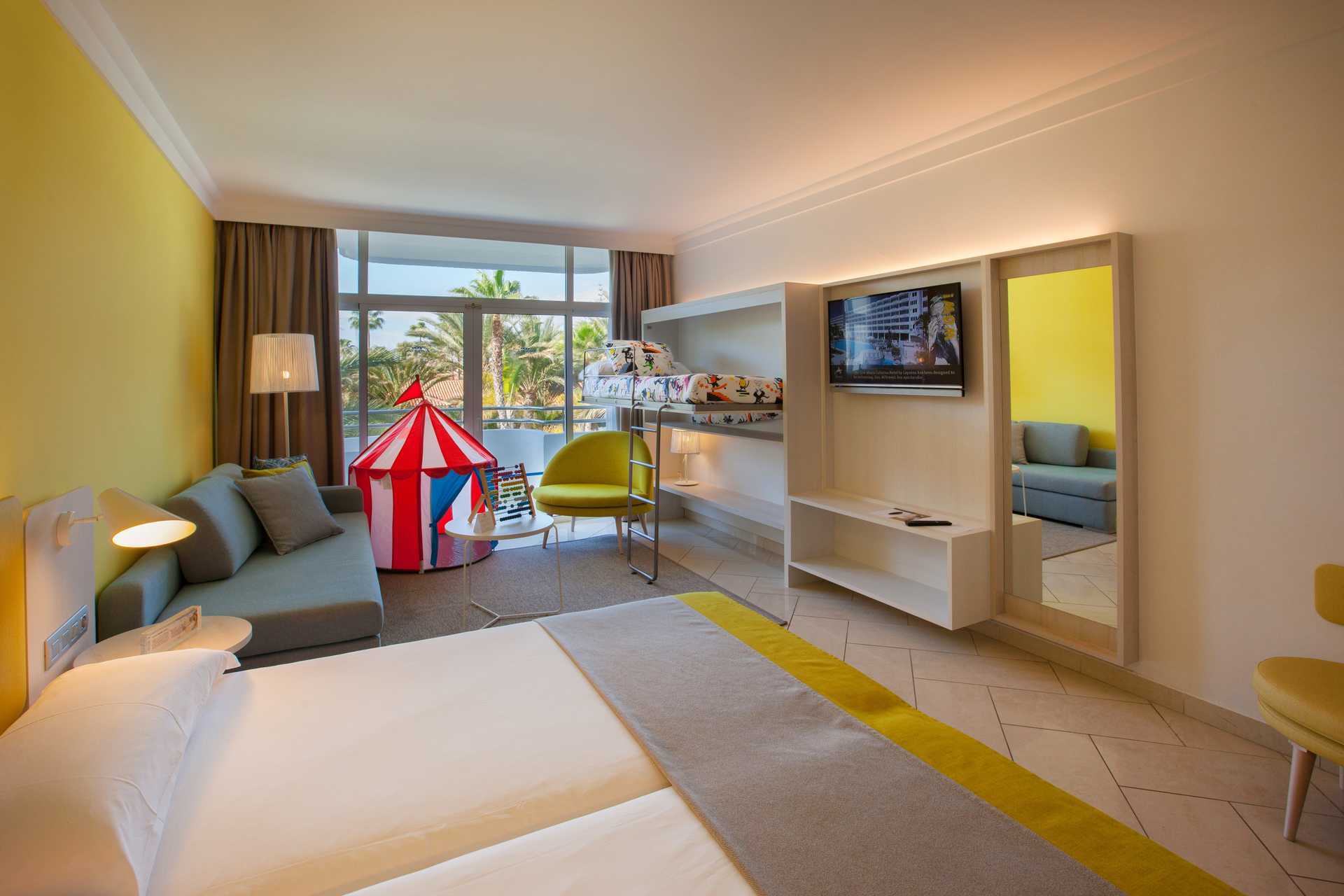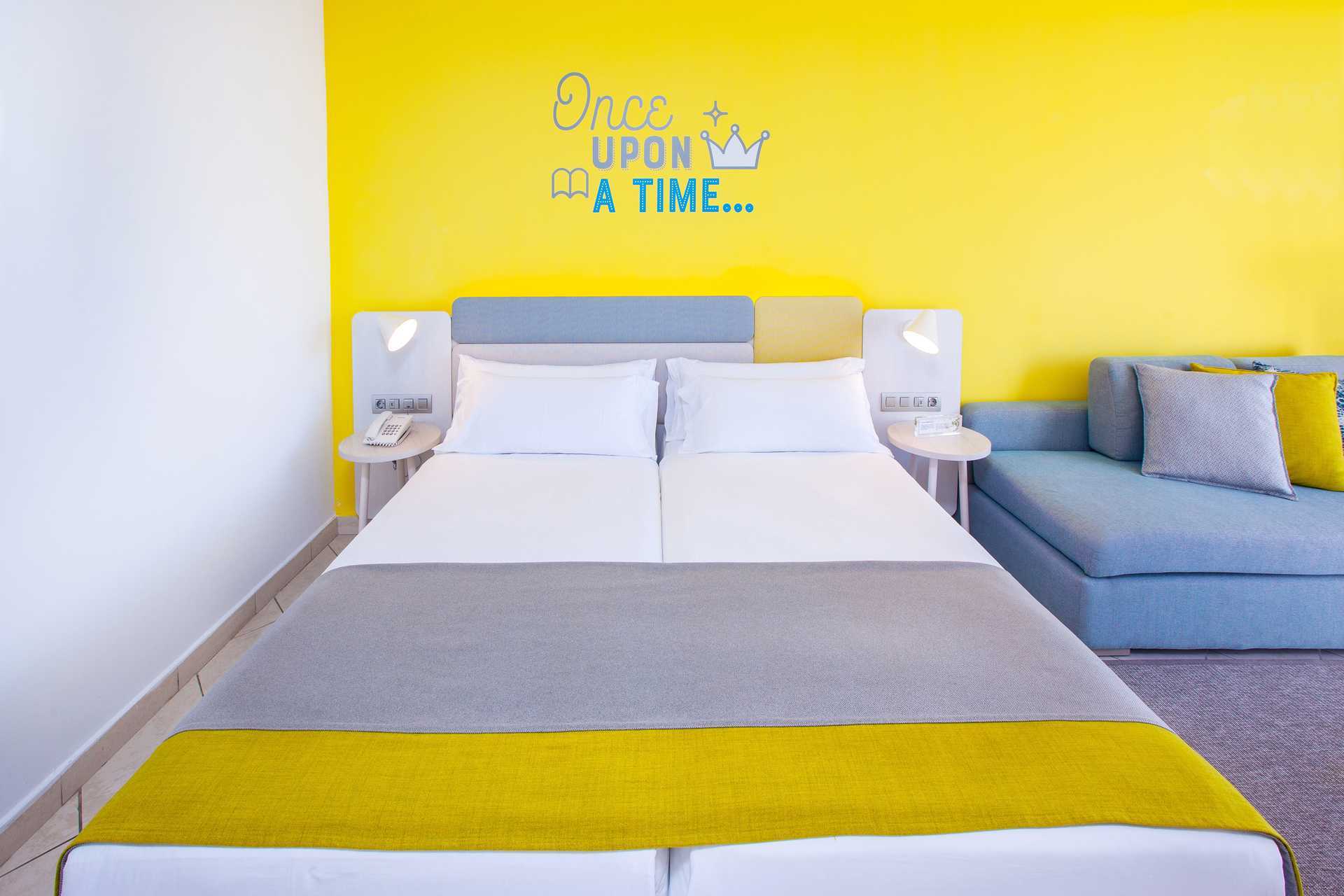 Perhehuone ulkotilalla ja allaspääsyllä suoraan lastenaltaalle. Terassilla on pöytiä, tuoleja ja aurinkotuoleja. Kaksi yhden hengen sänkyä. Mahdollisuus saada lisävuode vuodesohvaan tai kerrossänkyyn. Kesällä ja tarvittaessa talvella myös keskusohjattu ilmastointi. Maksuton wifi. Tallelokero lisämaksusta. Minibaari lisämaksulla. Vedenkeitin, kahvia ja teetä. Suuri vesipullo on huoneessa saavuttaessa. Tv kansainvälisillä kanavilla. Hiustenkuivain. Kylpyhuoneessa suihku ja wc. Siivous 7 krt/viikko. Alle 2-vuotiaat lapset lasketaan lisävuoteella majoittuviksi henkilöiksi.