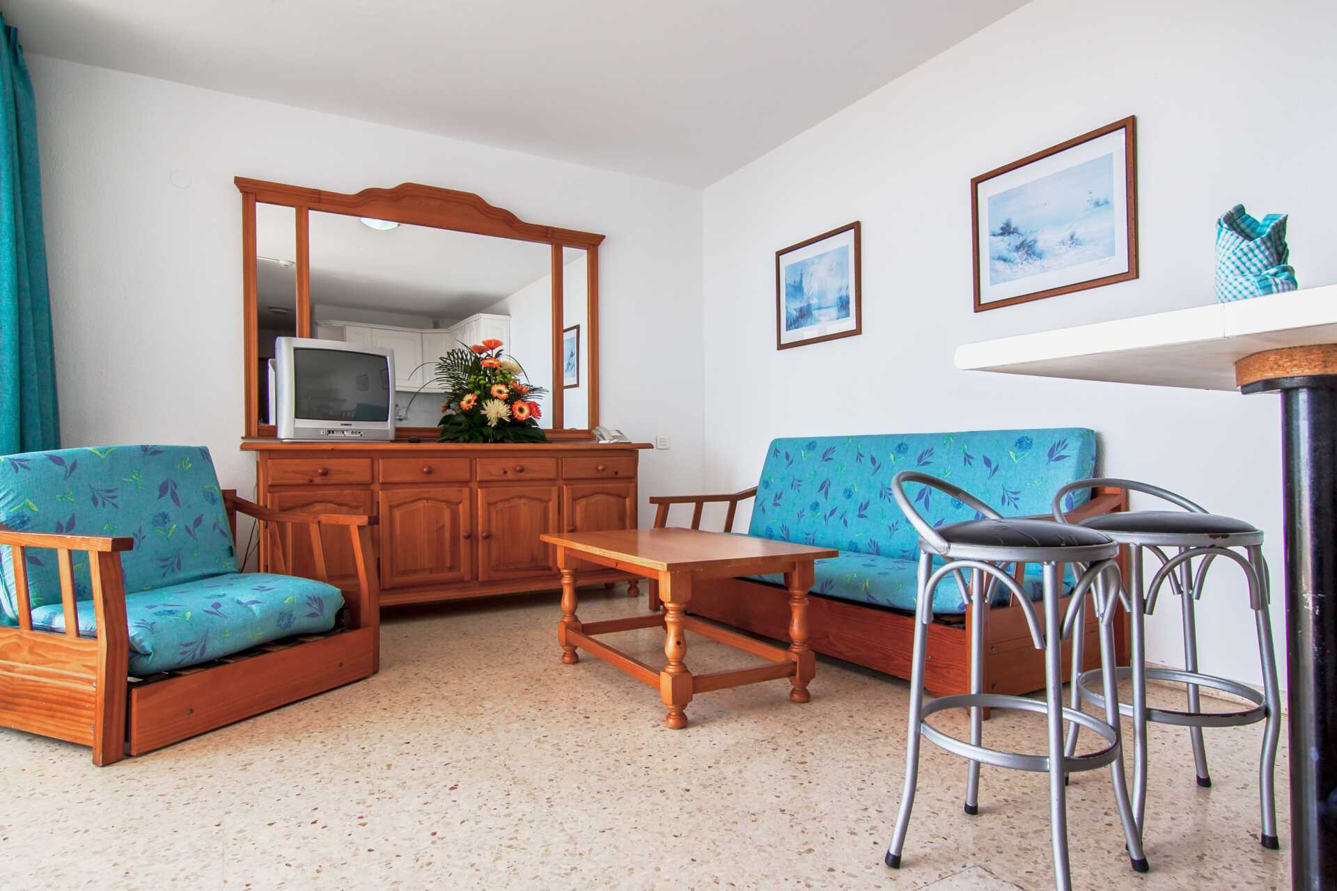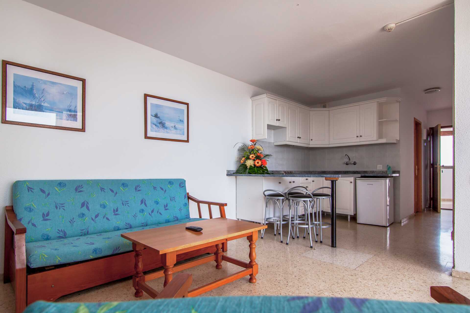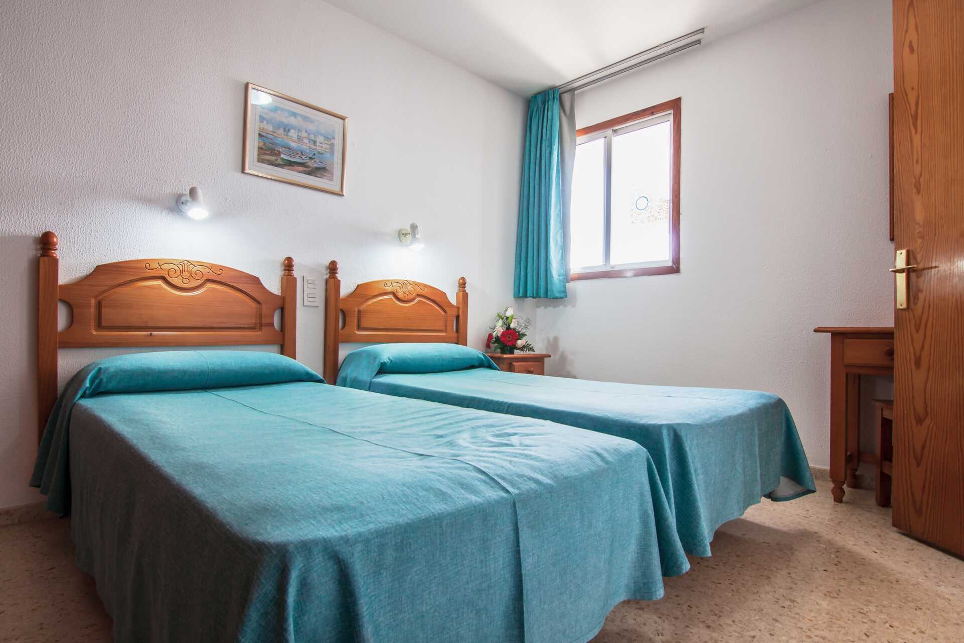 Kolmio parvekkeella. Kaksi makuuhuonetta ja yhdistetty olohuone ja minikeittiö. Kaksi yhden hengen sänkyä molemmissa makuuhuoneissa. Lisävuodemahdollisuus vuodesohvasta. Minikeittiössä on keittolevyt, jääkaappi ja yksinkertainen keittiövarustus. Wifi ja tallelokero lisämaksusta. TV kansainvälisillä kanavilla lisämaksulla. Amme tai suihku ja wc. Siivous 5 krt/viikko.