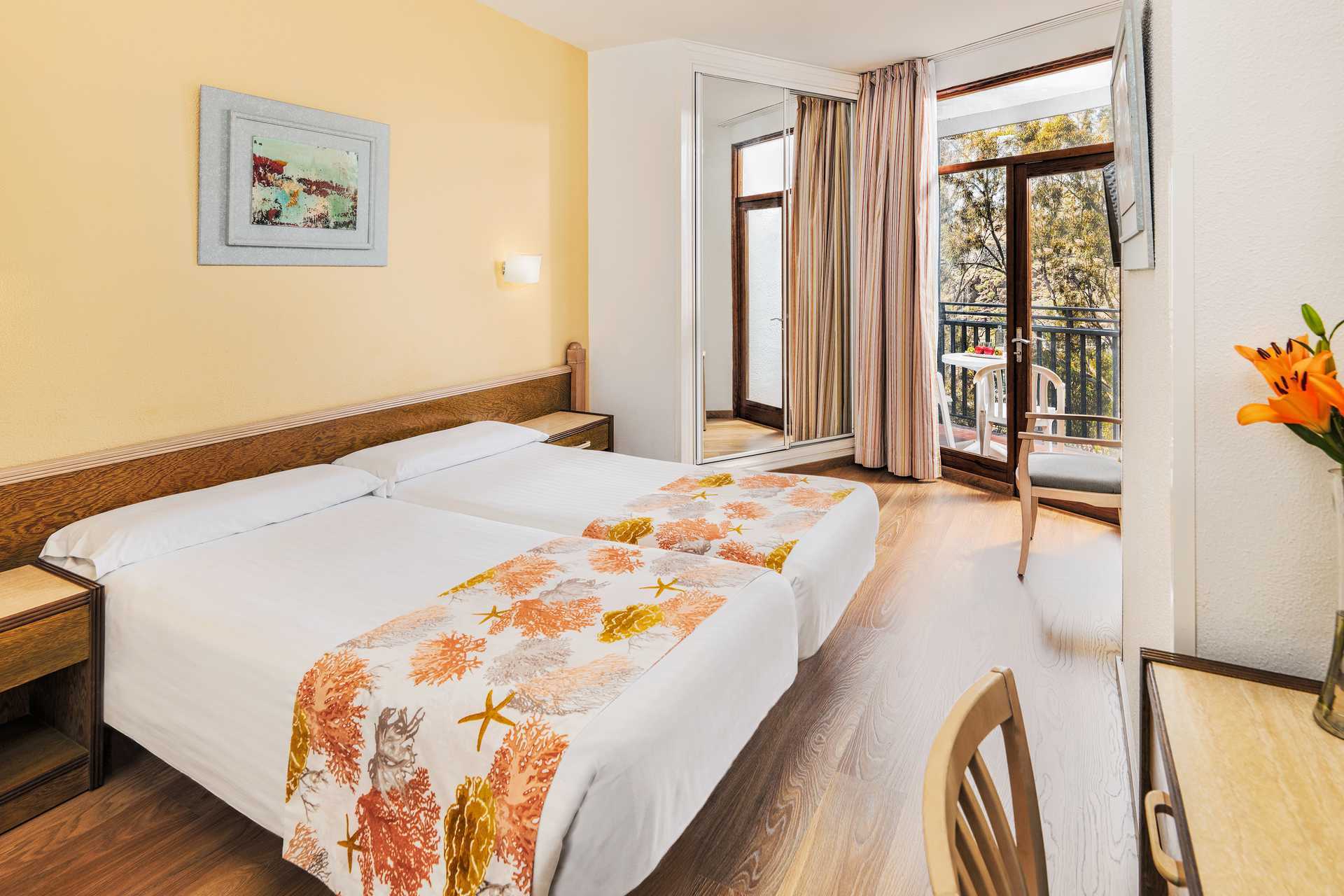 Kahden hengen huone parvekkeella ja merinäköalalla. Huoneet sijaitsevat kerroksissa 5-7. Parivuode tai kaksi yhden hengen sänkyä. Maksuton wifi. Ilmastointi lisämaksusta. Tv kansainvälisillä kanavilla. Hiustenkuivaajia voi lainata takuumaksua vastaan. Amme ja wc. Siivous 7 krt/viikko.