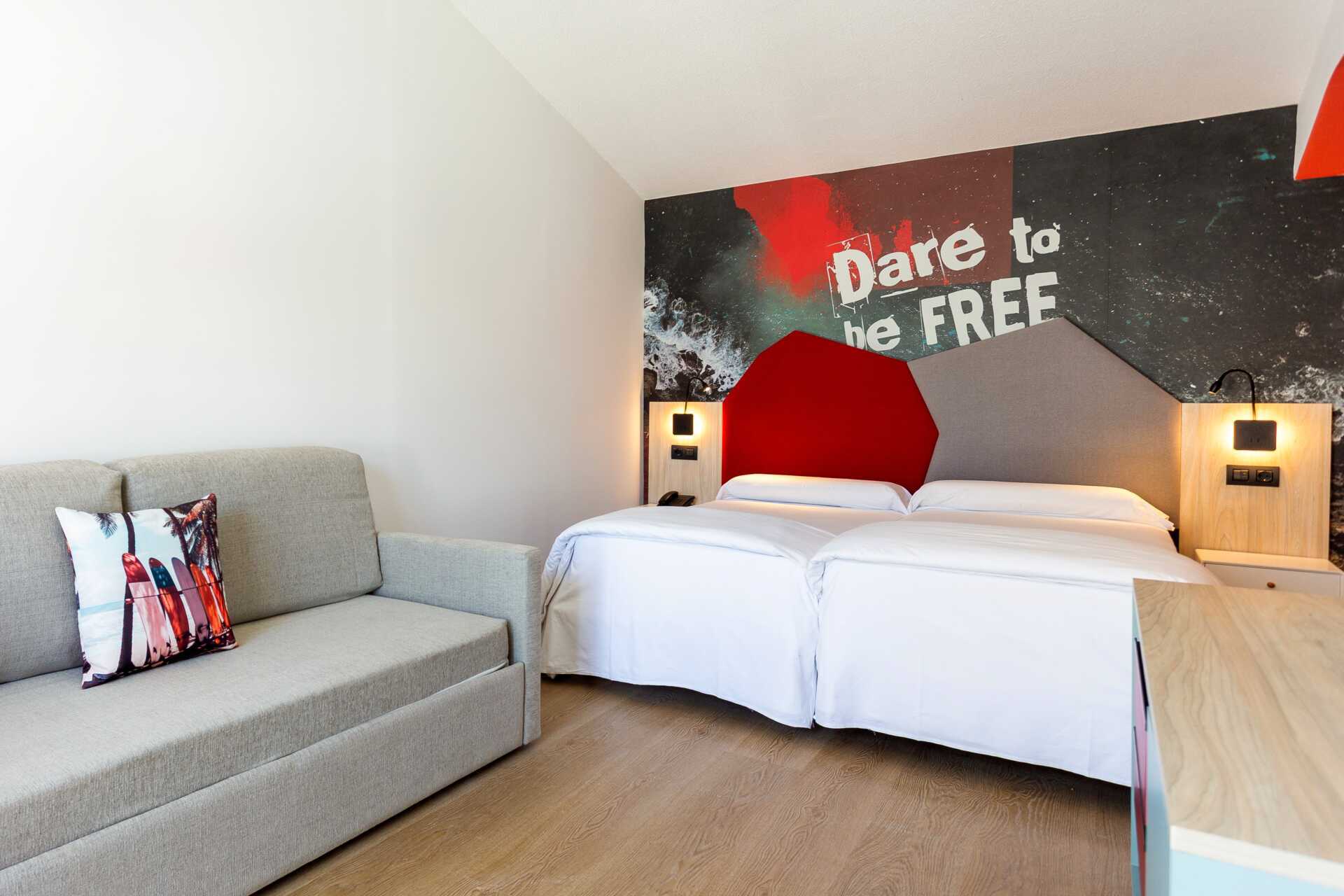 Kahden hengen huone ja jaettu ulkotila. Terassilla on kaksi tuolia ja pieni pöytä, ja se sijaitsee ulkokäytävän/käytävän varrella. Kaksi yhden hengen vuodetta. Lisävuodemahdollisuus vuodesohvasta. Maksuton wifi. Minibaari. Kylpyhuoneessa suihku ja wc. Siivous 3 krt/viikko. Alle 2-vuotiaat lapset lasketaan lisävuoteella majoittuviksi henkilöiksi.