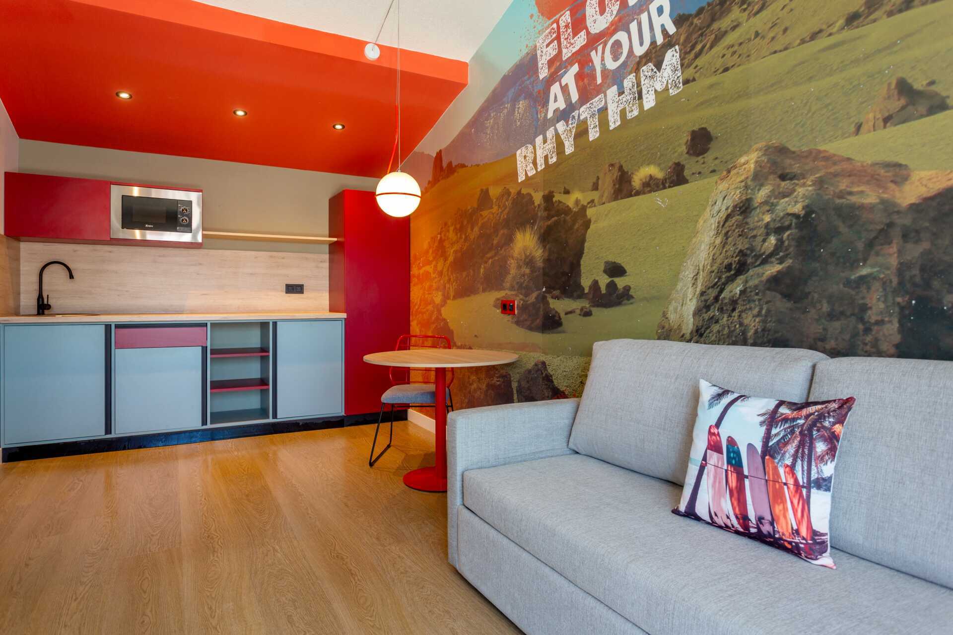 Sviitti, johon kuuluu jaettu ulkotila. Terassilla on kaksi tuolia ja pieni pöytä, ja se sijaitsee ulkokäytävän/käytävän varrella. Sviitissä on makuuhuone ja olohuone. Kaksi yhden hengen vuodetta. Lisävuodemahdollisuus vuodesohvasta. Maksuton wifi. Minibaari. Mikroaaltouuni. Suihku ja wc. Siivous 3 krt/viikko. Alle 2-vuotiaat lapset lasketaan lisävuoteella majoittuviksi henkilöiksi.