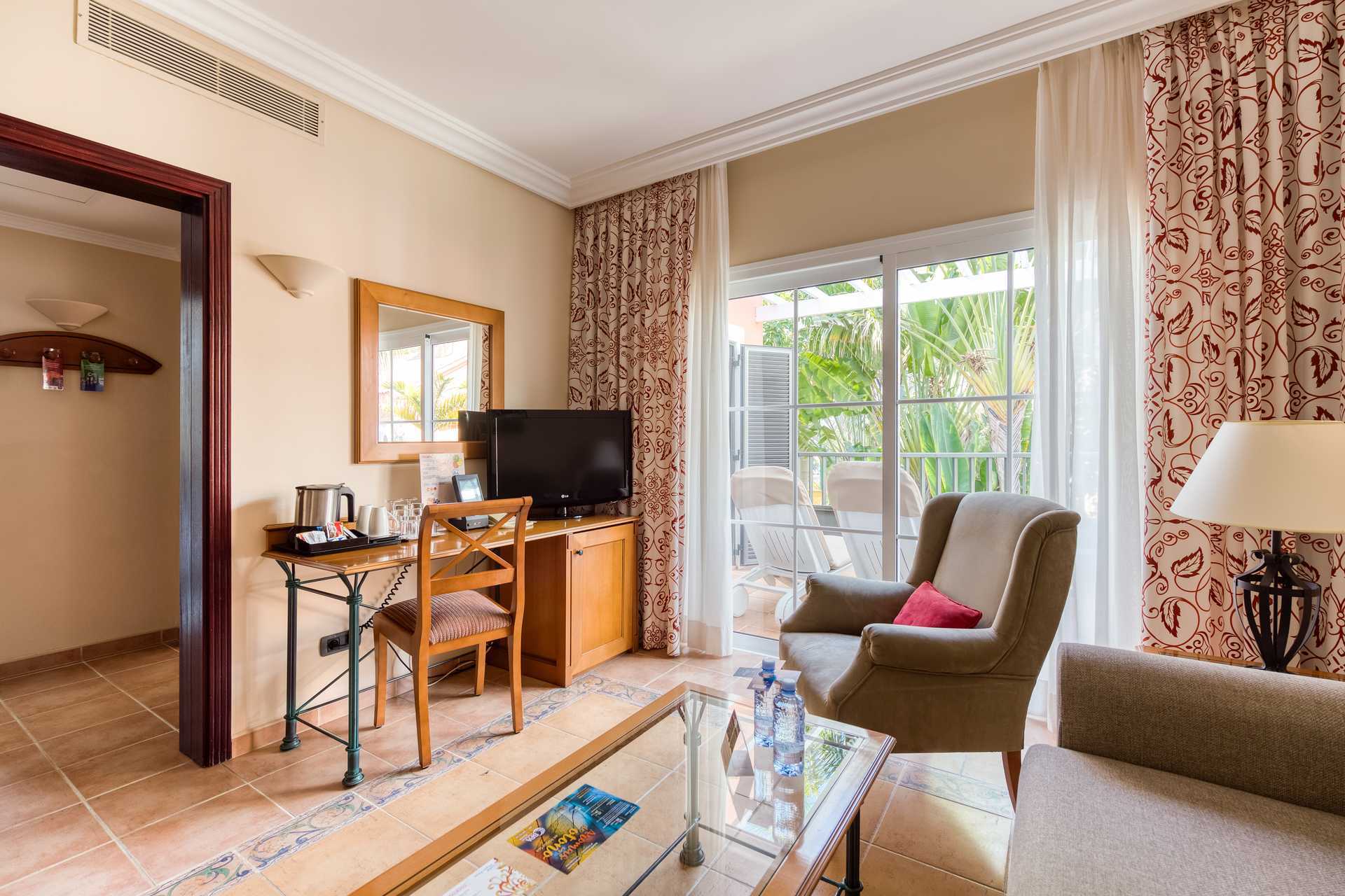 Juniorsviitti joissa on parveke tai terassi. Ulkotilassa on aurinkotuolit, pöytä ja normaalit tuolit. Juniorsviitit koostuvat makuuhuoneesta ja olohuoneesta. Kaksi yhden hengen vuodetta. Lisävuodemahdollisuus vuodesohvasta tai kokoontaitettavasta sängystä. Maksuton wifi ja ilmastointi. Tallelokero lisämaksusta. Jääkaappi. Minibaari lisämaksusta. Vedenkeitin, kahvia ja teetä. Tv kansainvälisillä kanavilla. Hiustenkuivain. Kylpyamme ja wc. Siivous 7 krt/viikko.
