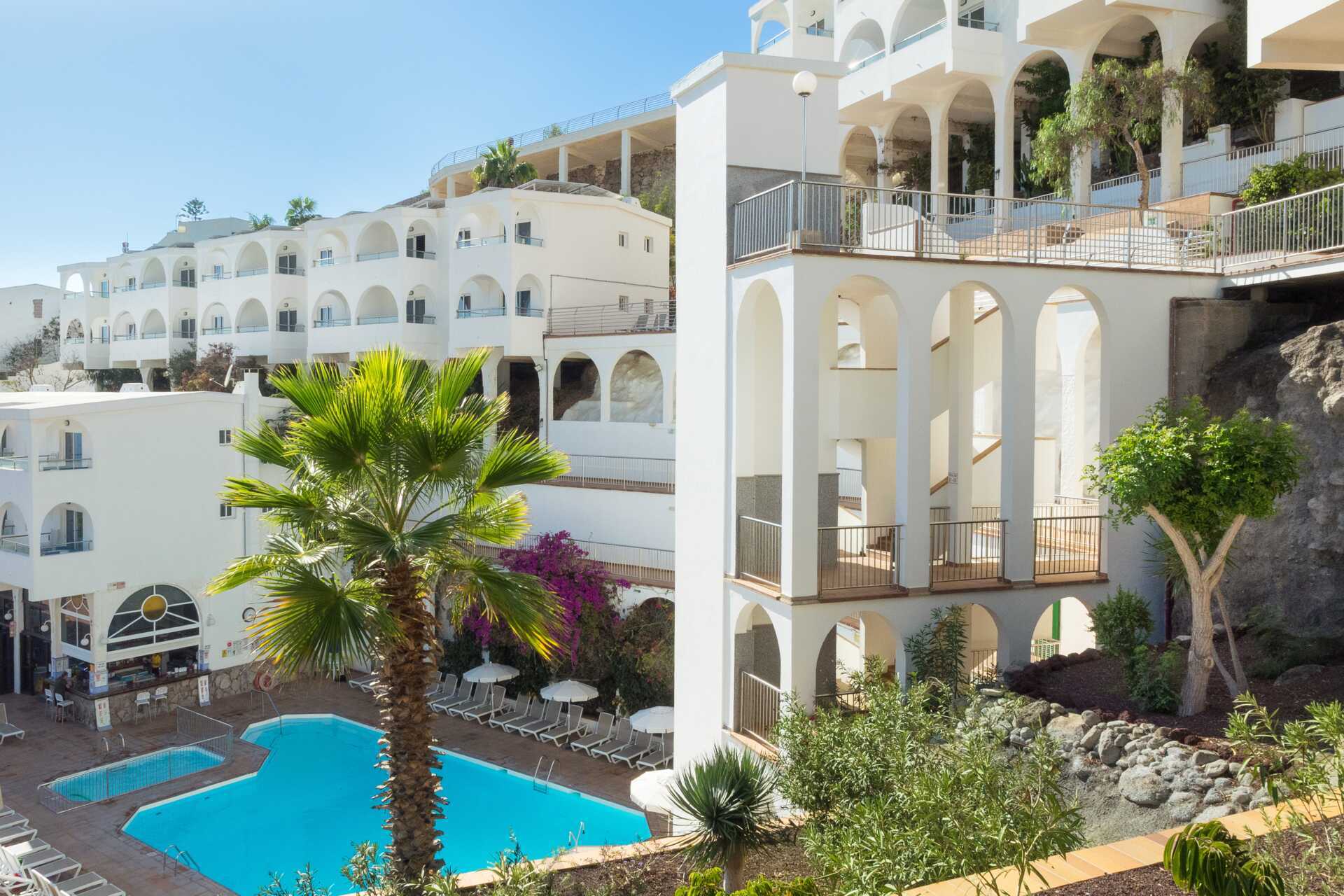 Maksuton wifi vastaanotossa. Minimarket. Portaita ja korkeuseroja hotellissa sekä matkalla keskustaan ja rannalle. Noin 100 metriä Europa ostoskeskukseen ja noin 2,5 kilometriä Puerto Ricon keskustaan. Läheisten baarien äänet voidaan kokea häiritsevänä osassa huoneistoissa. Paikallisliikennettä.