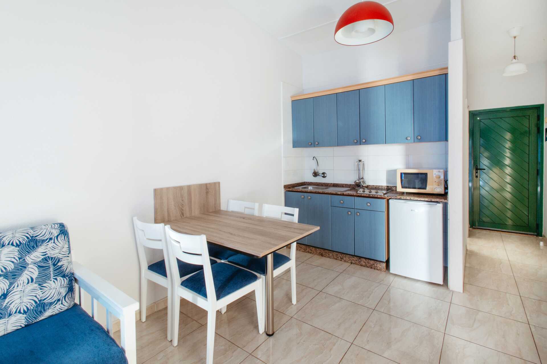 Kaksioita, joissa on parveke merelle päin. Makuuhuone ja yhdistetty olohuone/minikeittiö. Kaksi yhden hengen vuodetta. Lisävuodemahdollisuus vuodesohvasta. Minikeittiö, jossa on keittolevyt, vedenkeitin, leivänpaahdin, kahvinkeitin, mikro, jääkaappi ja yksinkertainen keittiövarustus. Wifi ja tallelokero lisämaksusta. Kattotuuletin. Tv kansainvälisillä kanavilla - kaukosäädin panttia vastaan. Suihku ja wc. Siivous 5 krt/viikko. Alle 2-vuotiaat lasketaan lisävuoteella yöpyväksi henkilöksi.