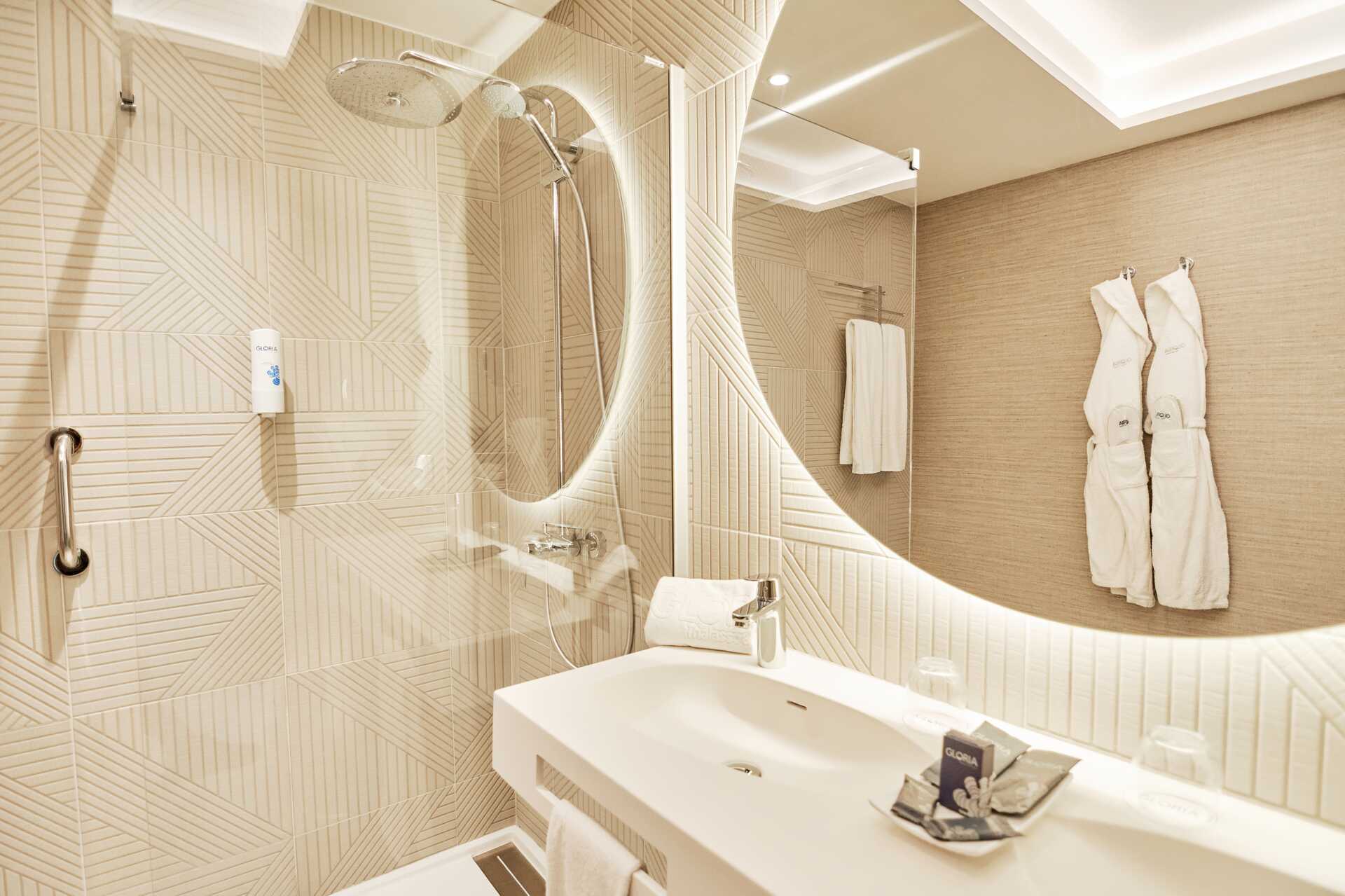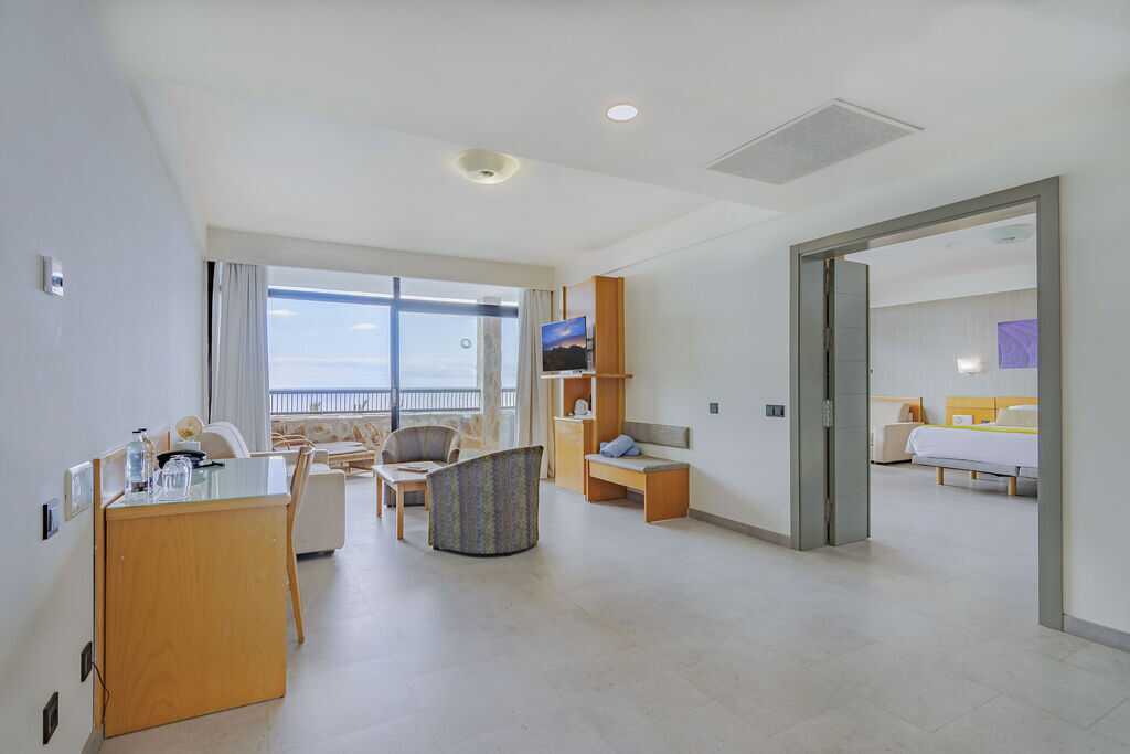 Kahden huoneen sviitti parvekkeella ja merinäköalalla. Sviitti koostuu olohuoneesta ja makuuhuoneesta. Parvekkeella on kaksi aurinkotuolia. Parivuode ja yhden hengen vuode. Maksuton wifi ja ilmastointi. Tallelokero lisämaksusta. Minibaari lisämaksulla. Vedenkeitin. Tv kansainvälisillä kanavilla. Allaspyyhkeet ovat valmiina huoneessa saavuttaessa. Kylpytakit ja tossut. Hiustenkuivain. Kylpyhuoneessa kylpyamme tai suihku ja wc. Siivous 7 krt/viikko.