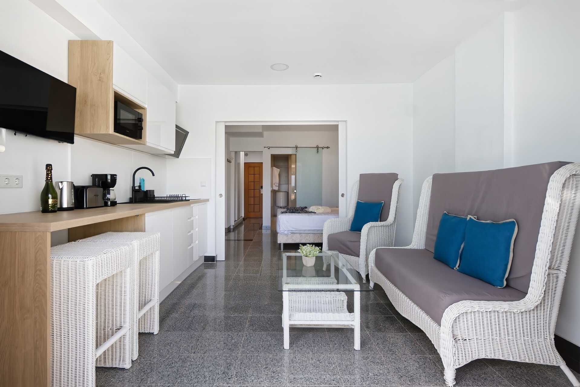Superior-yksiö parvekkeella ja merinäköalalla. Huoneistot sijaitsevat kerroksissa 3-4. Yhdistetty makuuhuone ja minikeittiö. Parivuode. Minikeittiössä keittolevyt, jääkaappi, leivänpaahdin, kahvinkeitin, vedenkeitin, mikro ja yksinkertainen keittiövarustus. Joissakin huoneistoissa ruokailutilana toimii baaritaso. Maksuton wifi ja ilmastointi. Tallelokero lisämaksusta. Tv kansainvälisillä kanavilla. Hiustenkuivain. Kylpyhuoneessa suihku ja wc. Siivous 6 krt/viikko.