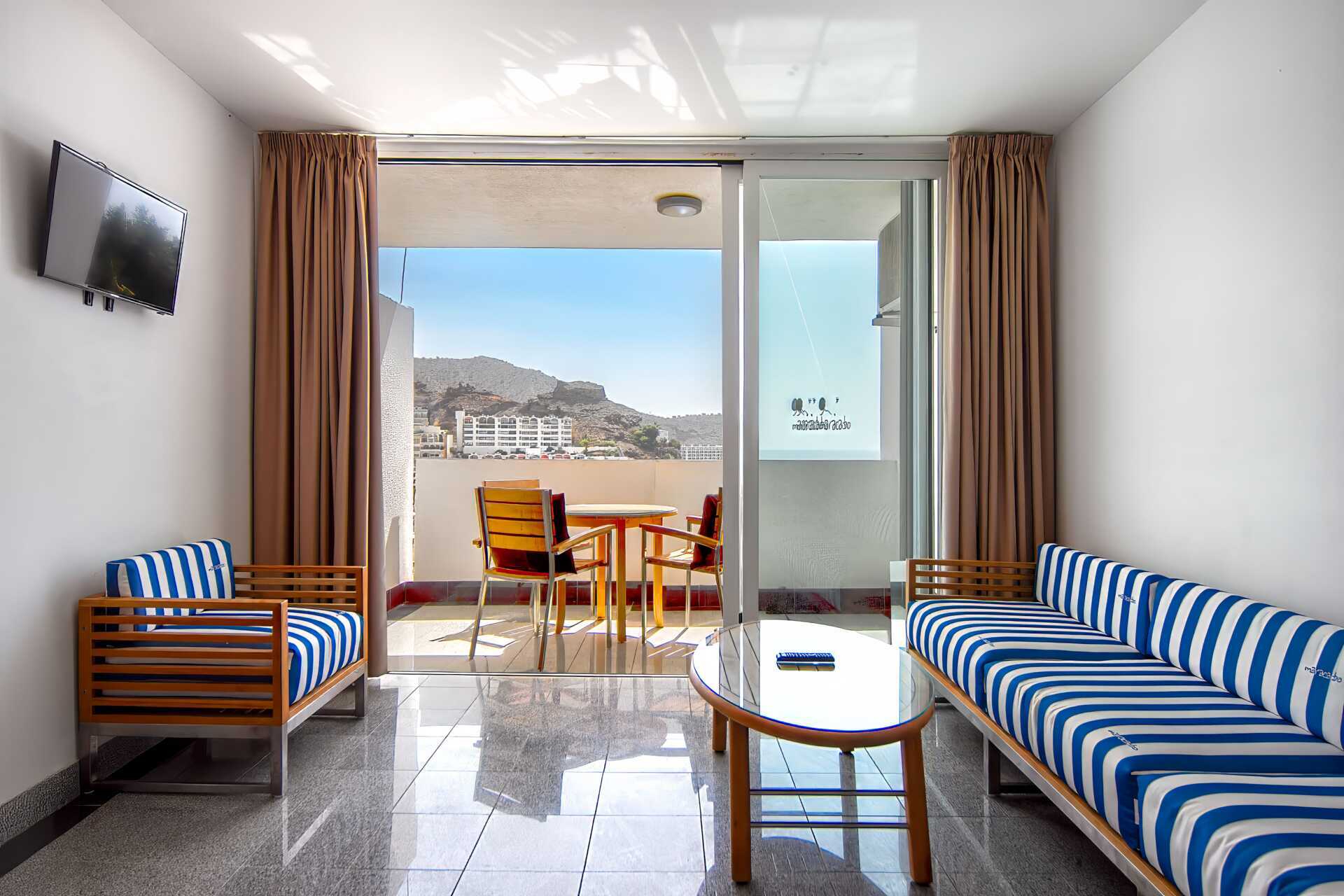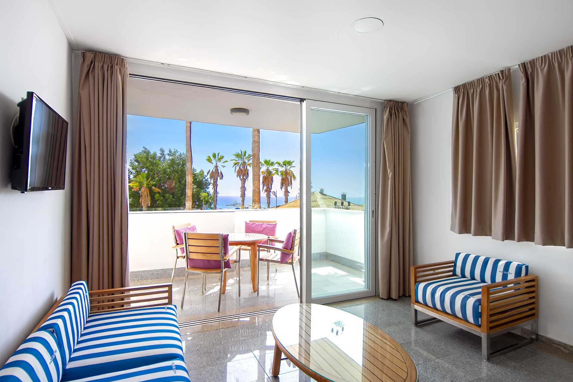 Superior-kolmio parvekkeella ja merinäköalalla. Huoneistot sijaitsevat toisessa, kolmannessa tai neljännessä kerroksessa. Kaksi makuuhuonetta ja yhdistetty olohuone ja minikeittiö. Yhdessä makuuhuoneessa on parivuode ja toisessa makuuhuoneessa kaksi erillistä vuodetta. Lisävuodemahdollisuus vuodesohvasta. Minikeittiössä keittolevyt, jääkaappi, leivänpaahdin, kahvinkeitin, vedenkeitin, mikro ja yksinkertainen keittiövarustus. Joissakin huoneistoissa ruokailutilana toimii baaritaso. Maksuton wifi ja ilmastointi. Tallelokero lisämaksusta. Tv kansainvälisillä kanavilla. Hiustenkuivain. Kylpyhuoneessa suihku ja wc. Siivous 6 krt/viikko.