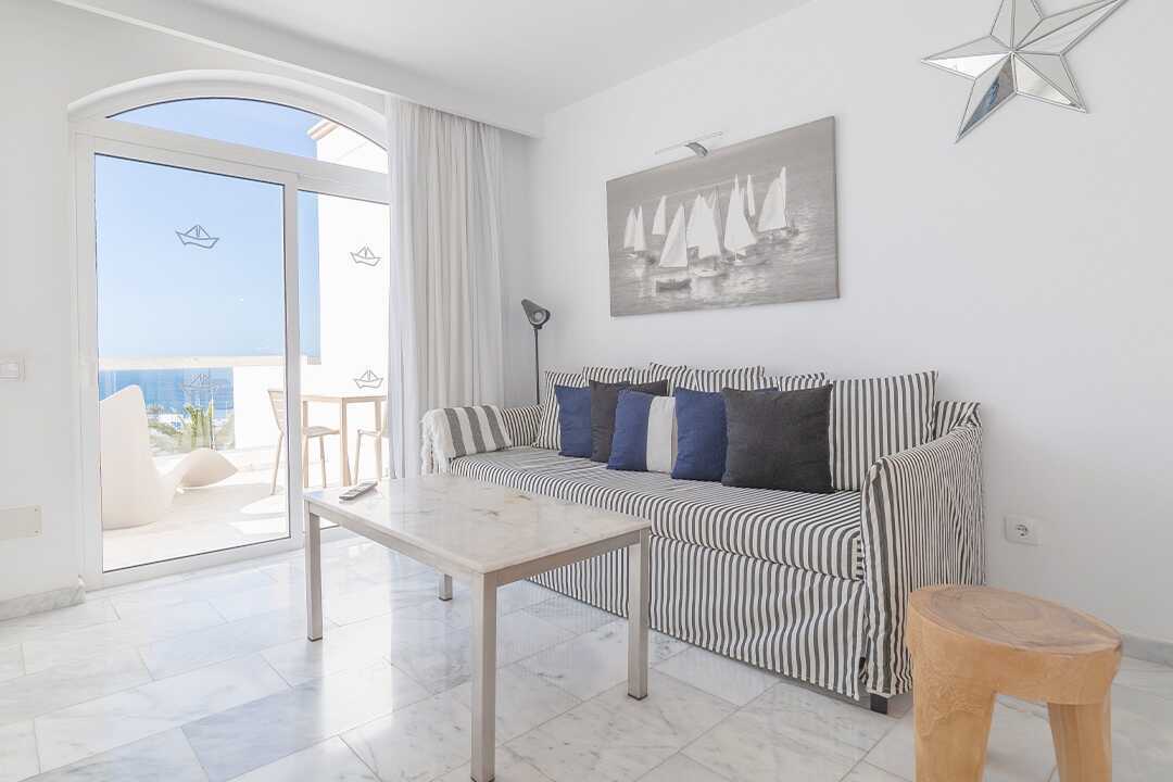 Kaksio, jossa on parveke tai terassi ja rajoitettu merinäköala. Jotkut huoneistot ovat kaksikerroksisia. Aurinkotuolit ulkotilassa ja rauhallinen, aurinkoinen sijainti, joka on hotellin paras. Makuuhuone sekä yhdistetty olohuone ja minikeittiö. Kaksi yhden hengen sänkyä. Lisävuodemahdollisuus vuodesohvasta. Minikeittiössä keittolevyt, jääkaappi, kahvinkeitin, leivänpaahdin, vedenkeitin ja yksinkertainen keittiövarustus. Maksuton wifi ja ilmastointi. Tallelokero lisämaksusta. Tv kansainvälisillä kanavilla. Aamutakit ja tossut. Hiustenkuivain. Kylpyhuoneessa suihku ja wc. Siivous 5 krt/viikko.
