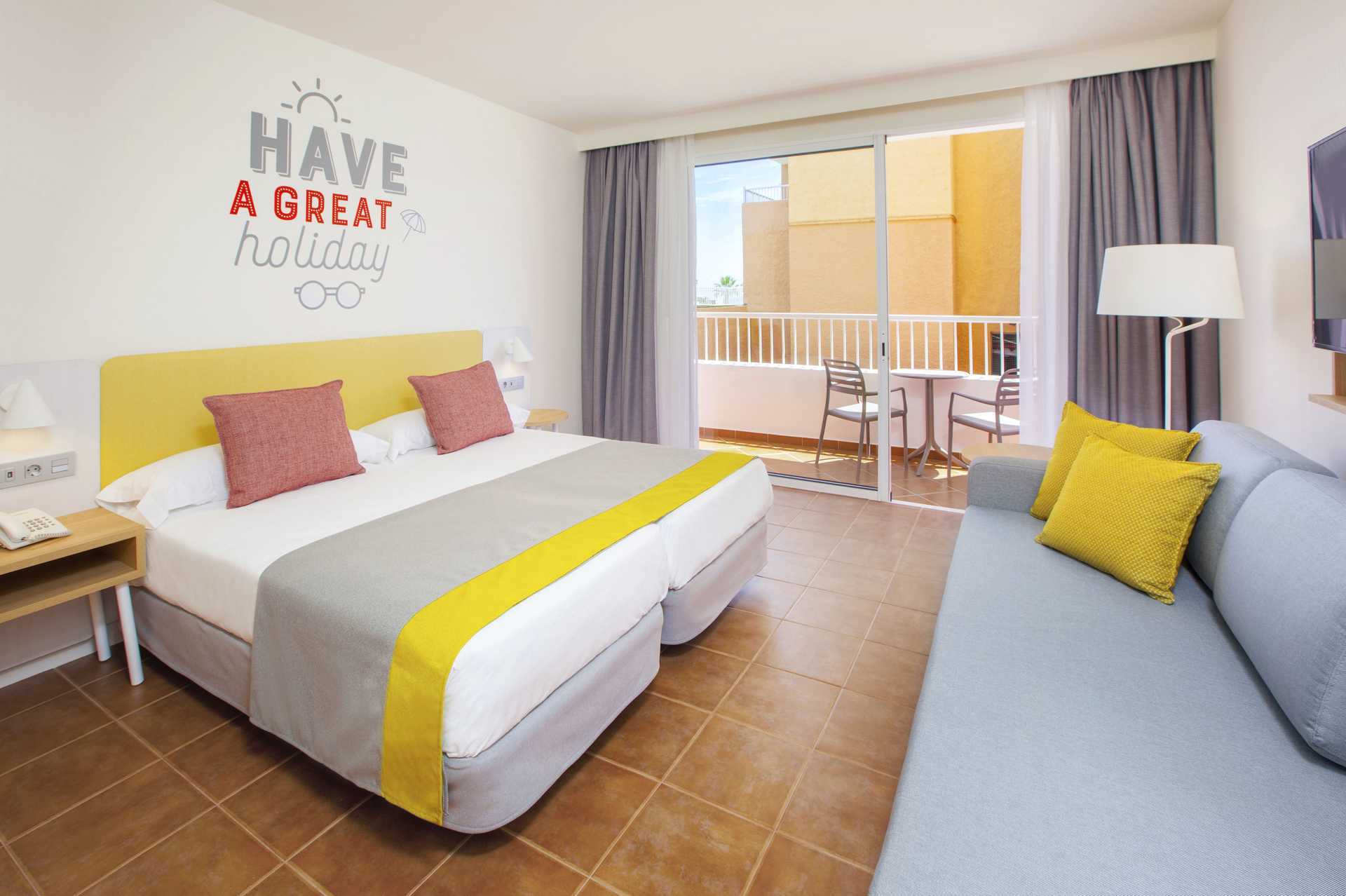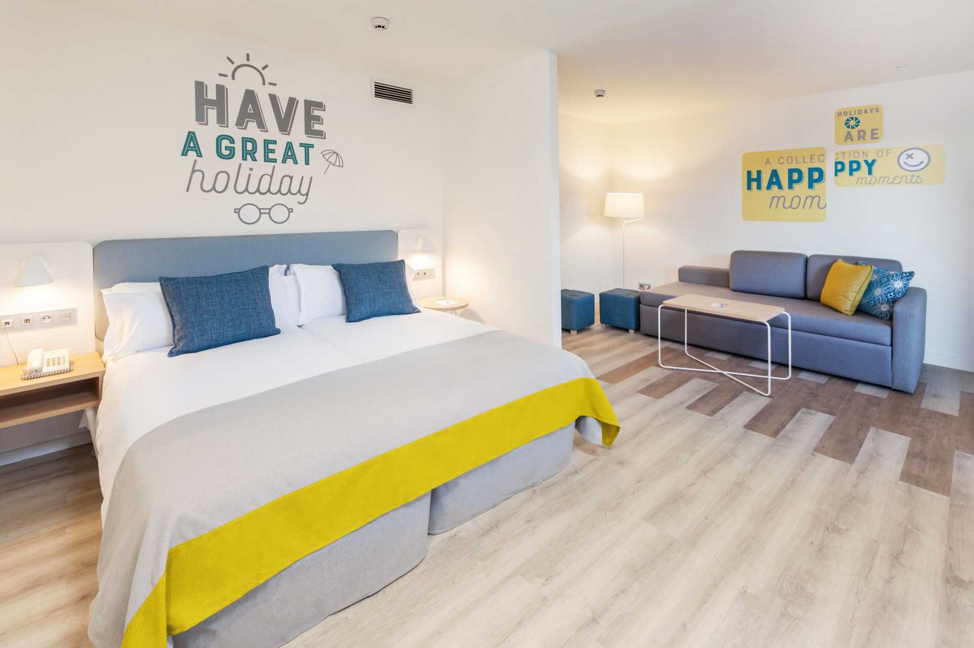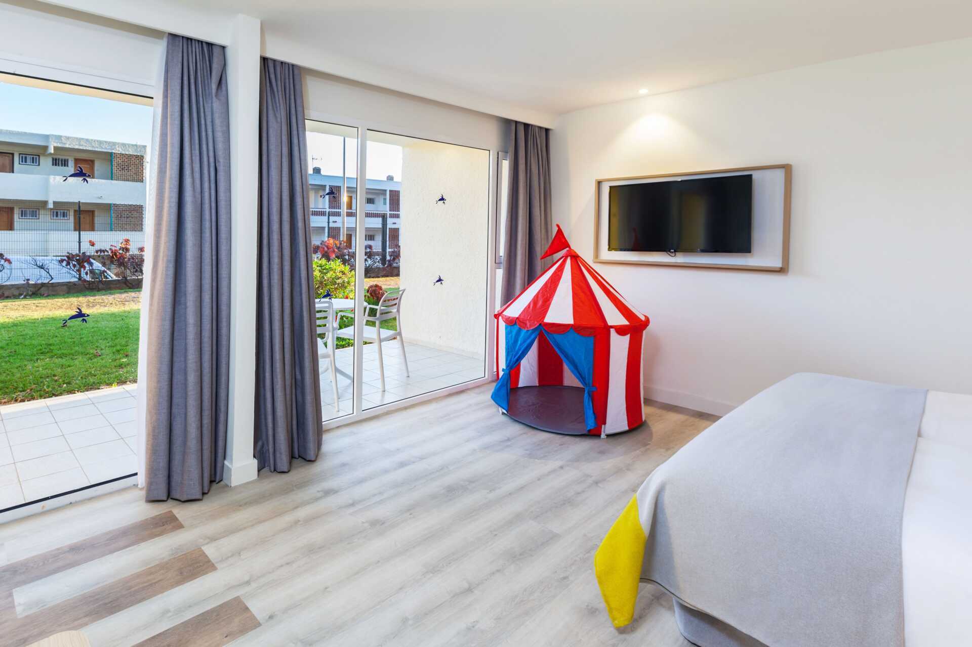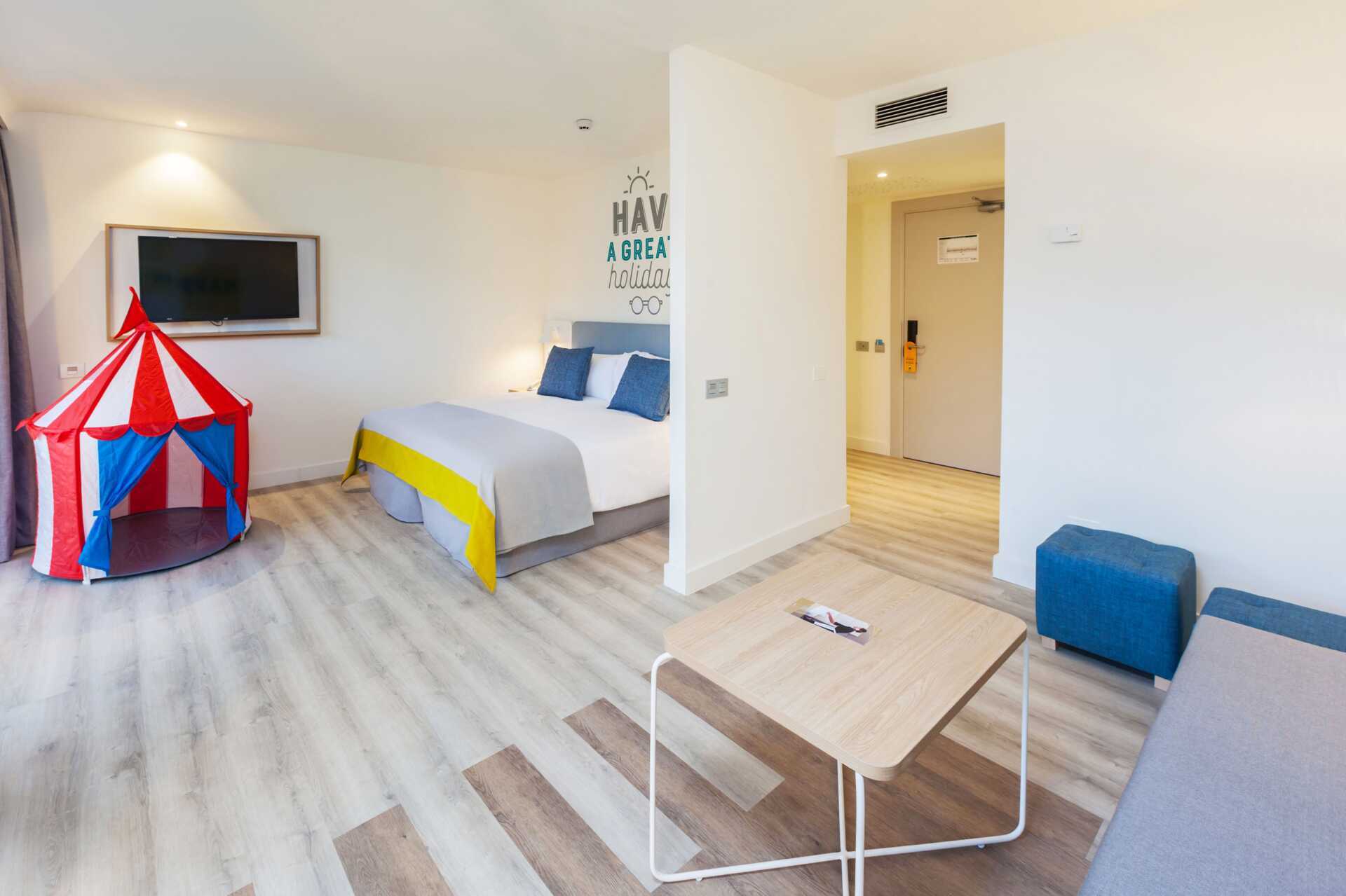 Perhehuone parvekkeella tai terassilla. Terassilla varustetuissa huoneissa on lapsille leikkiteltta. Kaksi yhden hengen sänkyä. Lisävuodemahdollisuus kokoontaitettavasta nojatuolista. Maksuton wifi ja ilmastointi. Tallelokero lisämaksusta. Minibaari lisämaksulla. Vedenkeitin. Tv kansainvälisillä kanavilla. Hiustenkuivain. Kylpyhuoneessa suihku ja wc. Siivous 7 krt/viikko. Alle 2-vuotiaat lapset lasketaan lisävuoteella majoittuviksi henkilöiksi.