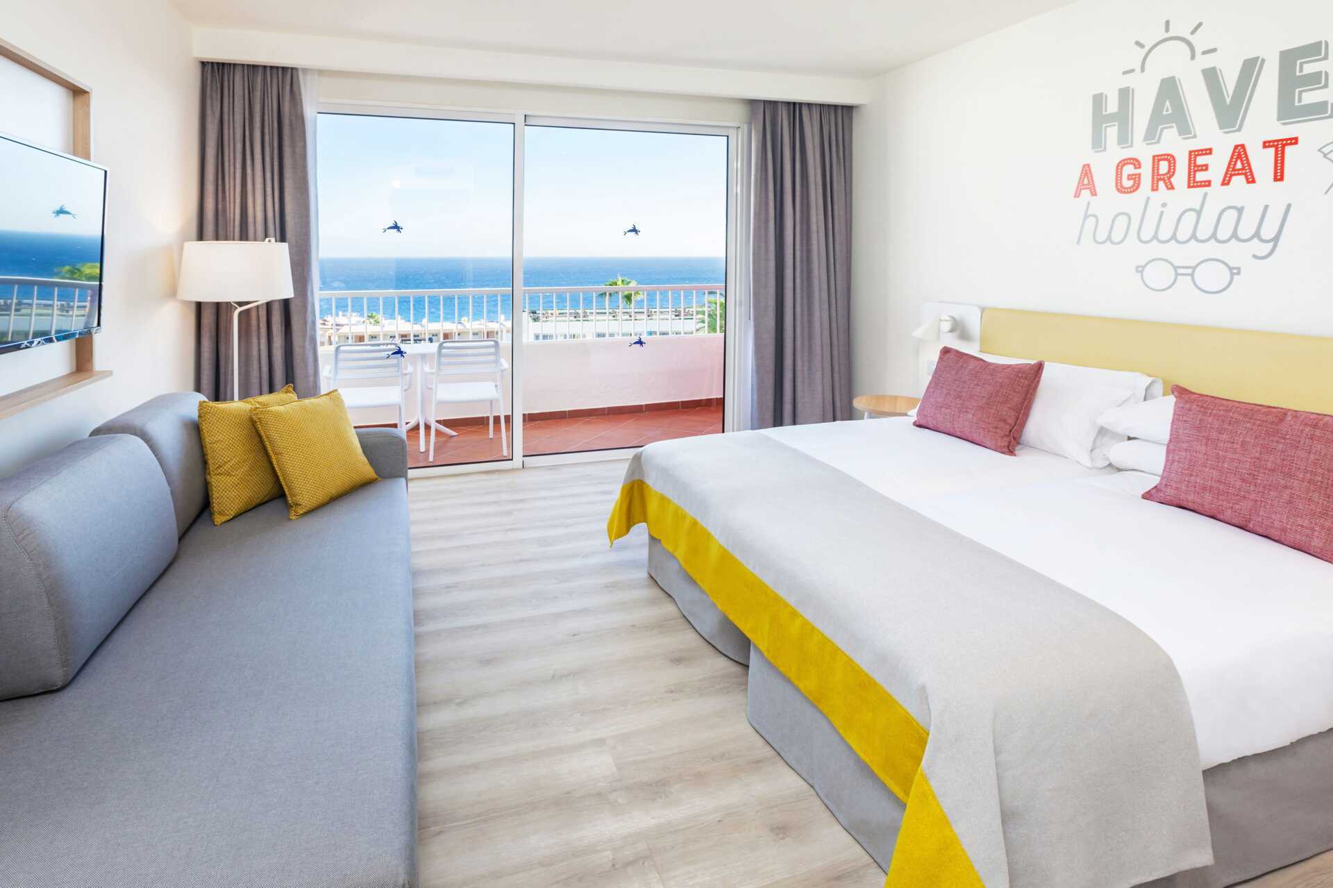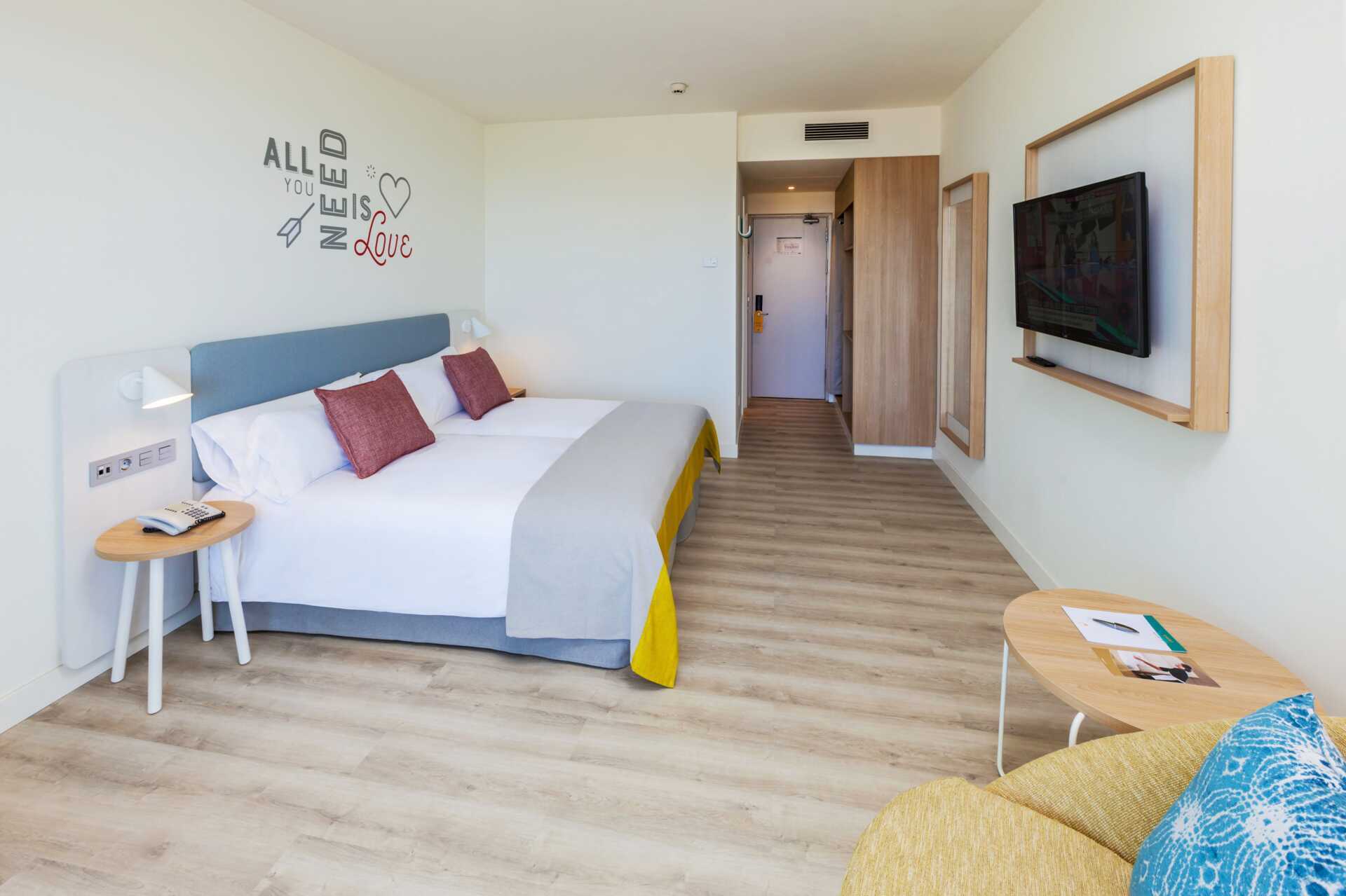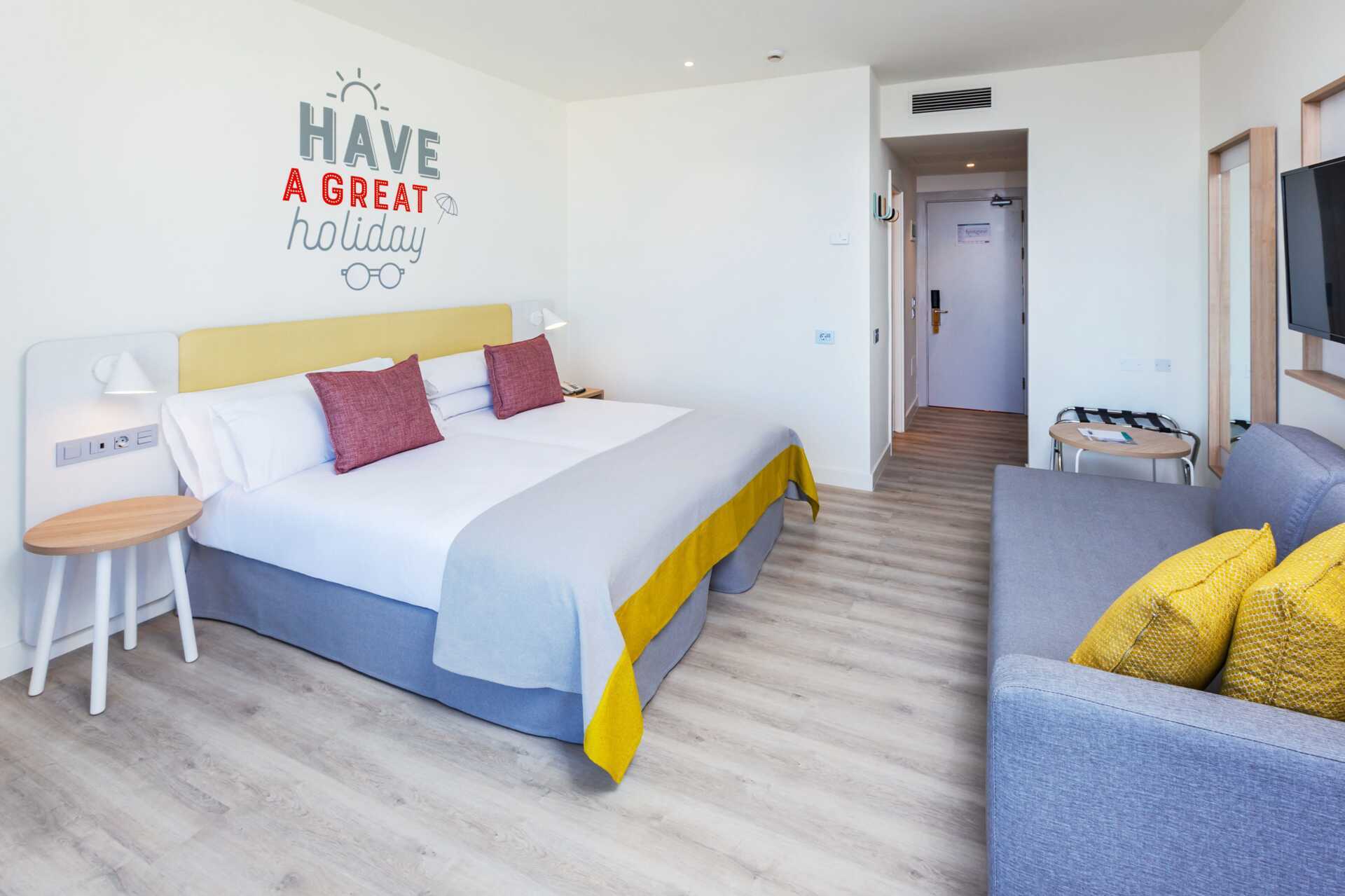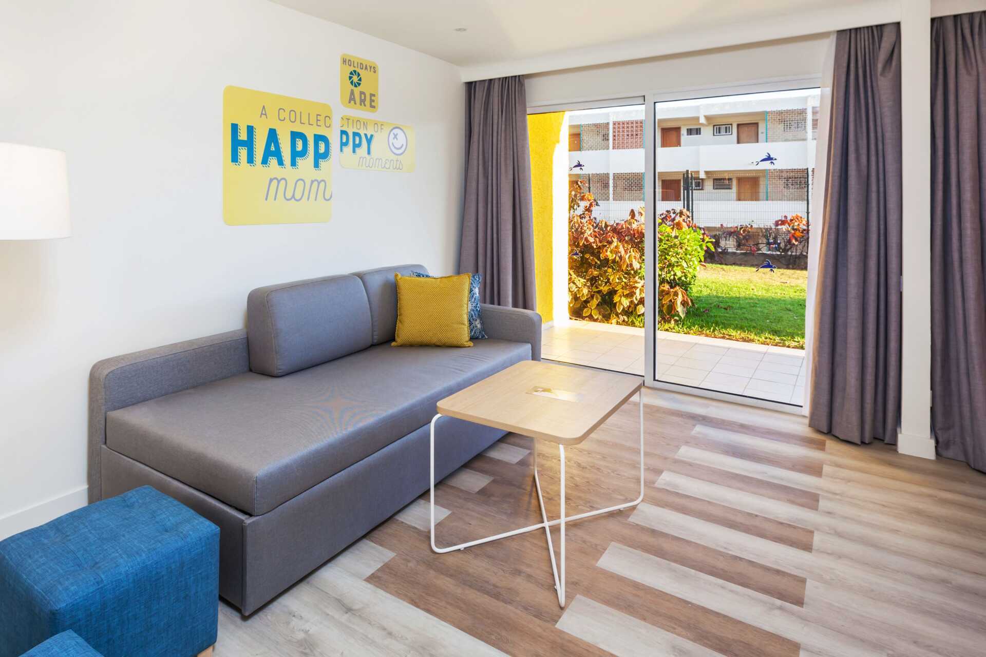 Perhehuone parvekkeella tai terassilla. Terassilla varustetuissa huoneissa on lapsille leikkiteltta. Kaksi yhden hengen sänkyä. Lisävuodemahdollisuus kokoontaitettavasta nojatuolista. Maksuton wifi ja ilmastointi. Tallelokero lisämaksusta. Minibaari lisämaksulla. Vedenkeitin. Tv kansainvälisillä kanavilla. Hiustenkuivain. Kylpyhuoneessa suihku ja wc. Siivous 7 krt/viikko. Alle 2-vuotiaat lapset lasketaan lisävuoteella majoittuviksi henkilöiksi.