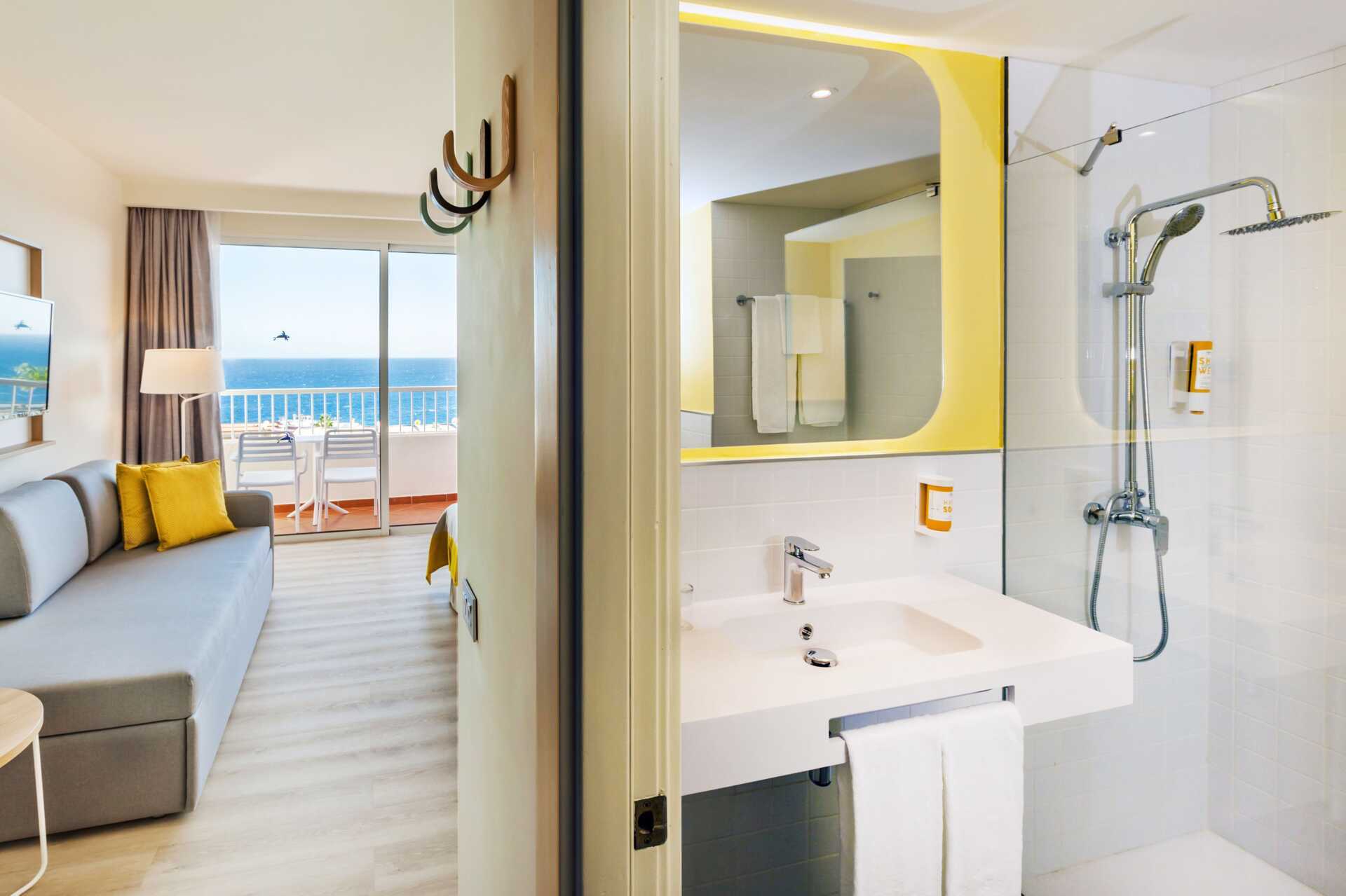 Perhesviitti parvekkeella. Sviitissä on makuuhuone ja olohuone. Makuuhuoneessa kaksi erillistä sänkyä. Lisävuodemahdollisuus vuodesohvasta. Maksuton wifi ja ilmastointi. Tallelokero lisämaksusta. Minibaari lisämaksulla. Vedenkeitin. Hiustenkuivain. Suihku ja wc. Alle 2-vuotiaat lapset lasketaan lisävuoteella majoittuviksi henkilöiksi.