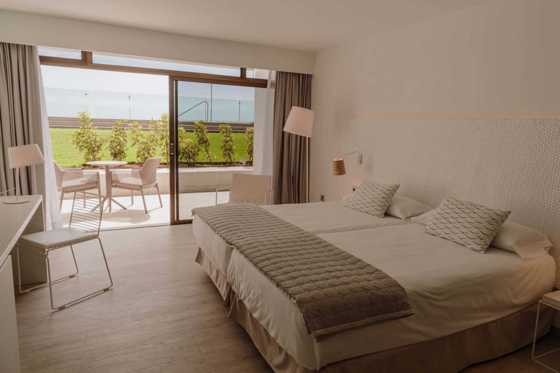Kahden hengen huone, rannan puolella, maaterassi ja merinäköala. Terassilla on aurinkotuolit. Huoneissa on osittain himmeä lasiseinä wc/suihkutilan ja huoneen välillä. Yksi parivuode tai kaksi erillistä vuodetta. Maksuton wifi ja ilmastointi. Tallelokero lisämaksusta. Minibaari lisämaksulla. Tv kansainvälisillä kanavilla. Hiustenkuivain. Kylpyhuoneessa suihku ja wc. Siivous 7 krt/viikko.