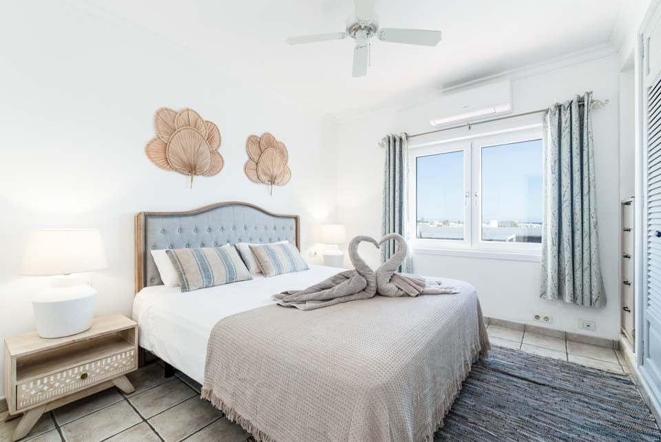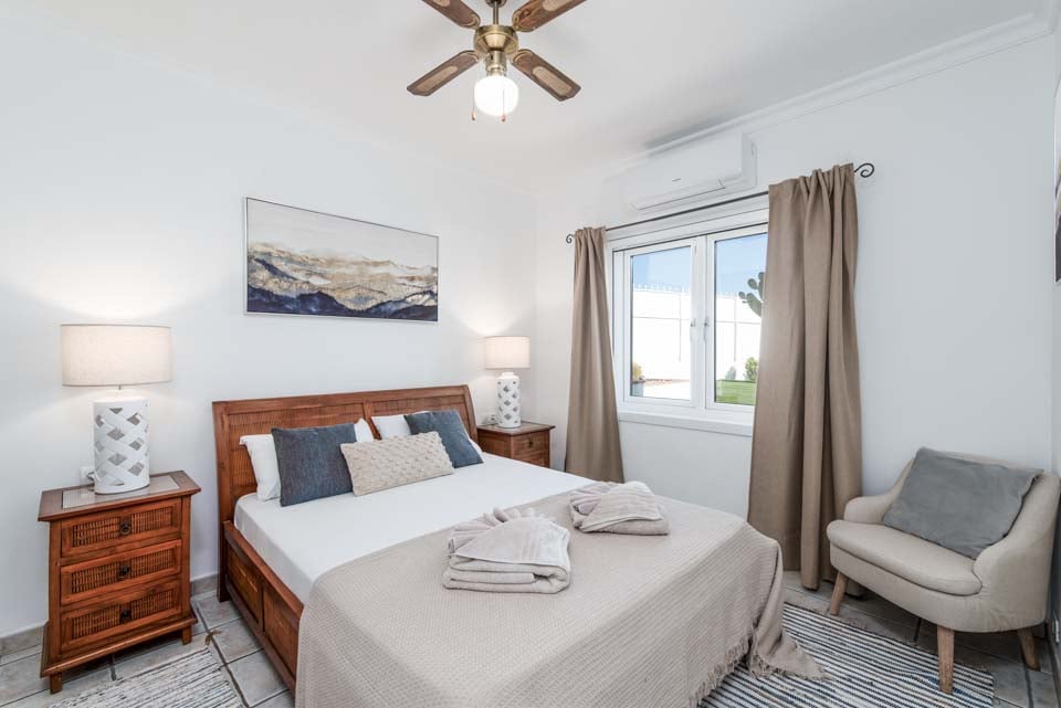 King size -vuode, ilmastointi, kattotuuletin, tuuletin
