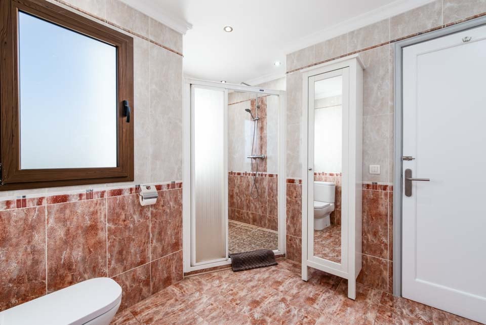 Huvilaan pääsee 80 cm leveää polkua pitkin, jossa on kahdeksan askelmaa. Etuoven leveys on 70 cm ja terassille johtavan oven leveys 100 cm. Uima-altaalle on 10 askelmaa alas. Allasalue on tasainen ja laatoitettu, mutta tämä huvila on useissa kerroksissa. Sisällä on kaksi sisäistä askelmaa oleskelutilaan. Alakerran makuuhuoneen ovet ovat 70 cm leveitä, samoin kuin suihkuhuoneen ovi. Pohjakerroksen lisärakennukseen on 12 askelmaa. Keittiön/ruokailutilan ovi on 70 cm leveä ja olohuoneen ovi on myös 70 cm leveä. *Huomaa, että vaikka olemme pyrkineet kaikin keinoin varmistamaan annettujen tietojen paikkansapitävyyden, virheitä voi esiintyä. Jos haluat lisätietoja huvilasta, ota rohkeasti yhteyttä.