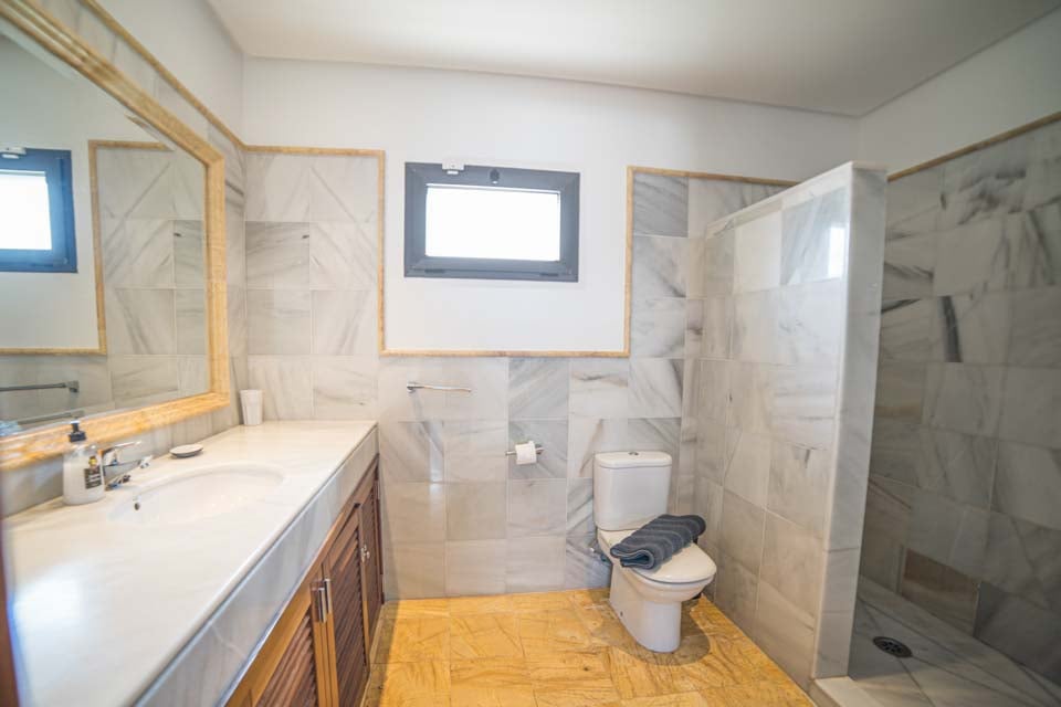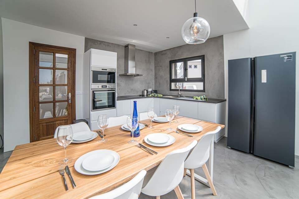 Olemme syvästi vaikuttuneita upeasta modernista arkkitehtuurista, joka on yhdistetty espanjalaisiin elementteihin ja kimaltelee auringonpaisteessa. Koko huvilassa vallitsee moderni ja elegantti tyyli, ja kaikki kalusteet on huolellisesti valittu luomaan seesteinen ja ylellinen tunnelma. Avoin olohuone on viihtyisä ja viihtyisä, ja tyylikäs olohuone sopii yhteen tyylikkäästi viimeistellyn keittiön kanssa. Suurten lasi-ikkunoiden ympäröimää tilaa reunustavat kauas ulottuvat rannikkomaisemat. Kolme tilavaa makuuhuonetta, joista yksi on perhehuone kahdella parivuoteella, tekevät tästä täydellisen unelmapaikan pienelle perheelle.