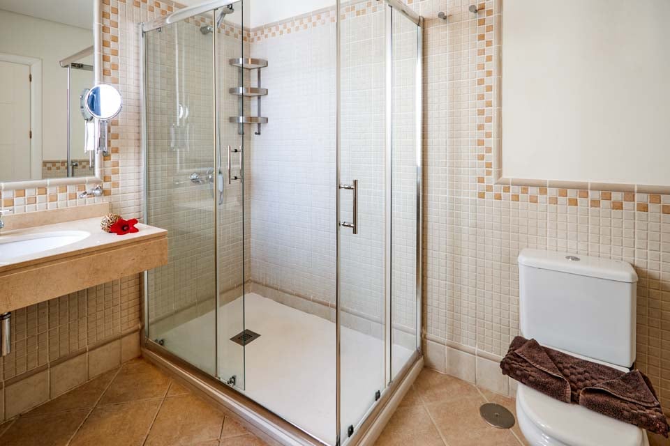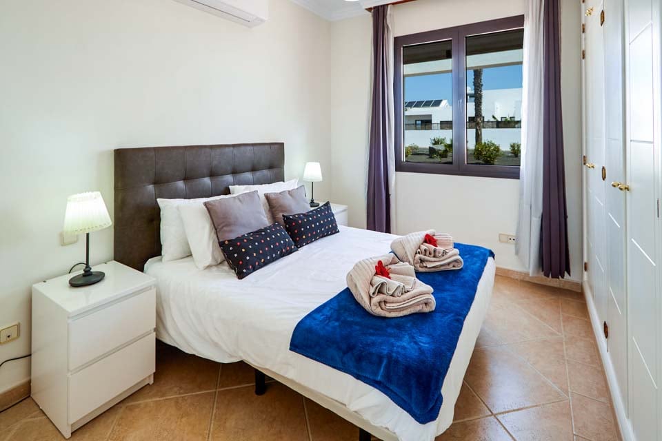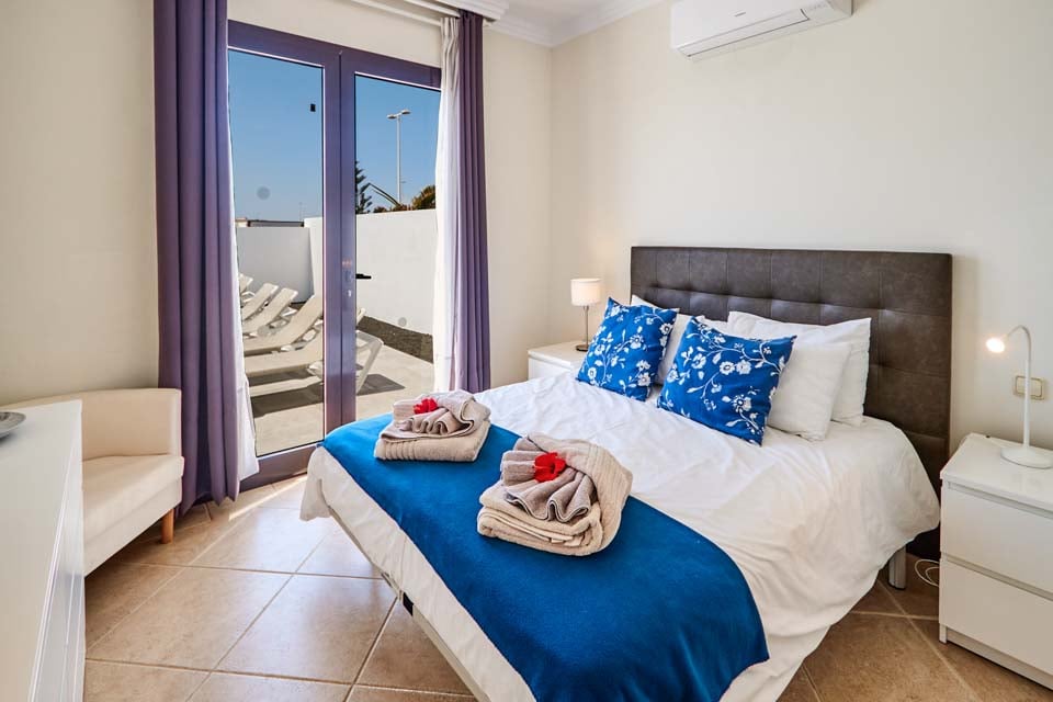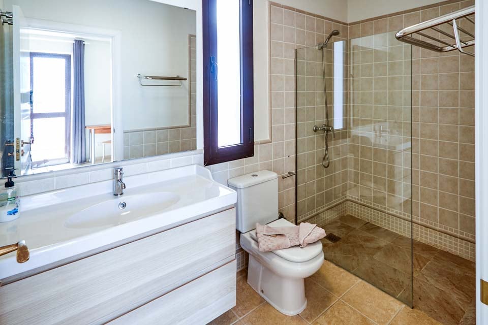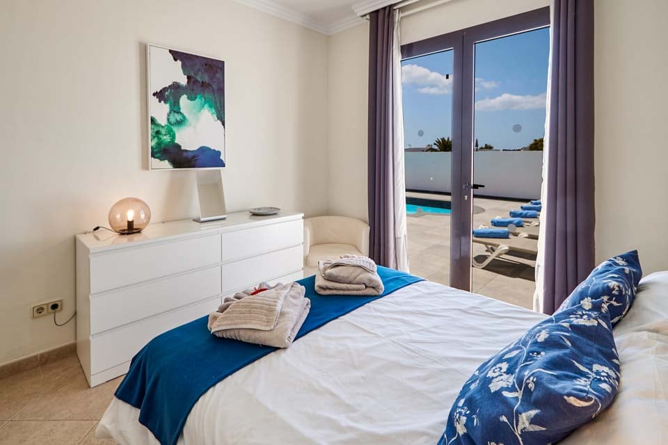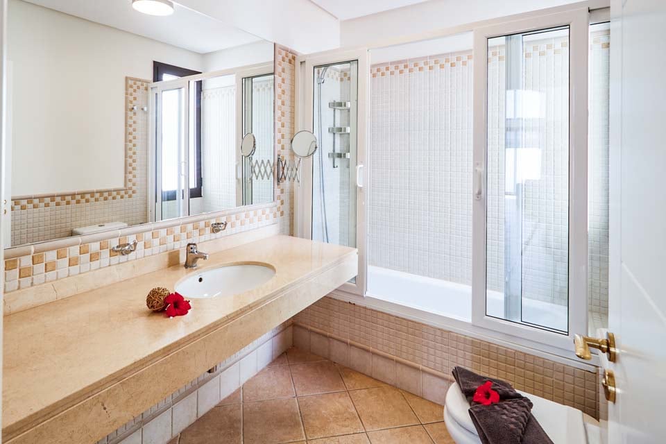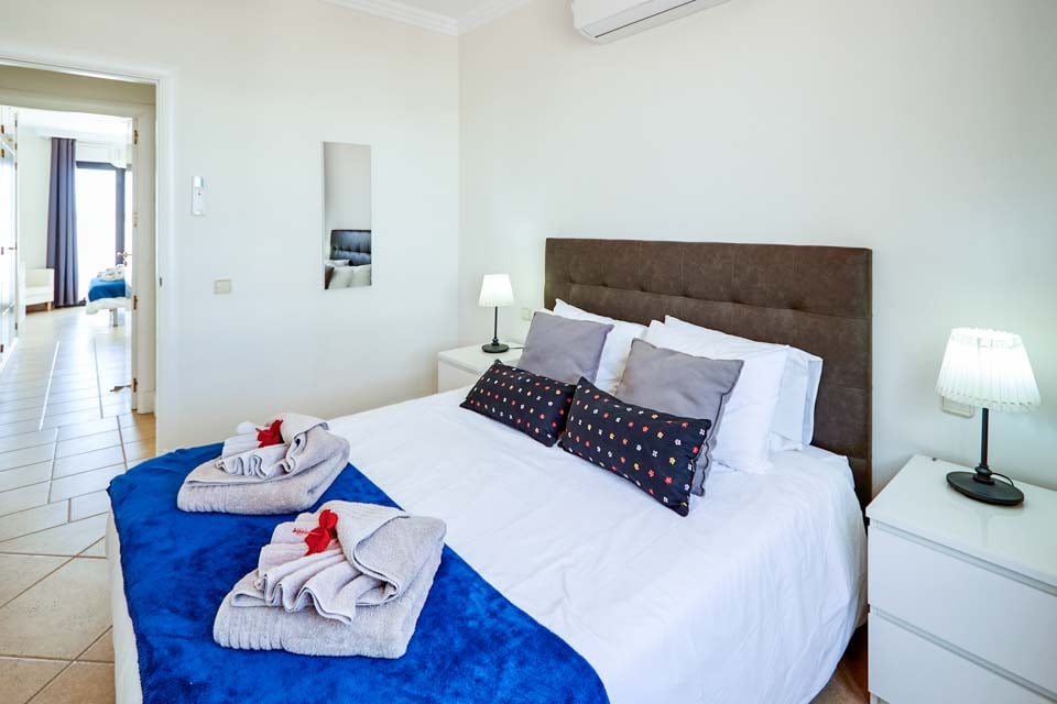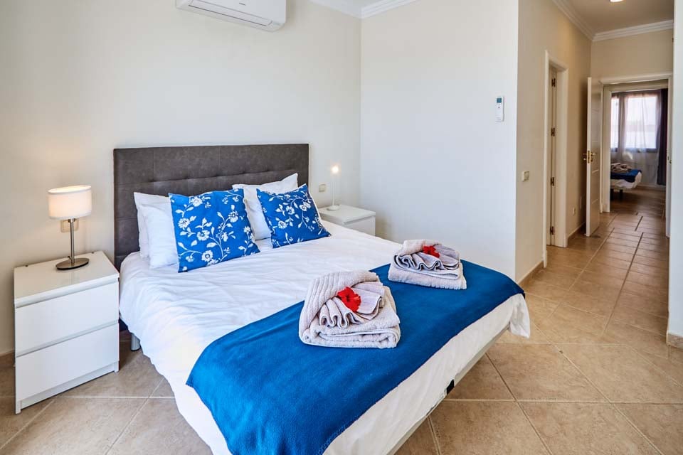 Makuuhuoneita on yhteensä neljä, joista kahdessa on king-size-vuoteet ja kahdessa erilliset vuoteet. Kaikissa on ilmastointi*. Päämakuuhuoneessa on myös oma suihkuhuone ja ovet terassille. Kolme muuta makuuhuonetta jakavat kaksi erillistä kylpyhuonetta, joista toisessa on kylpyamme ja toisessa suihku.