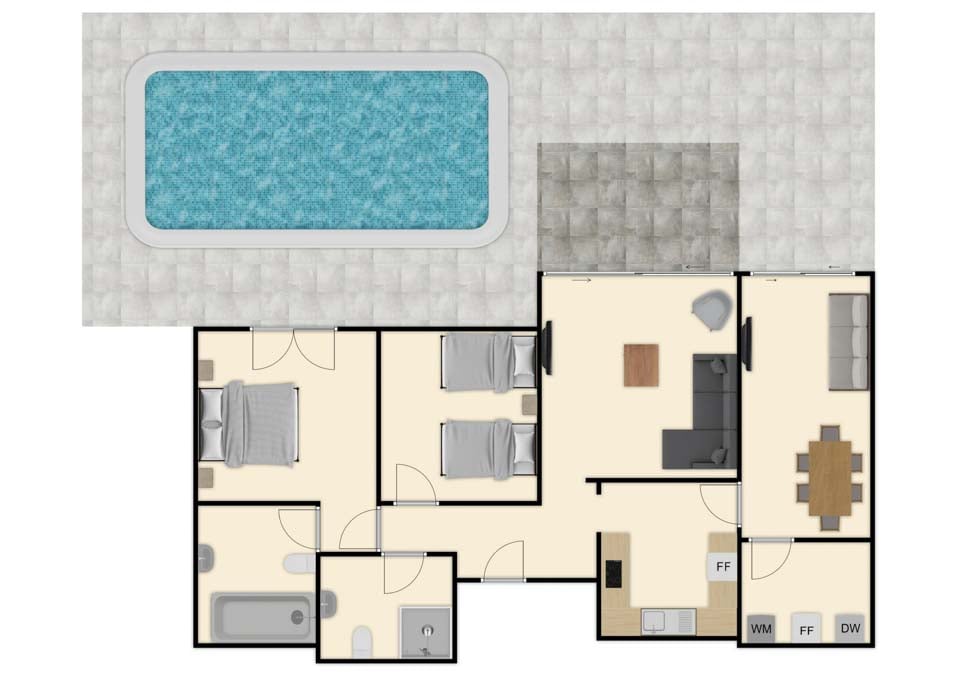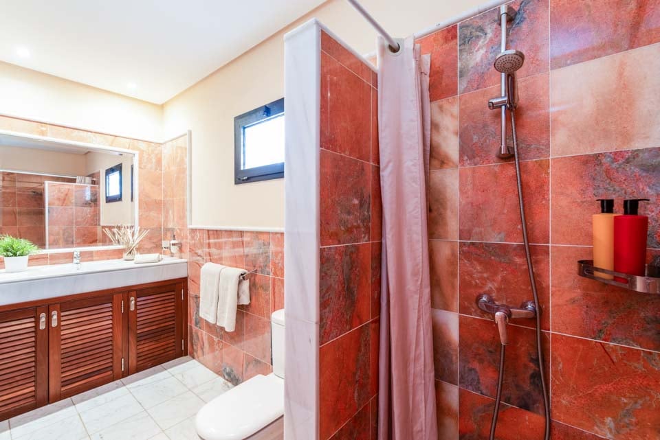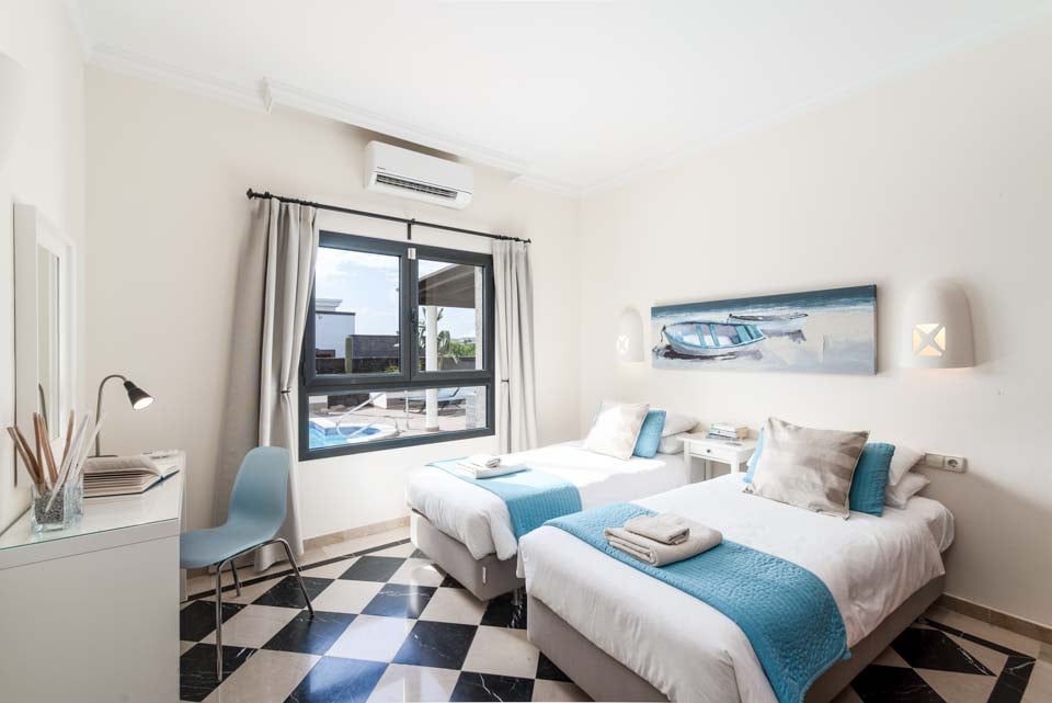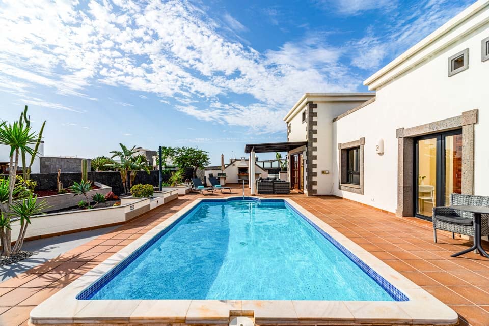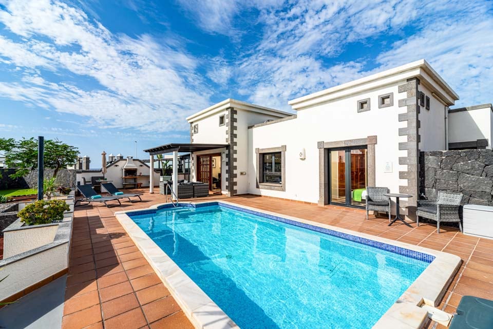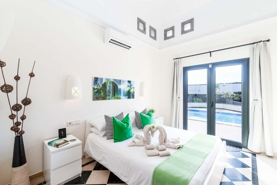 Sisältä huvila on kodikas ja varustettu kaikilla tarvittavilla mukavuuksilla, jotka tekevät omatoimisesta lomastasi mahdollisimman helpon, kuten kodinhoitohuoneella ja ilmaisilla allaspyyhkeillä. Muista varata päämakuuhuone, jonka lasiovet avautuvat terassille, ja oma kylpyhuone.