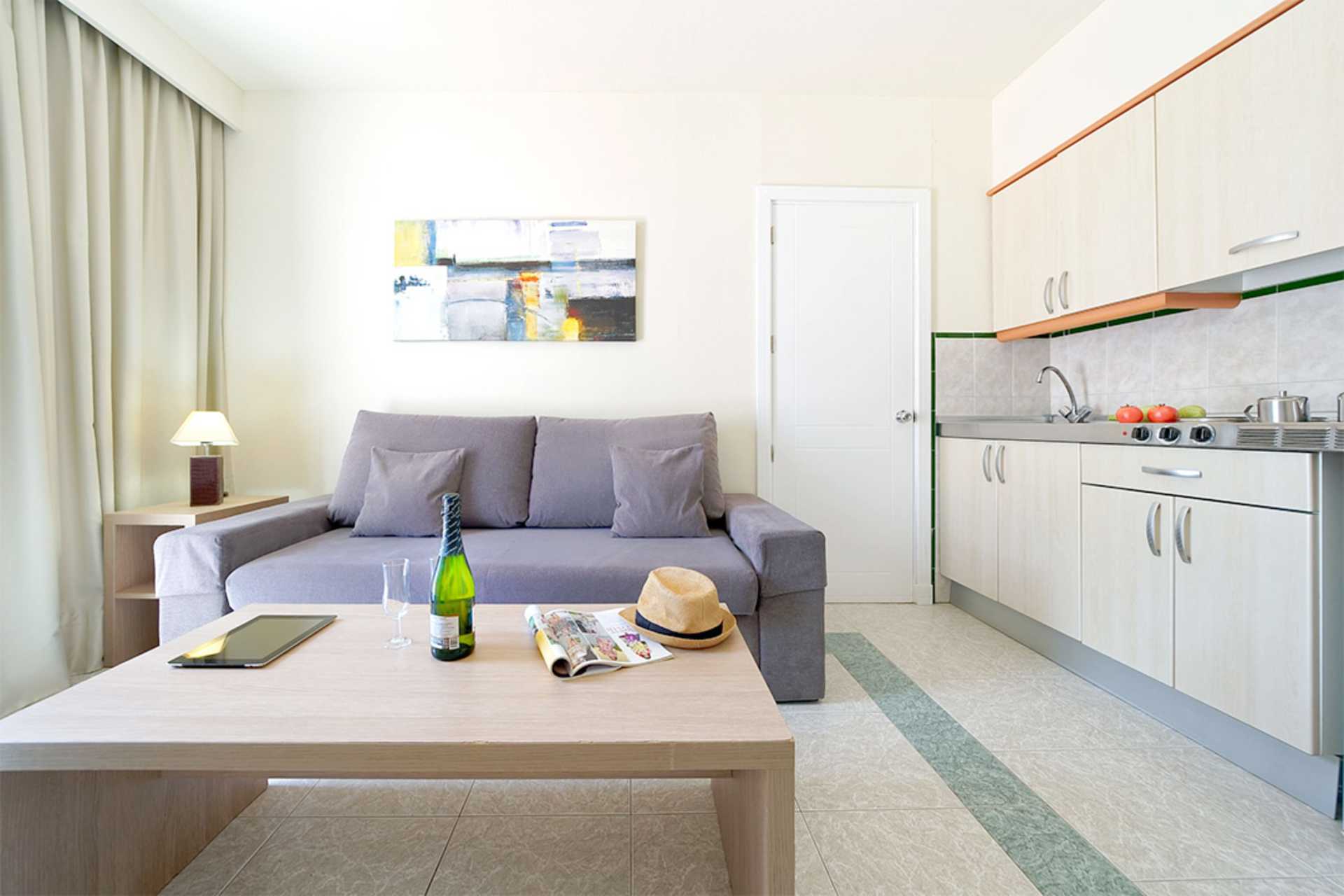 Kaksio bungalowissa, maaterassi. Makuuhuone sekä yhdistetty olohuone ja minikeittiö. Kaksi yhden hengen sänkyä. Lisävuodemahdollisuus vuodesohvasta. Minikeittiö, jossa jääkaappi, keittolevyt, mikroaaltouuni, kahvinkeitin, vedenkeitin ja peruskeittiövälineet. Maksuton wifi. Ilmastointi ja tallelokero lisämaksusta. Tv kansainvälisillä kanavilla. Hiustenkuivain. Amme ja wc. Siivous 3 krt/viikko. Alle 2-vuotiaat lapset lasketaan lisävuoteella majoittuviksi henkilöiksi.