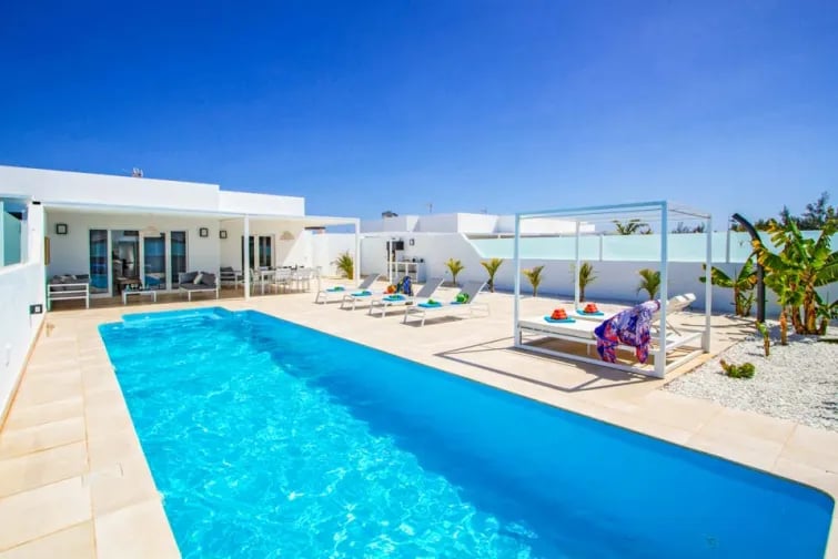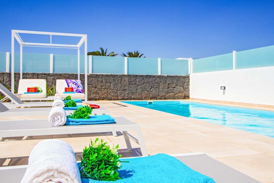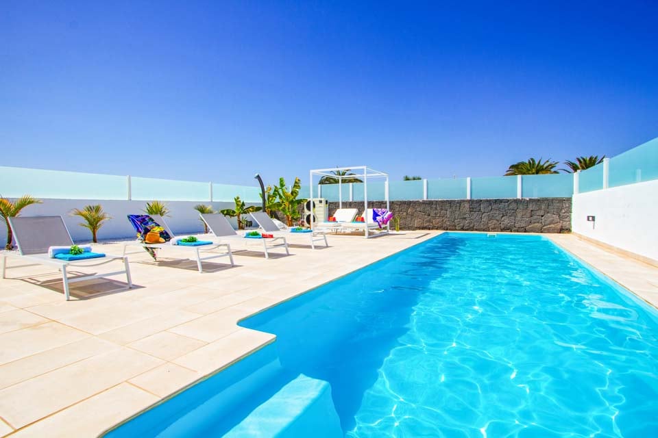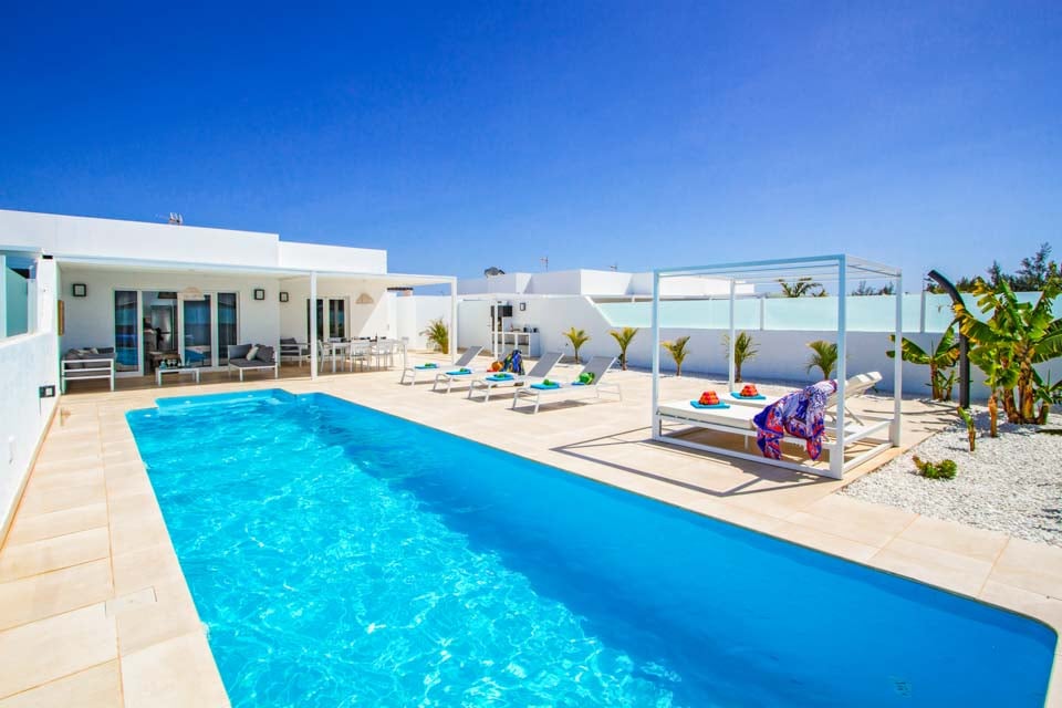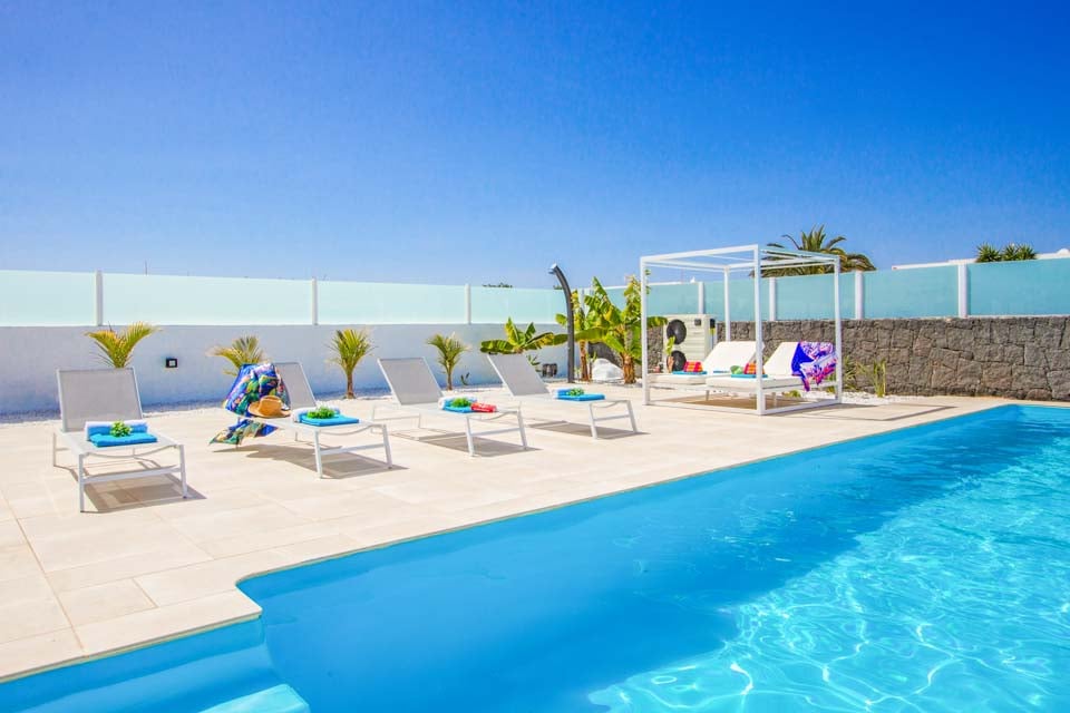 Päämakuuhuoneesta omalla kylpyhuoneella ja olohuoneesta on käynti tyylikkäästi maisemoidulle uima-allasterassille, jossa on pergola, ulko-oleskelutila ja ruokailutila. Tiilinen grilli, ulkoallas ja työtila sopivat täydellisesti kaikkiin ulkoilmaruokailun tarpeisiin, ja lämmitetyn uima-altaan ympärillä on useita moderneja aurinkotuoleja. Terassilla on jopa pöytätennispöytä, ja se on täydellinen paikka rentoutua ja ottaa aurinkoa päivällä ja katsella kauniita Lanzaroten auringonlaskuja illalla.