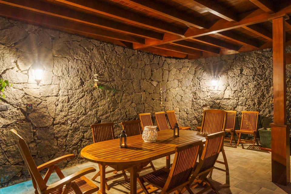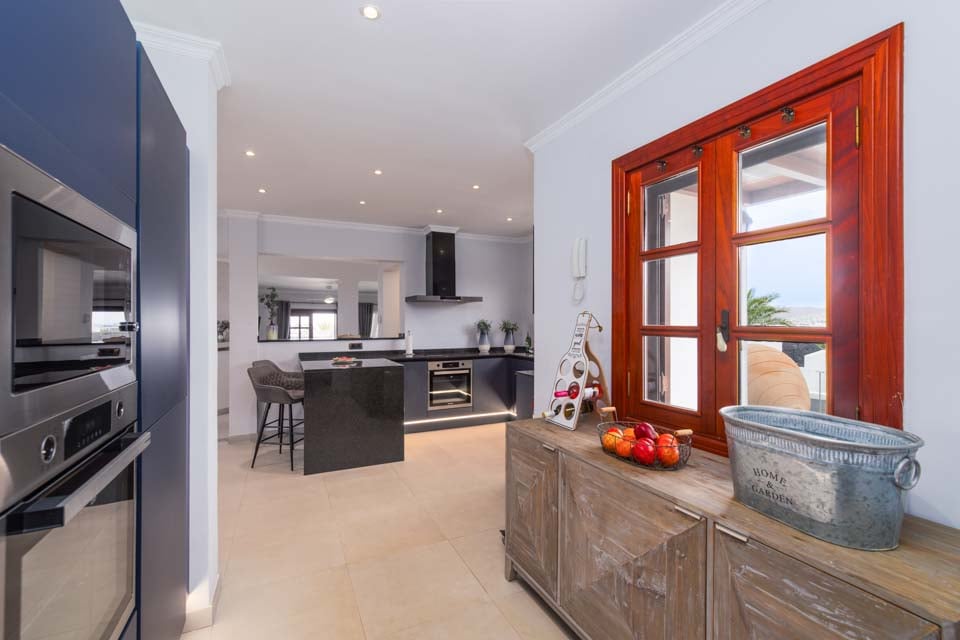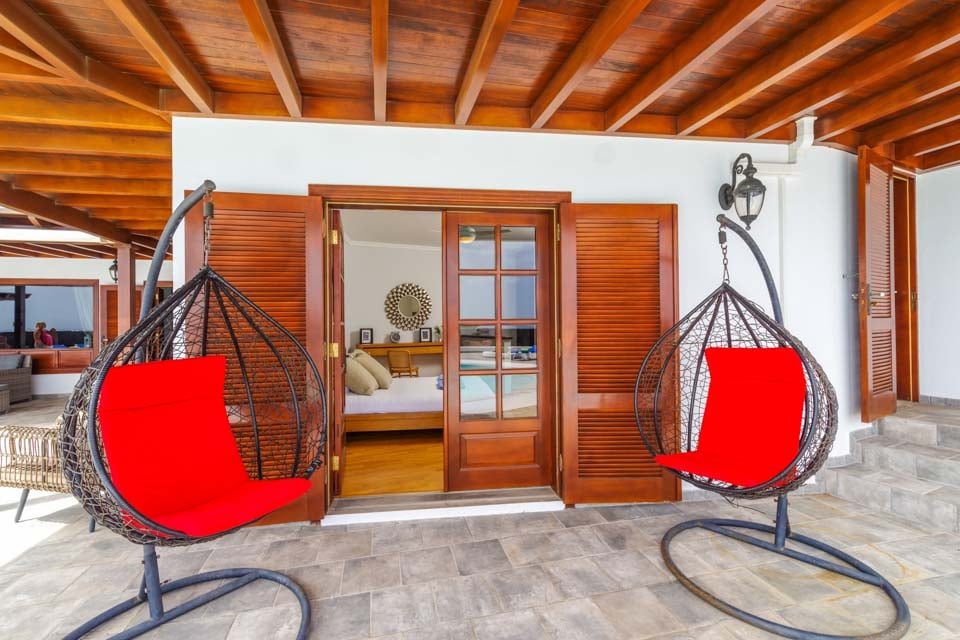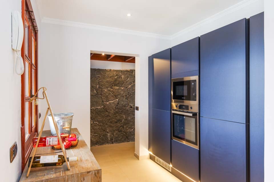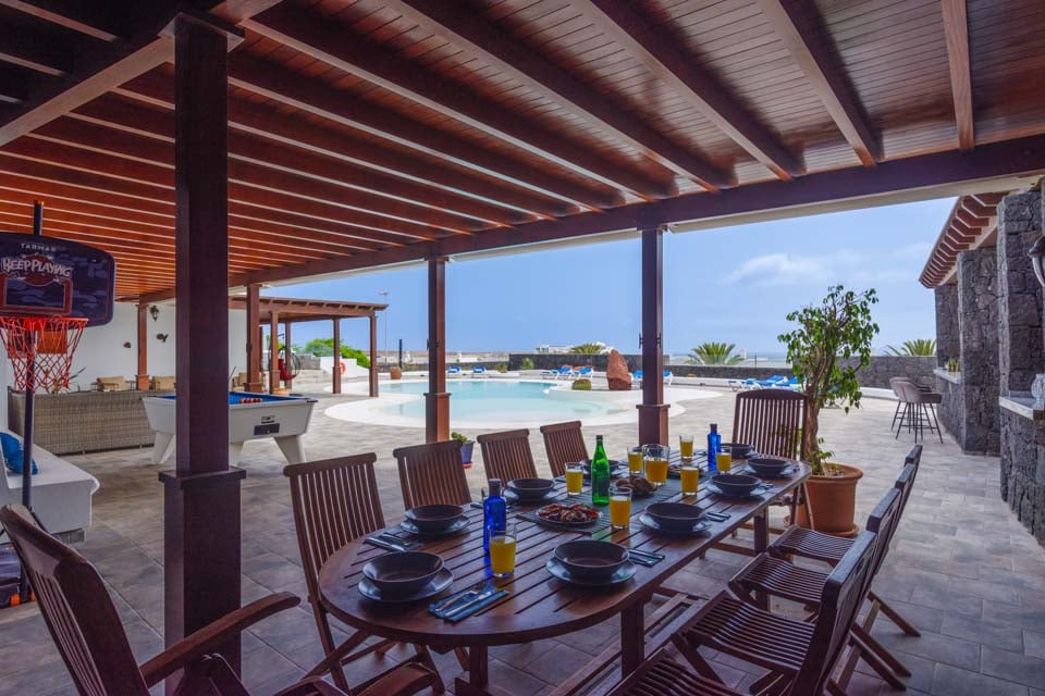 18-metrinen, kimaltelevan sininen ja kuplan muotoinen uima-allas teki meihin valtavan vaikutuksen. Tämä uima-allas todellakin vangitsee katseen ja on ihanteellinen paikka vilvoitella keskipäivän auringossa tai polskia lasten kanssa. Lisäbonuksena uima-allas on lämmitetty ilmaiseksi ympäri vuoden. Aurinkotuoleja on runsaasti, joten voit nauttia loputtomista auringonpaisteesta ja samalla täydentää rusketustasi kimaltelevan auringon alla. Lisärentoutumispaikkaa varten on terassilla sijaitseva poreallas, josta on upeat panoraamanäkymät merelle Atlantin yli. Palkkien kattaman terassin alta löydät mukavat riipputuolit, rottinkisohvat ja suuren ruokapöydän. Ulkona kokkaamiseen on täysin varusteltu ulkokeittiö, jossa on savipizzauuni, tiilistä rakennettu grilli, uuni, liesi ja jääkaappi. Nauti ulkoilma-aterian valmistamisesta ystävien ja perheen kesken. Tarjoiletko perinteistä paellaa vai erilaisia tapaksia kaikkien nautittavaksi? Isommille lapsille on jopa biljardipöytä omaa viihdettä varten.