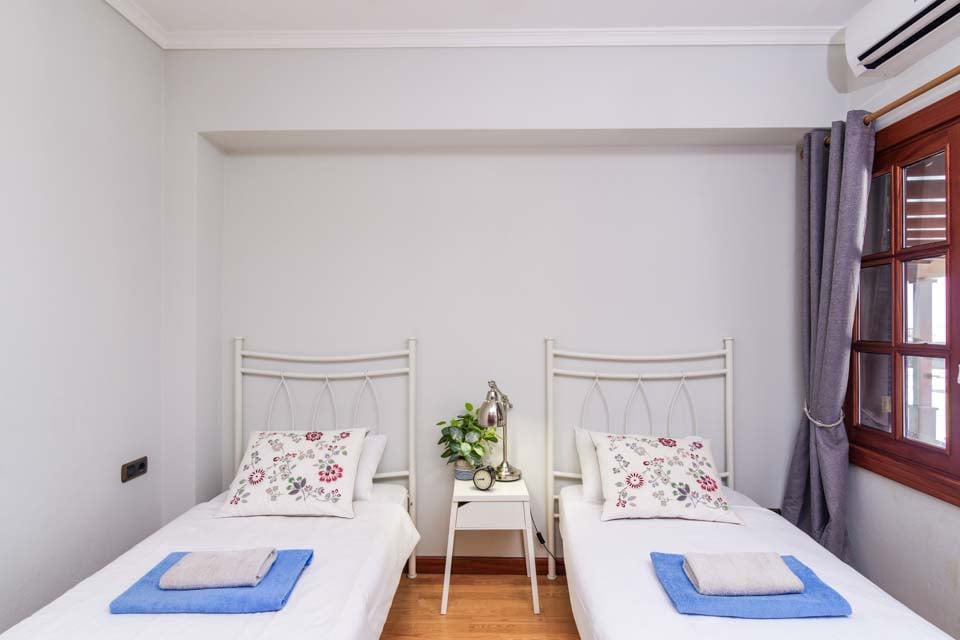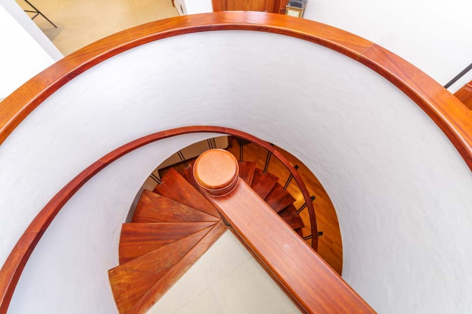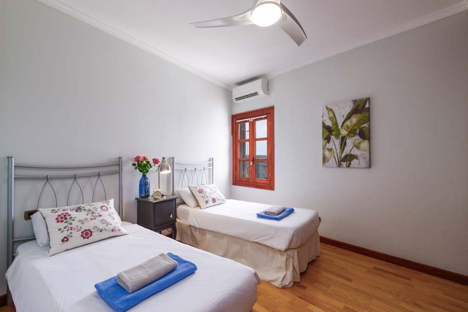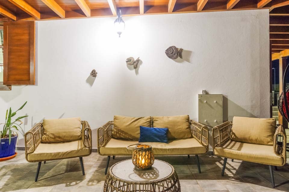 Sisätiloissa on korkeatasoinen sisustus, boheemit ja tyylikkäät huonekalut sekä huippuluokan keittiö, jossa on kaksi uunia. Keittiö johtaa suurelle ruokapöydälle ja sieltä vain kolme askelmaa alas kahteen tasoon jaettuun mukavaan olohuoneeseen, jossa on älytelevisio. Päämakuuhuoneessa on king-size-vuode, suora pääsy patiolle ja suuri kylpyhuone, jossa on kaksi pesuallasta ja rentouttava kylpyamme. Alakerrassa on vielä kolme makuuhuonetta, yksi oma kylpyhuone ja kaksi makuuhuonetta erillisillä vuoteilla. Kaikissa pohjakerroksen makuuhuoneissa on viileä ilmastointi. Kierreportaat johtavat alas pohjakerrokseen, josta löytyy viimeinen makuuhuone, jossa on kattotuuletin ja pääsy omaan kylpyhuoneeseen. Tässä kerroksessa on myös toinen oleskelutila, joten se on ihanteellinen niille, jotka haluavat hieman lisätilaa perhelomalla.