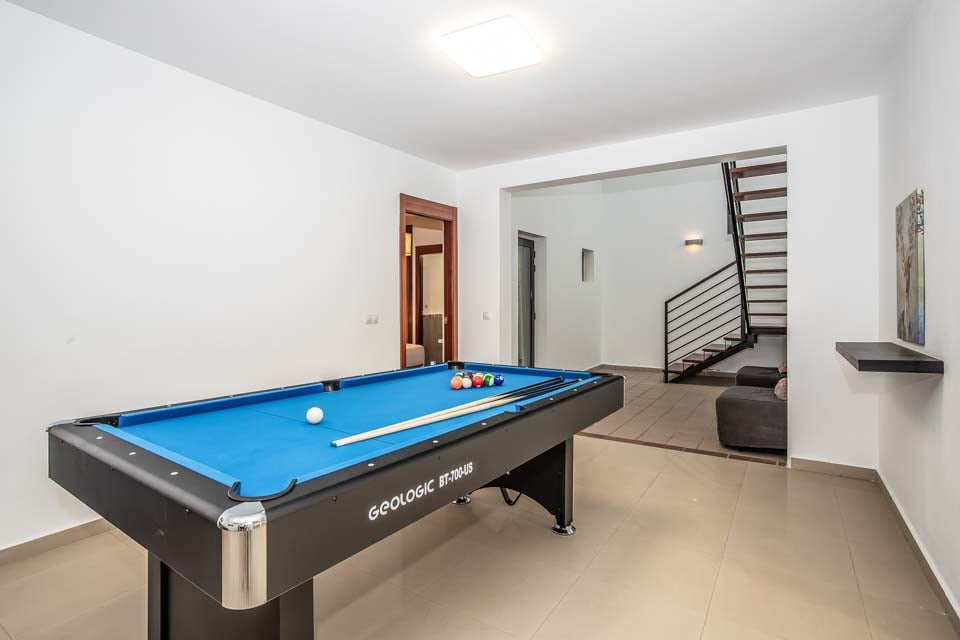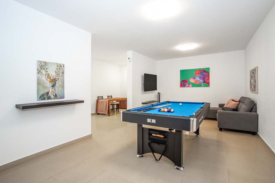 Biljardipöytä, Pöytätennis, Älytelevisio, Sohva, Ovet terassille