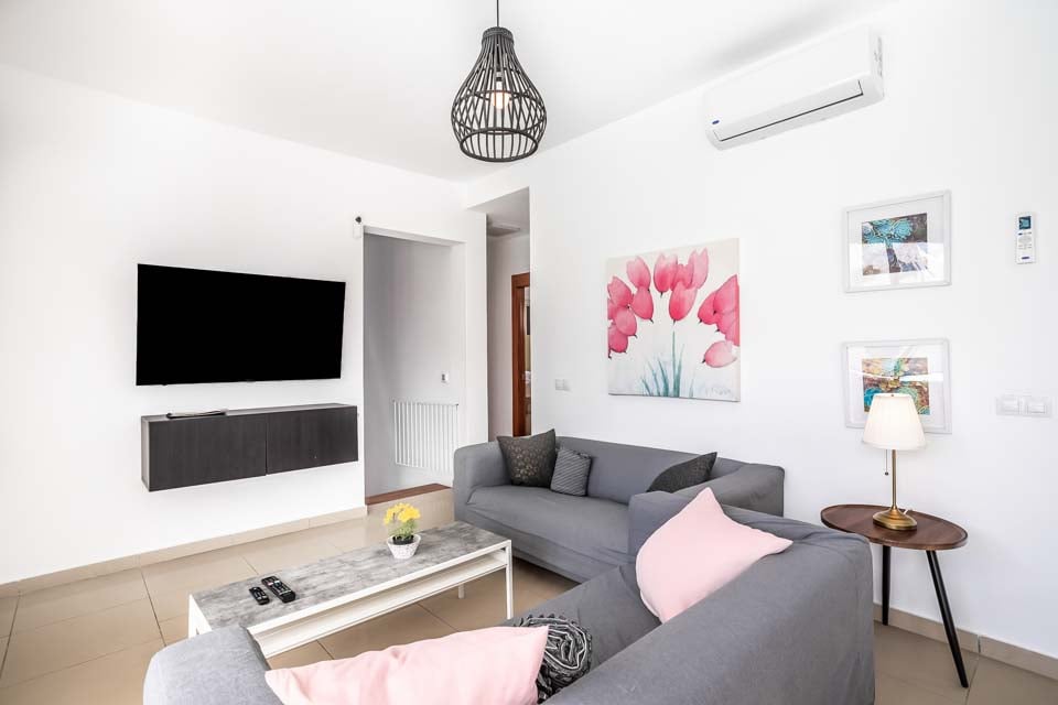 Mukava oleskelutila, älytelevisio, ruokailutila, ovet terassille