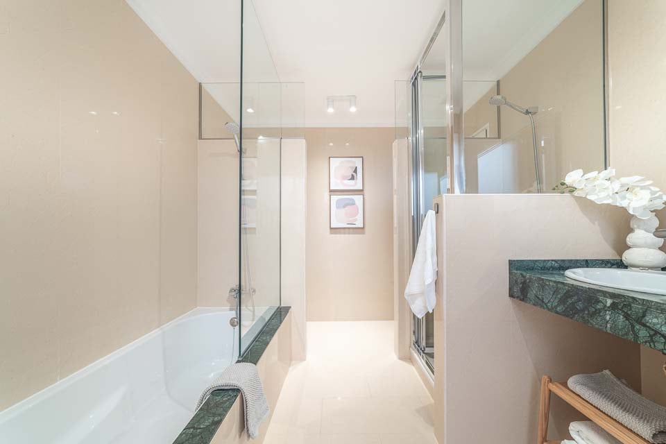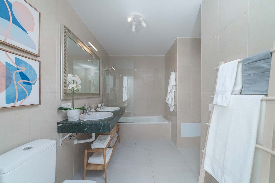 Kylpyamme suihkulla, Suihku, Pesuallas, Kaksoissuihku, Kaksoispesualtaat, WC, Bidee
