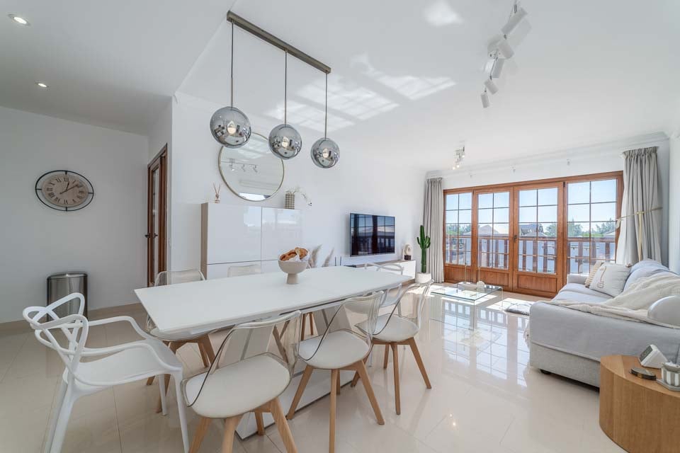 Ruokailutilat, sohva, älytelevisio, avoin pohjaratkaisu, ovet terassille