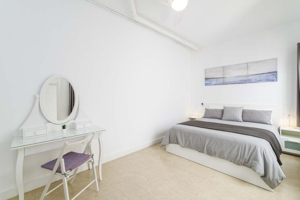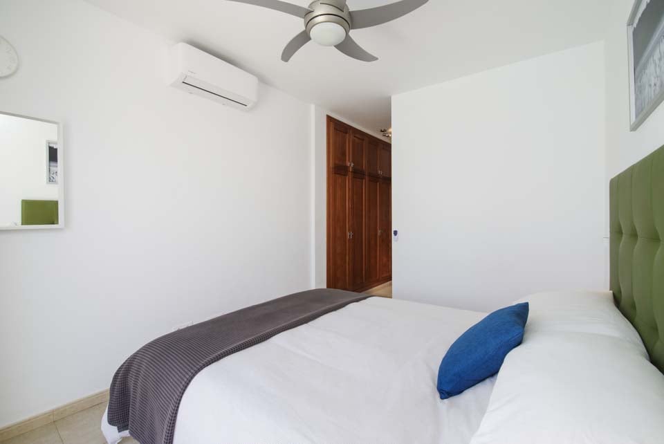 King size -vuode, kattotuuletin, ilmastointi
