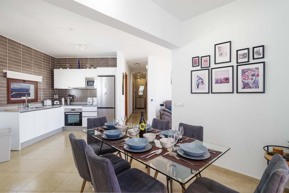 Sisältä huvila on moderni, ja siinä on avoin olohuone ja keittiö, jossa on älytelevisio ja lasiovet, jotka päästävät sisään runsaasti luonnonvaloa. Pohjakerroksessa on kolme makuuhuonetta, joissa kaikissa on ilmastointi mukavuuttasi varten. Pohjakerroksessa on katettu käynti sisäportaikkoon, joka johtaa alempaan kerrokseen. Siellä on kaksi muuta makuuhuonetta, joissa on myös ilmastointi, toinen olohuone, keittiö ja ruokapöytä. Tämä tila sopii erinomaisesti suuremmille ryhmille, jotka haluavat hieman lisätilaa omatoimisella lomallaan.