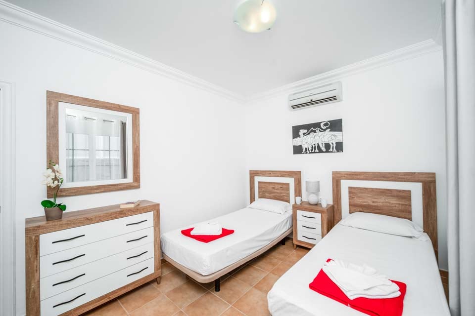 Tämä pohjakerroksen majoituspaikka sopii erinomaisesti pienemmille ryhmille ja siinä on kolme ilmastoitua makuuhuonetta. Ulkona oleva terassi on ihanteellinen paikka rentoutua auringon alla, sillä lepotuolit ympäröivät yksityistä lämmitettyä* uima-allasta. Lisäetuna uima-allas on myös puutarha-aidan ja pienen portin ympäröimä, joten uima-allas voidaan erottaa muusta terassista. Rentoudu tyylikkäästi kirkkaasti maalatun verannan alla lasillisen kotitekoista sangriaa kera tai nauti kilpapöytätenniksestä ystävien ja perheen kanssa. Sisällä tässä kodikkaassa mökissä on viihtyisä oleskelutila, jossa on ranskalaiset lasiovet terassille ja älytelevisio. Keittiö on tyyliltään moderni ja siinä on kaikki uusimmat kodinkoneet sekä pieni ruokapöytä. Yhteensä on kolme makuuhuonetta, kaksi kahden hengen huonetta erillisillä vuoteilla ja yksi parivuoteella. Kaikkien käytössä on erillinen suihkuhuone ja koko perheen kylpyhuone.
