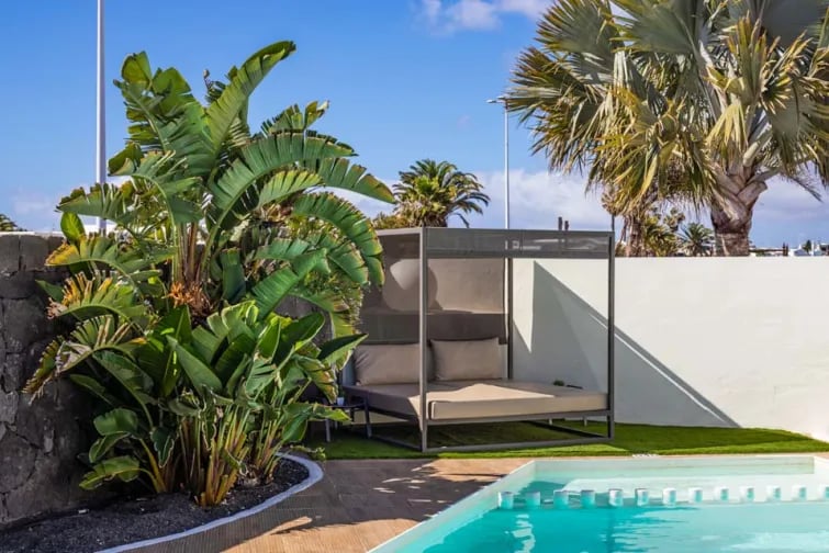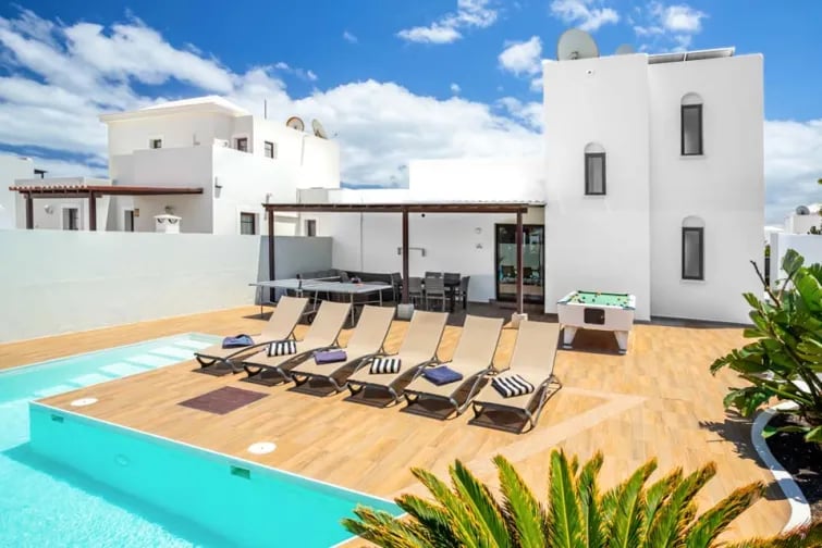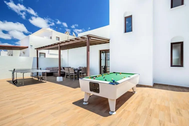 Olohuoneesta on pariovet ulko-oleskelutilaan. Tontin nurkassa on kaksi aurinkotuolia, ja ne on sijoitettu täydellisesti yksityisen, epäsymmetrisen uima-altaan ympärille (lämmitys sisältyy hintaan marraskuusta huhtikuuhun), ja altaan ja pylväiden erottama matalampi alue on erillään. Villan sivulla on pergola, joka tarjoaa lisävarjoa niille, jotka haluavat paeta Kanariansaarten auringosta. Villassa on myös biljardipöytä ja pingispöytä, joita perhe ja ystävät voivat pelata koko loman ajan.