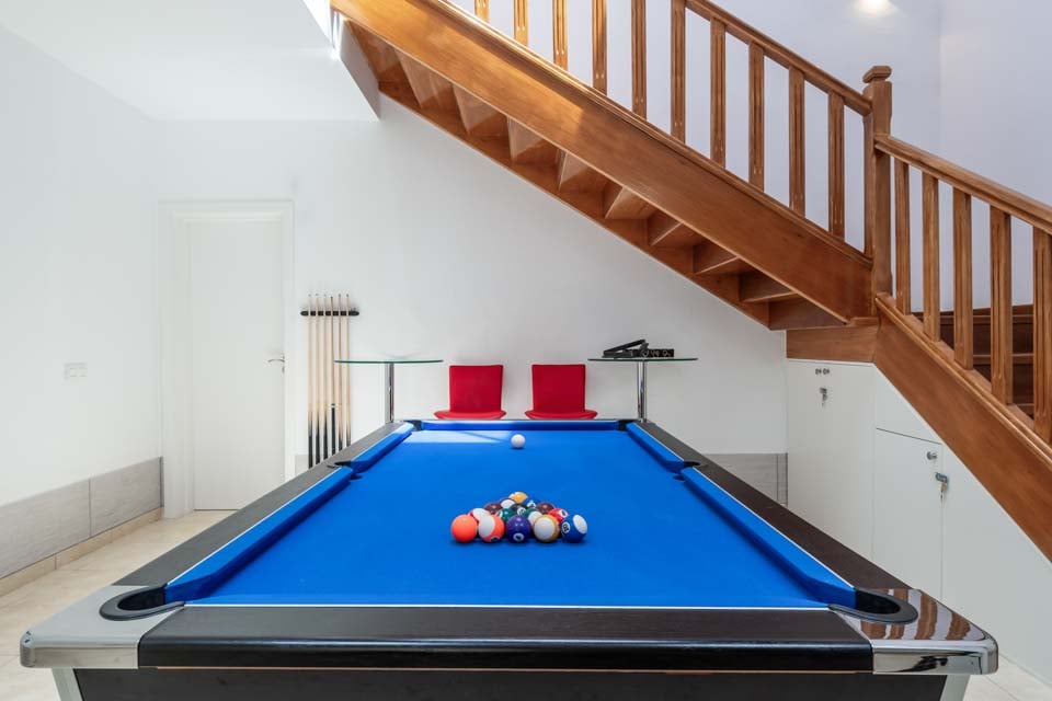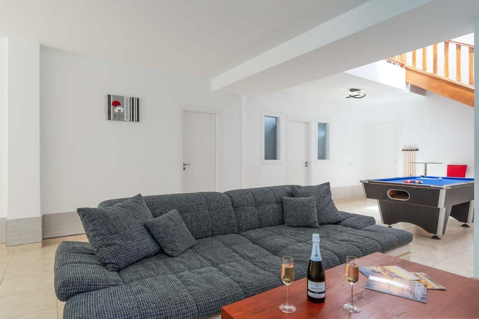 Mukava oleskelualue, älytelevisio, biljardipöytä, ovet terassille