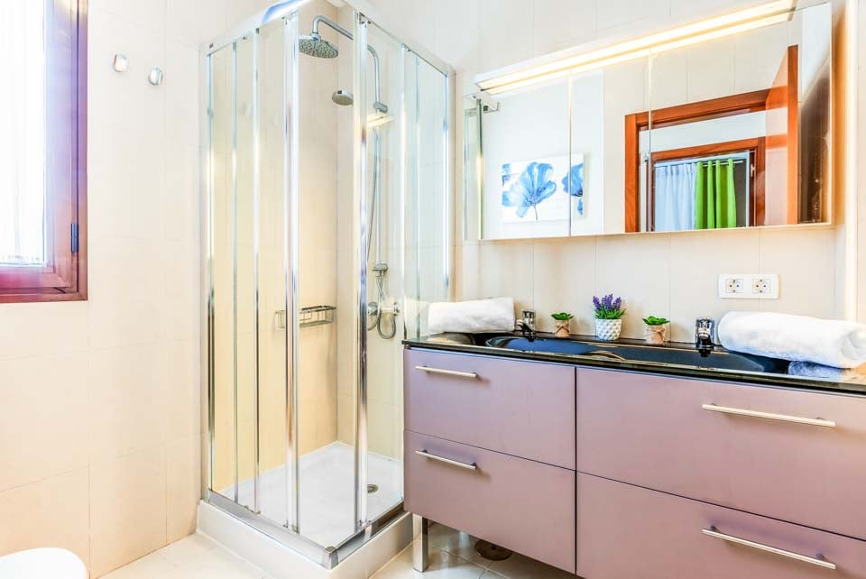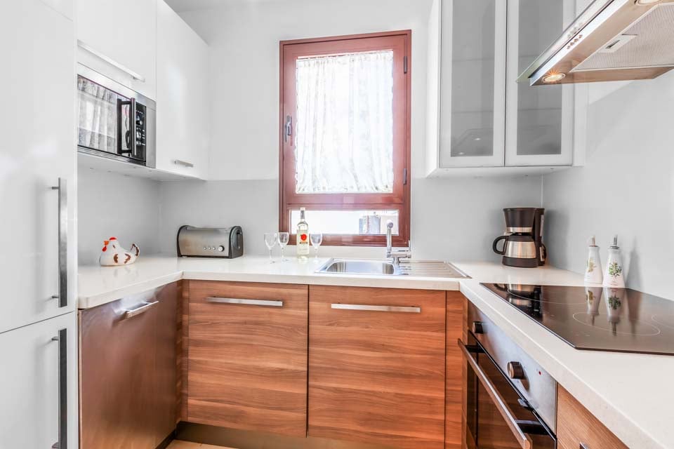 Jokainen huone on sisustettu huomaavaisesti viihtyisään tyyliin. Kahdessa kerroksessa sijaitsevassa alakerrassa on mukava ja avoin olohuone ruokailutiloineen, täysin varusteltu keittiö, kahden hengen makuuhuone omalla kylpyhuoneella ja kahden hengen makuuhuone erillisellä suihkulla. Portaat johtavat toiseen kerrokseen, josta löytyy päämakuuhuone, jossa on oma kylpyhuone ja oma terassi merinäköalalla. Makuuhuoneissa on ilmastointi mukavuuttasi varten, ja myös WiFi on käytettävissä.