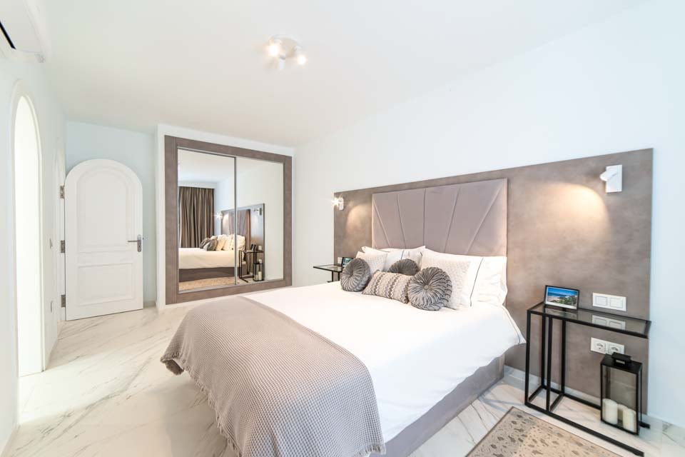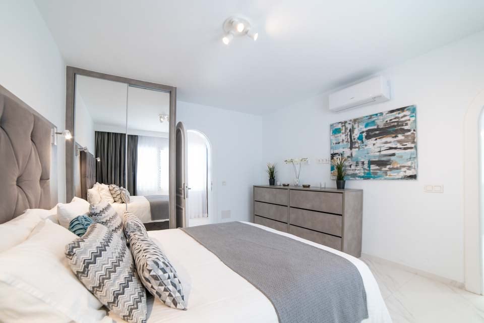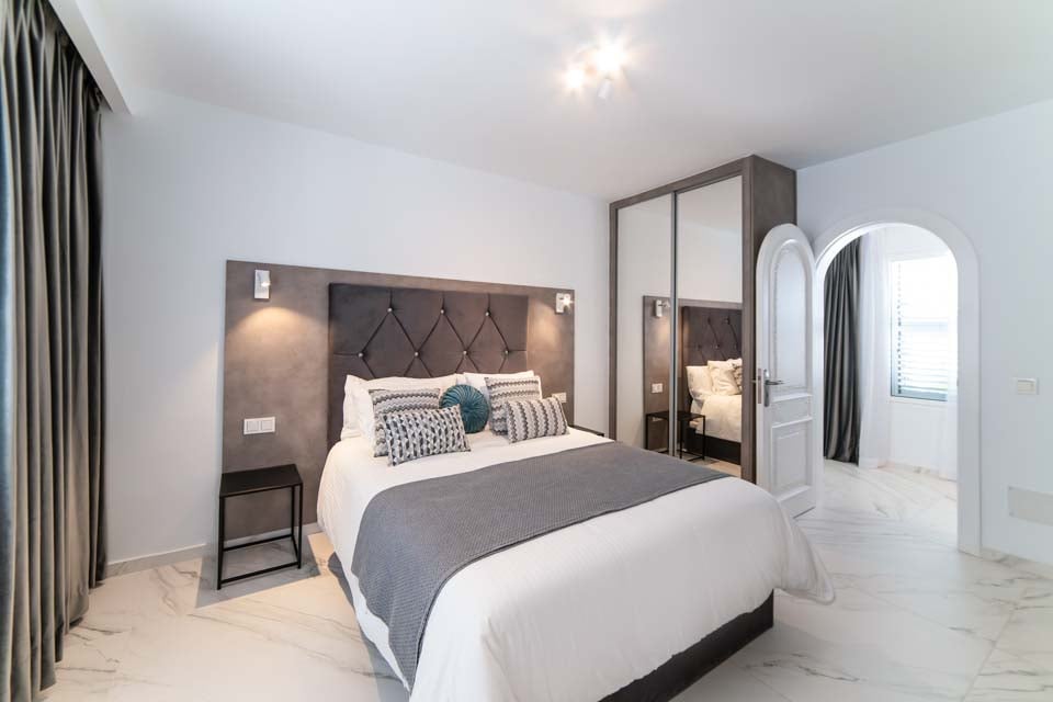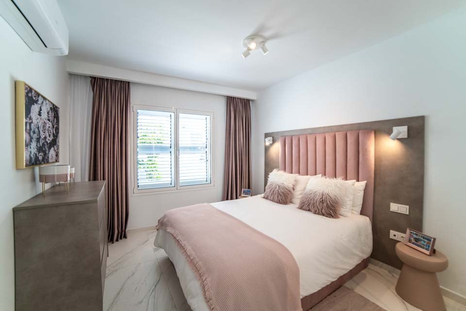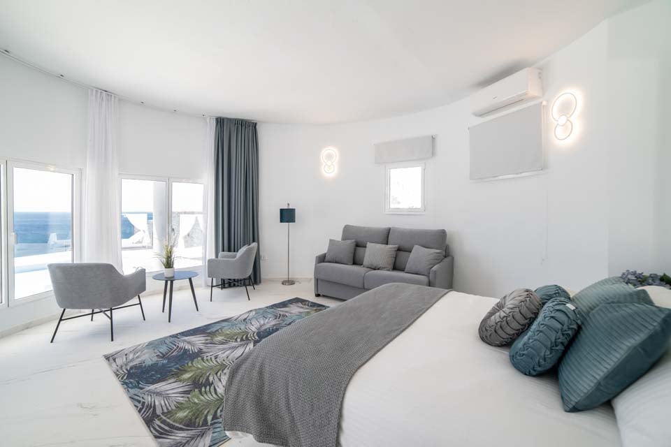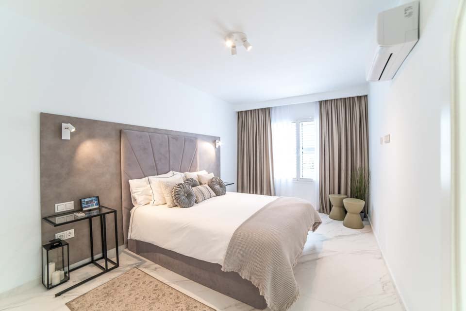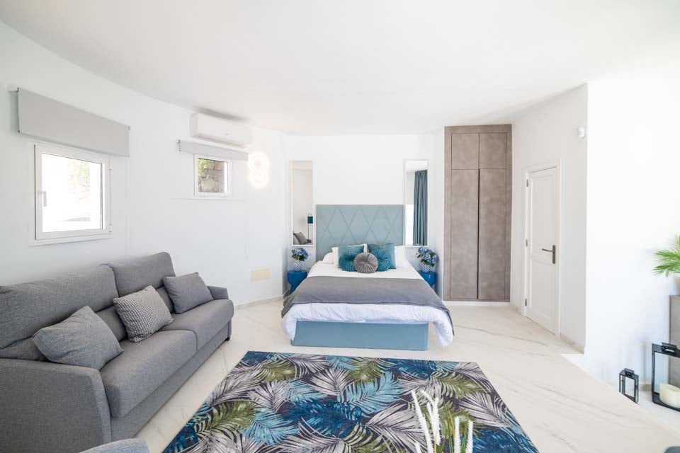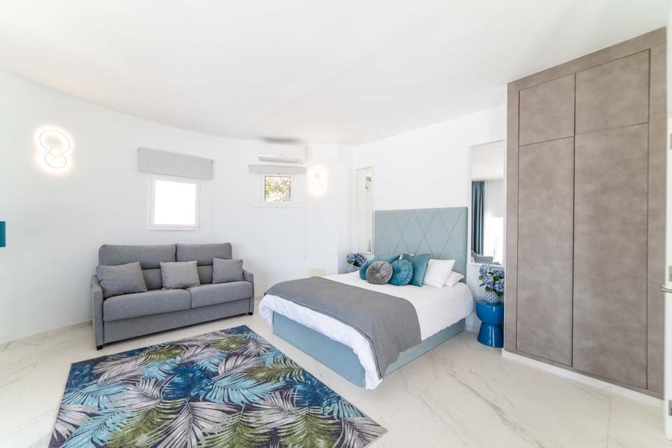 King size -vuode, ilmastointi, sohva, ovet terassille