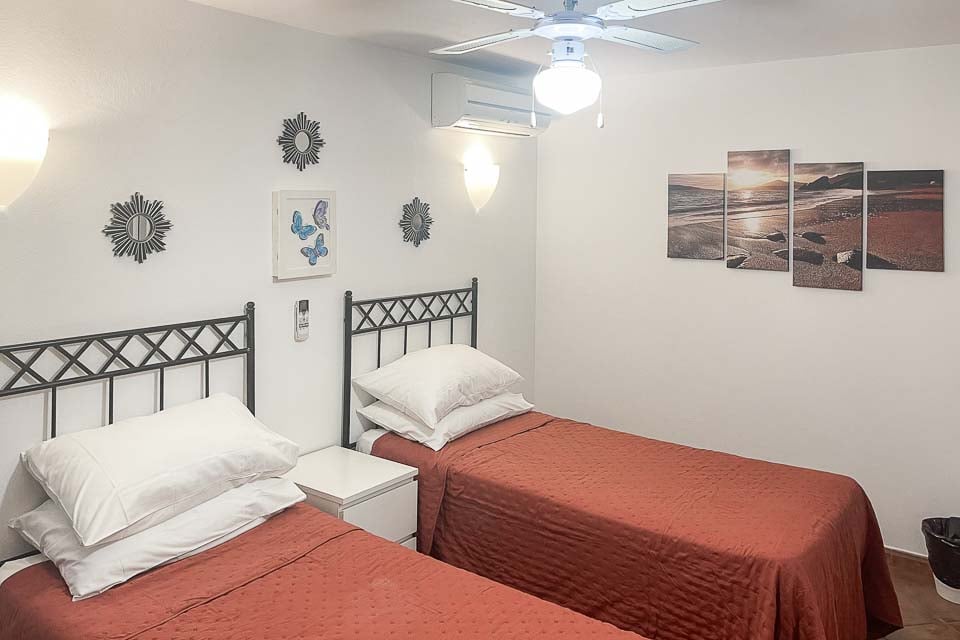 Ulkokäynti, Erilliset vuoteet, Jääkaappi, Ilmastointi, Kattotuuletin