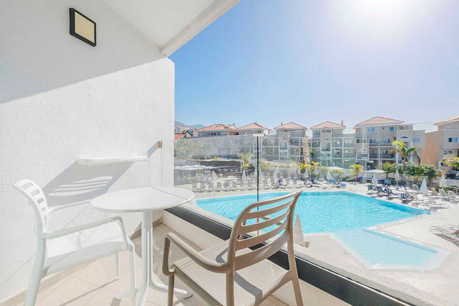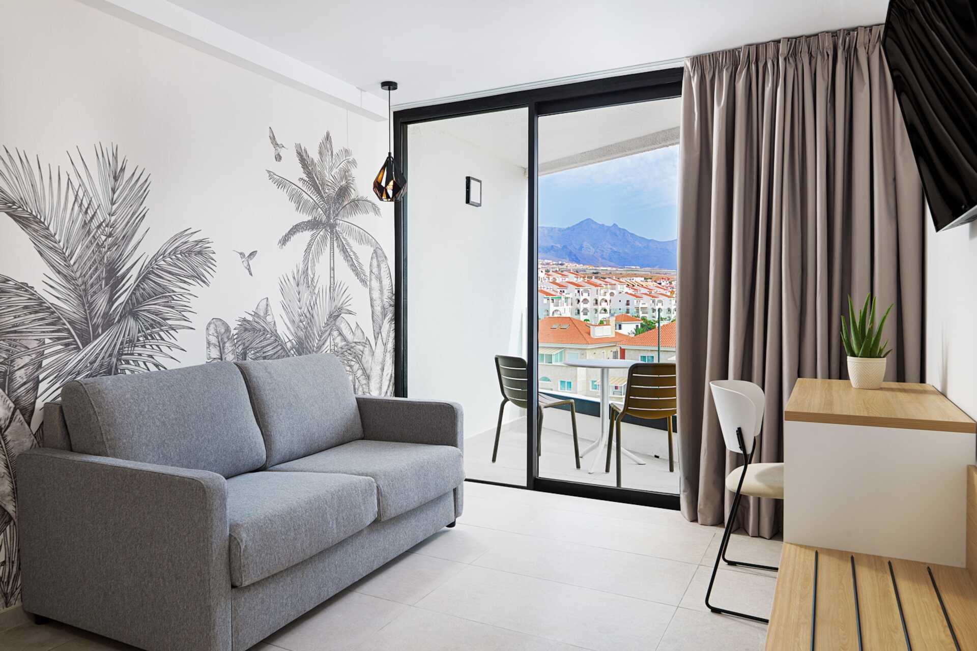 Sviitti, jossa on parveke. Sviitissä on makuuhuone, jossa on kaksi erillistä vuodetta, ja olohuone, jossa on mahdollisuus saada lisävuode vuodesohvaan. Wifi, tallelokero ja ilmastointi makuuhuoneessa sisältyvät hintaan. Pienemmät ns jäähdytin kylmille juomille. Kaksi televisiota kansainvälisillä kanavilla. Hiustenkuivain. Suihku ja wc. Siivous 7 krt/viikko. Alle 2-vuotiaat lapset lasketaan lisävuoteella majoittuviksi henkilöiksi.
