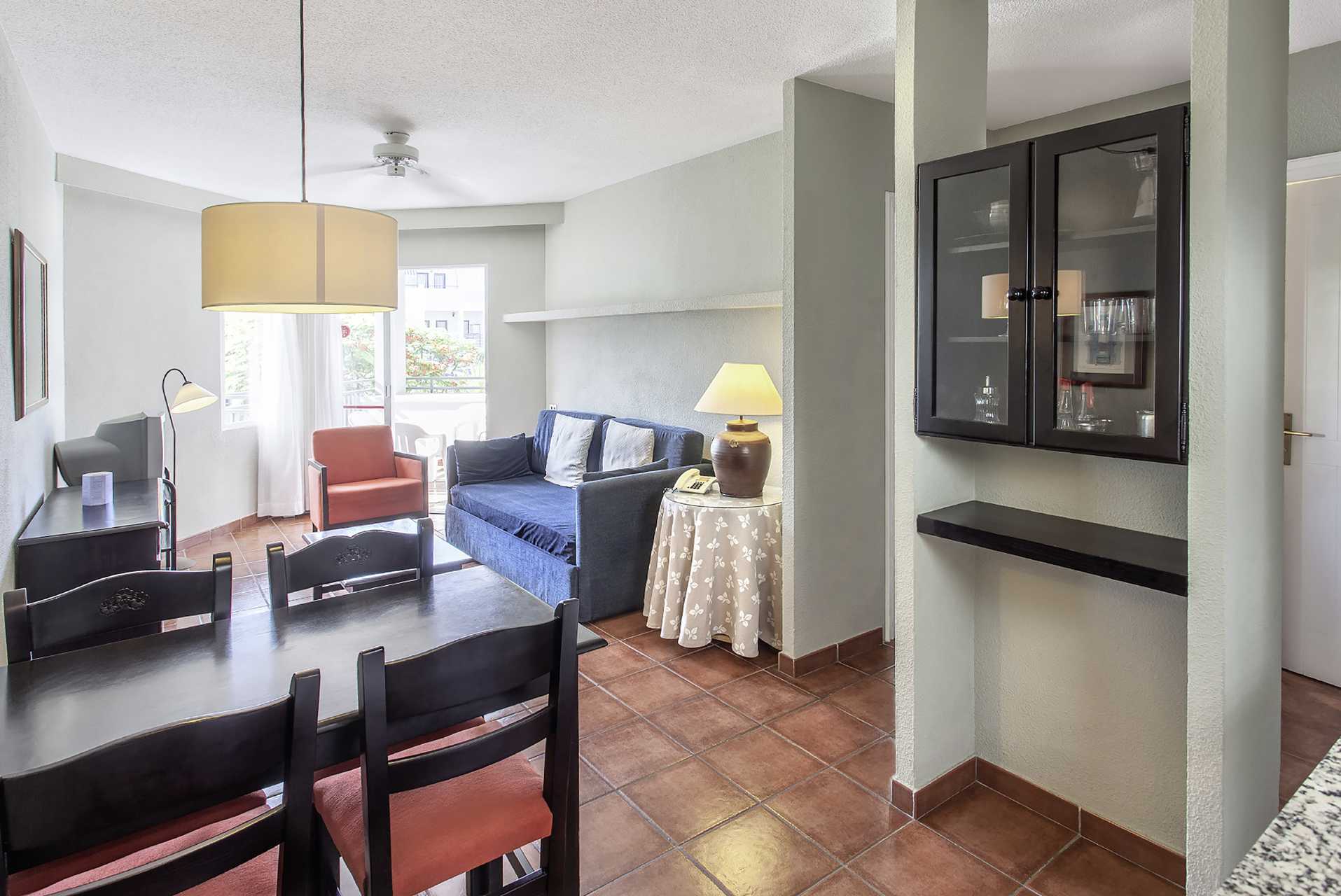 Yksinkertaisesti kalustettuja ja hieman kuluneita kaksioita, joissa erillinen makuuhuone ja yhdistetty olohuone ja minikeittiö. Parivuode tai kaksi erillistä vuodetta, lisävuodemahdollisuus vuodesohvasta. Minikeittiössä jääkaappi, keittolevyt, uuni, vedenkeitin, leivänpaahdin ja yksinkertainen keittiövarustus. Laatta- tai puulattia. Tv kansainvälisillä kanavilla. Kattotuuletin olohuoneessa. Silitysvälineet lainattavissa vastaanotosta. Wifi ja tallelokero lisämaksusta. Hiustenkuivain. Kylpyamme/suihku ja wc. Parveke tai terassi, osa huoneistoista allasnäkymällä. Siivous 5 krt/viikko.